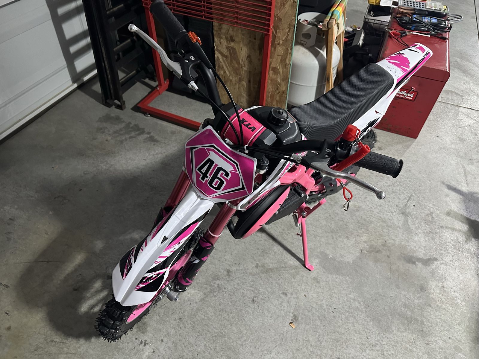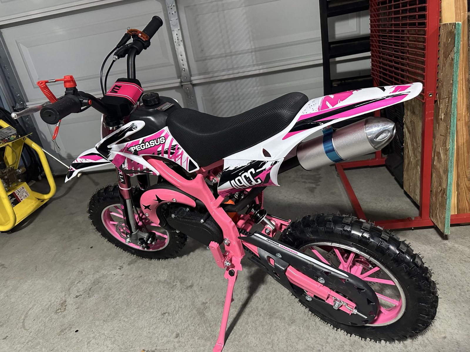 ApplePayFor sale a kids dirt bike equipped with a 49cc engine 2 strokes, pull start, disc brakes, front and rear shocks multiple shutoff switches max load 132 pounds speeds up to 30 mph controlled.