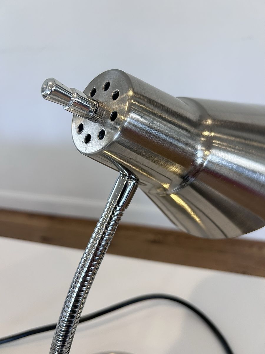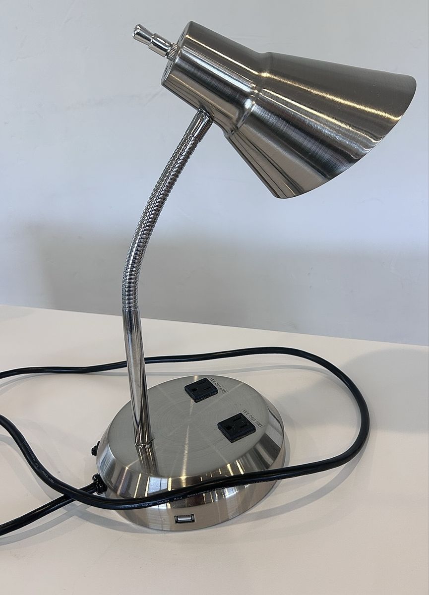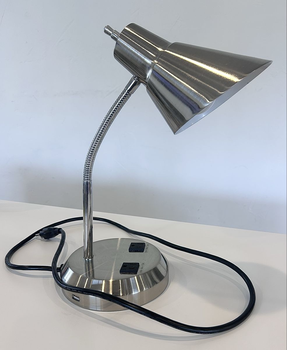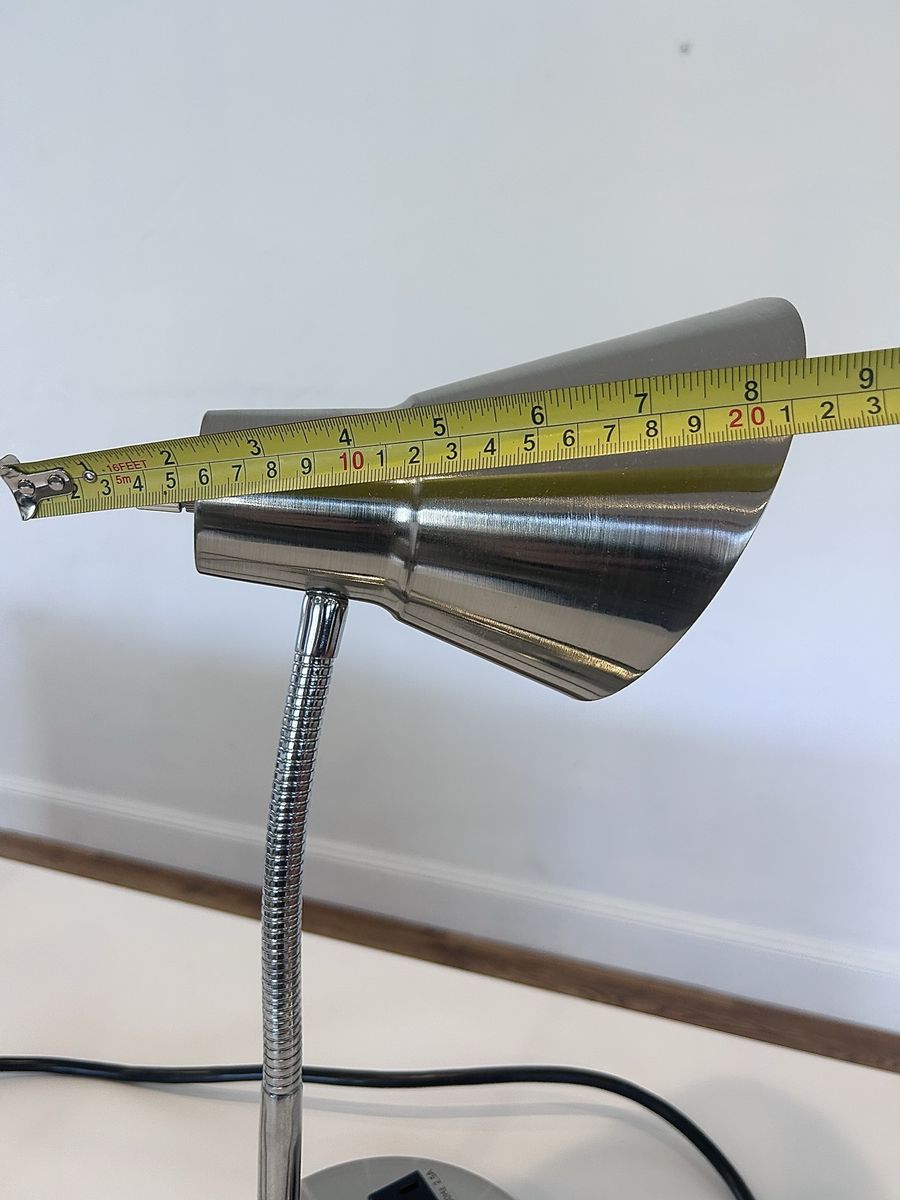 ZelleThe Modern Office Lamp is a sleek and stylish desk lamp designed for a home office or study space. With a silver metallic finish and adjustable features, this lamp is both functional and modern. The lamp is powered by a wall plug-in and made of chrome and metal materials, making it sturdy and durable. The cone-shaped shade and compact dimensions of 9” in length, 16.5” in height, and 9” in width make it a versatile and convenient lighting solution for any workspace. Made in China, this lamp weighs 5 lbs and exudes a contemporary design perfect for any home or office setting.