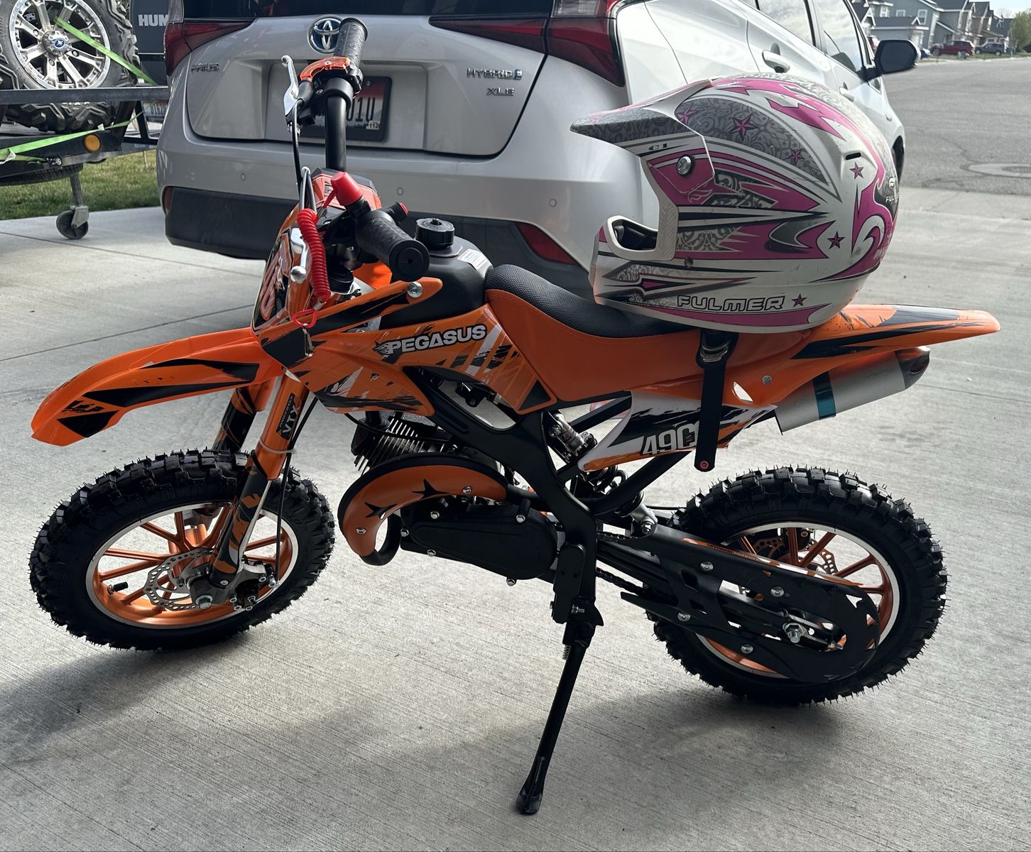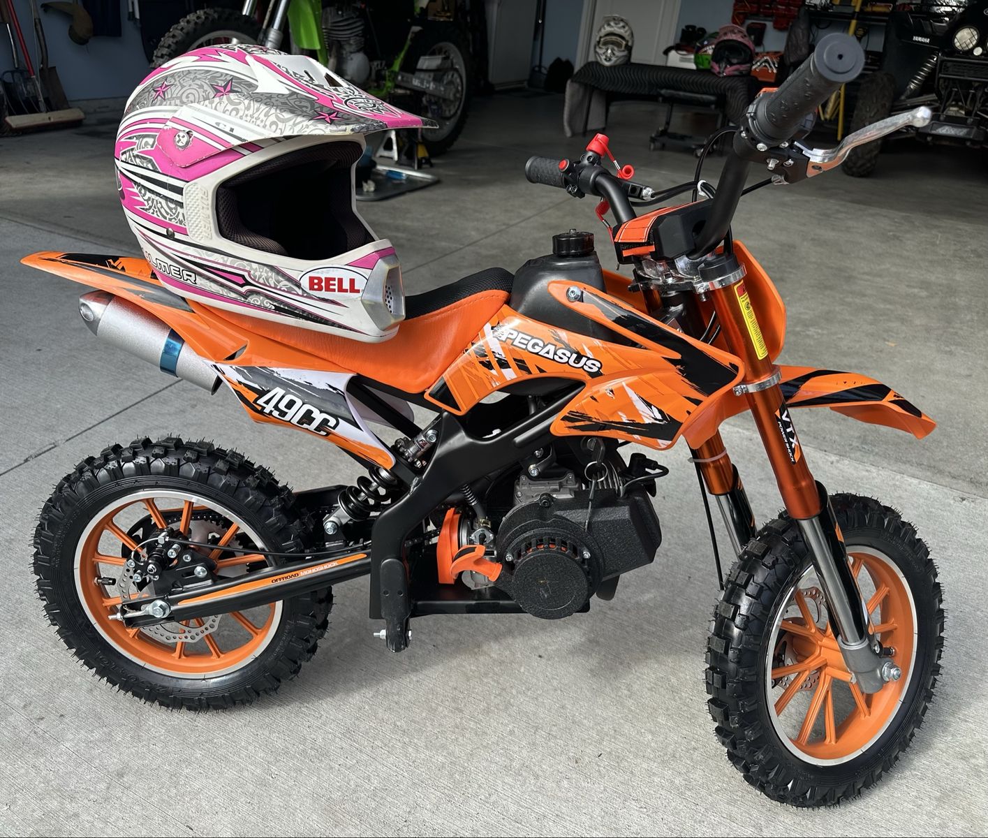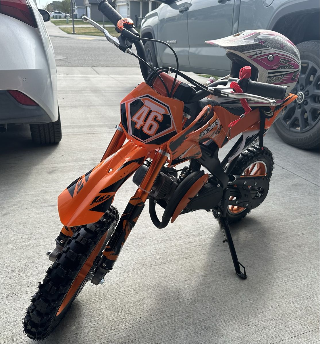 ApplePayFor sale a kids dirt bike equipped with a 49cc engine 2 strokes, pull start, disc brakes, front and rear shocks multiple shutoff switches max load 132 pounds speeds up to 30 mph controlled.