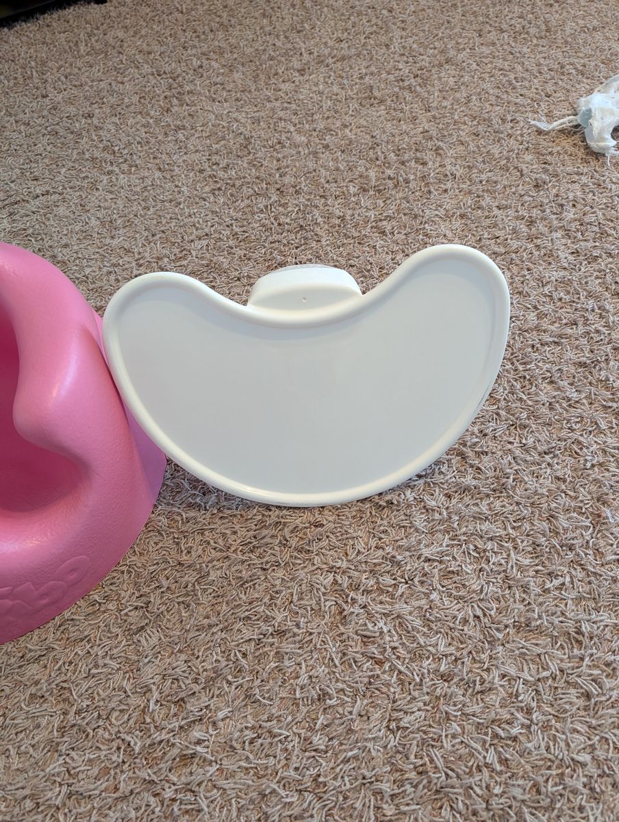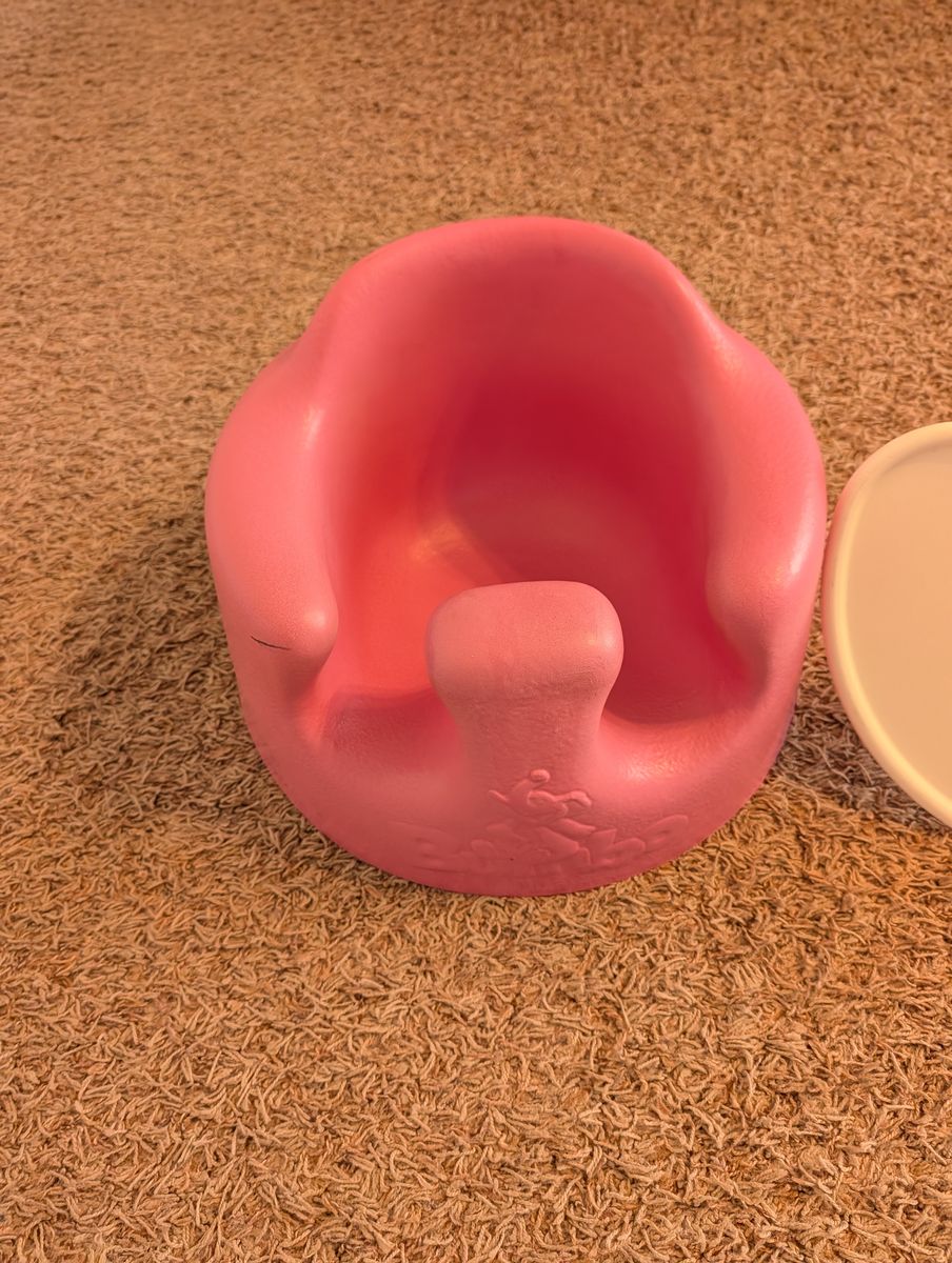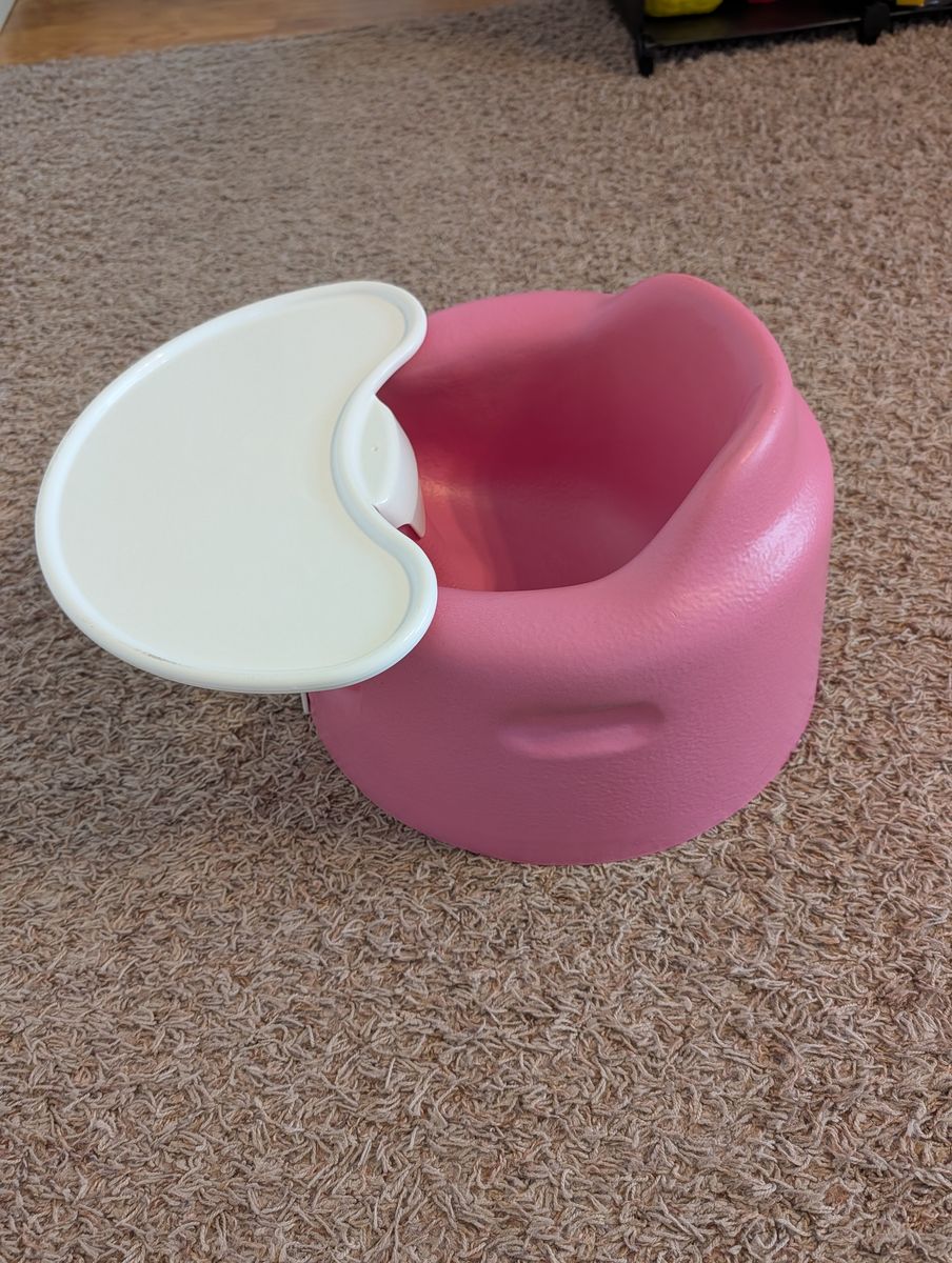 ZellePink Bumbo seat with tray. Helpful for little ones learning to sit up. Has a detachable white food tray. Good for feeding or playtime.