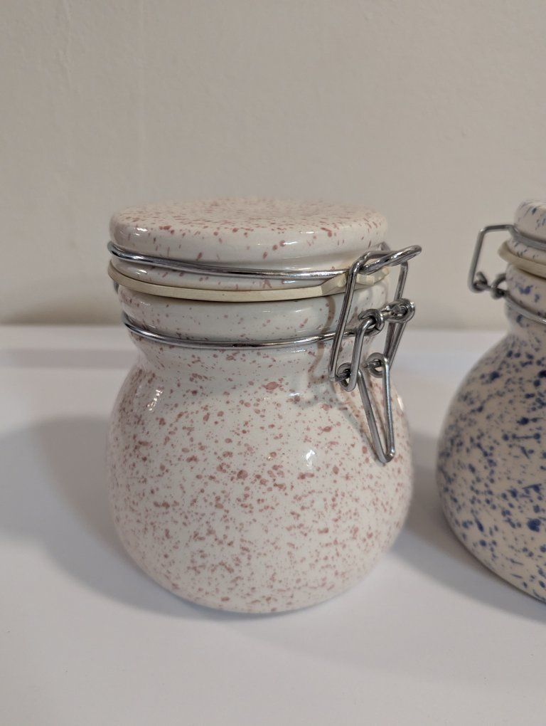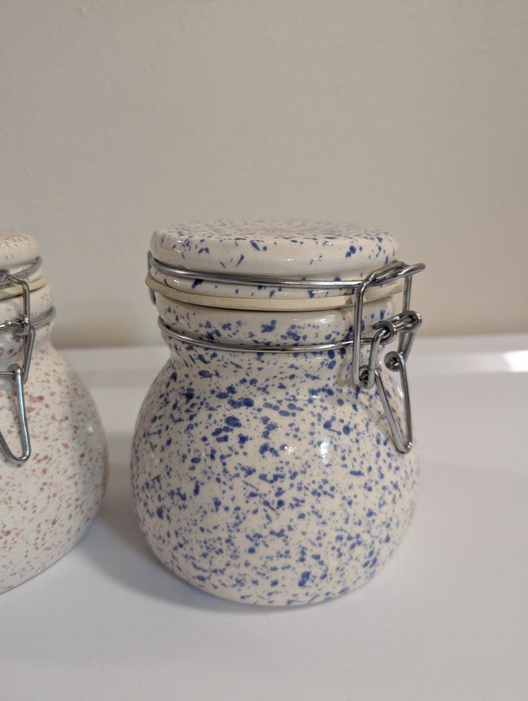 Venmothese two ceramic canisters open and close with seals. They measure 5 1/2" tall and 5" wide selling as a set