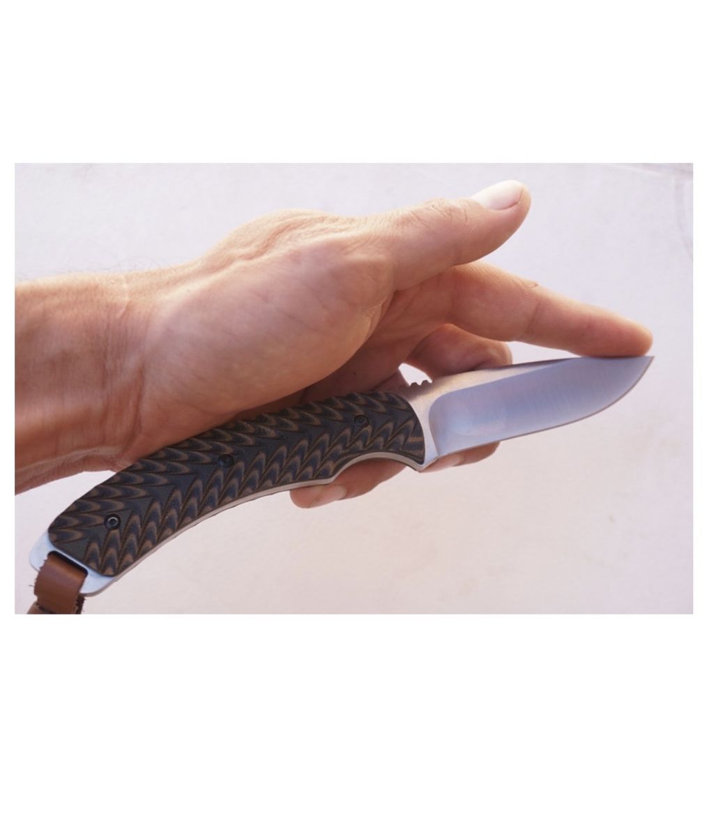 Good knife for field dressing large game. Steel grade: 440 stainless- excellent edge retention, very good corrosion resistance. Beautiful, aggressively contoured scales for good grip when bloody. Correct profile and contour for working inside an animal and unzippering the hide.\