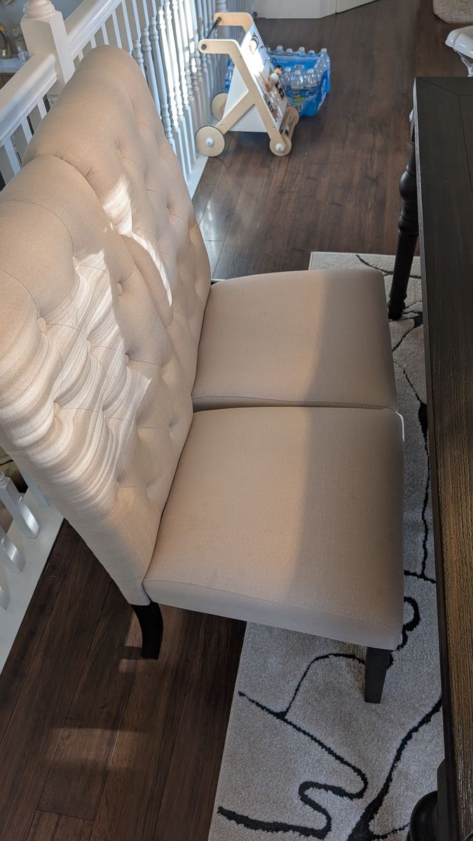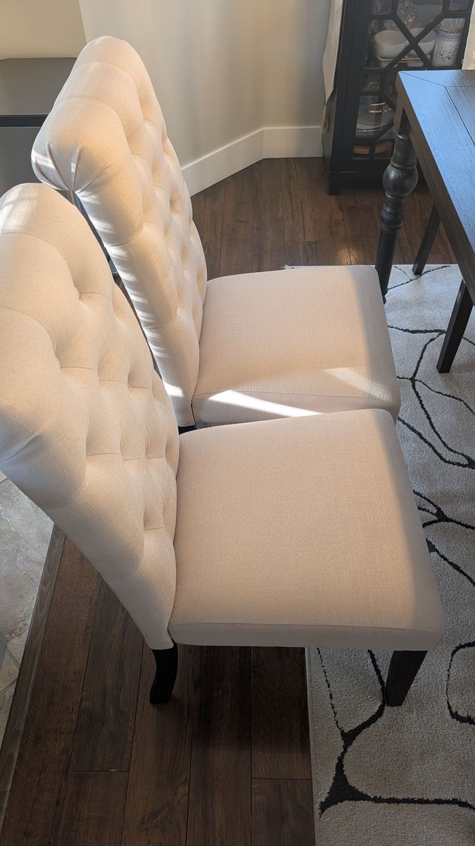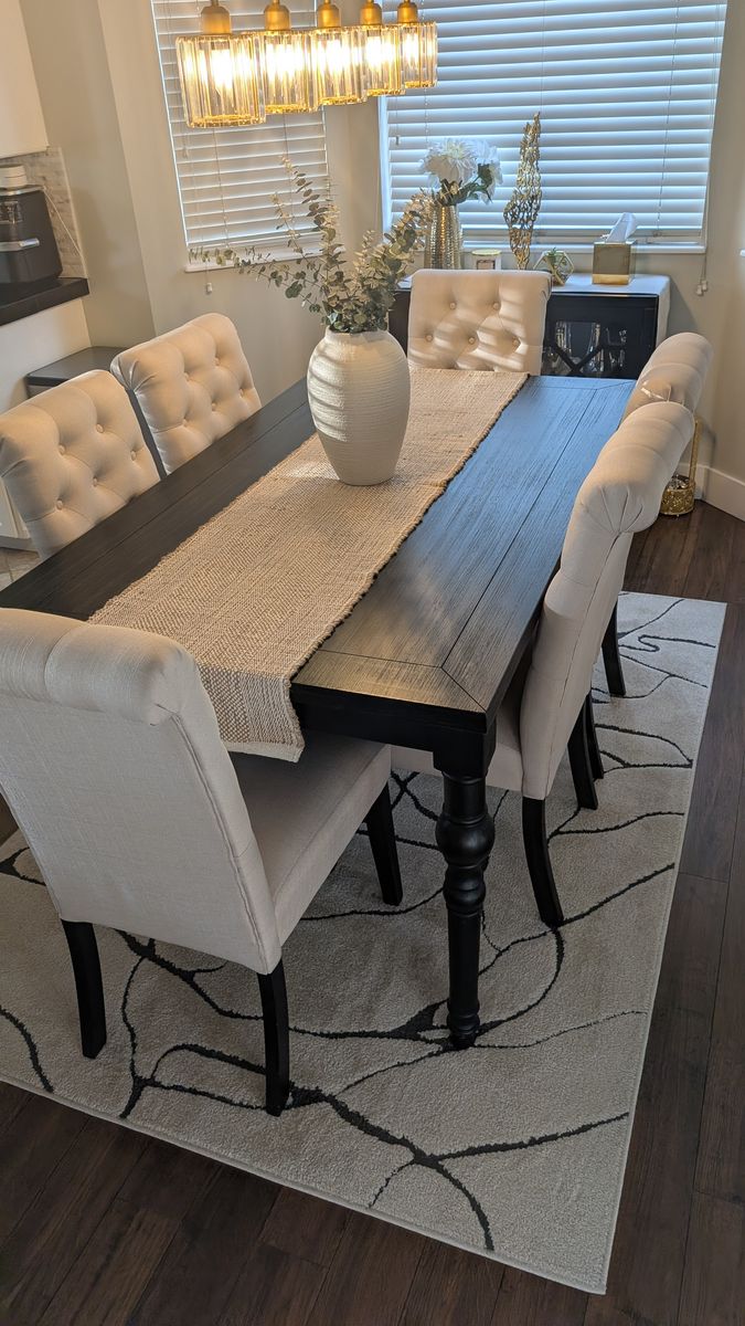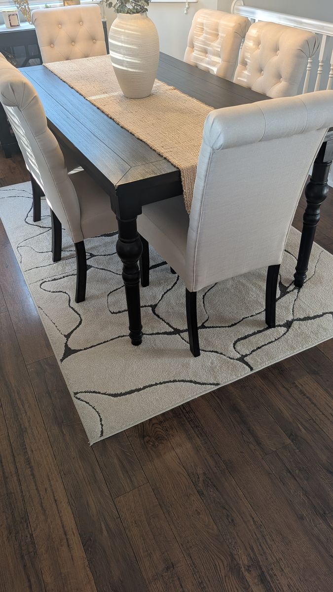ZelleSet was purchased new and rarely used and upkept well. Set is approximately 1 year old and is like new. Set includes hardwood table - 6 chairs that are completely stain and wear free (like new). Includes a marble carpet as well. We are a pet less household so you won't find any pet marks or damage as no pets have ever been in our house.