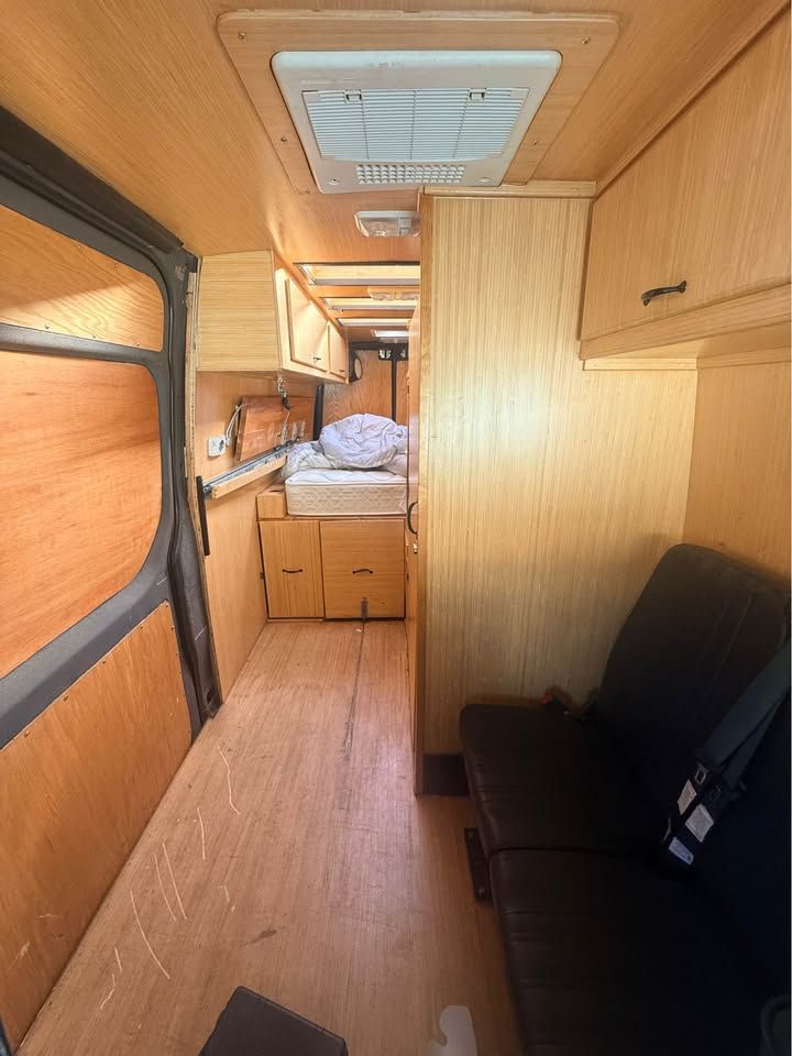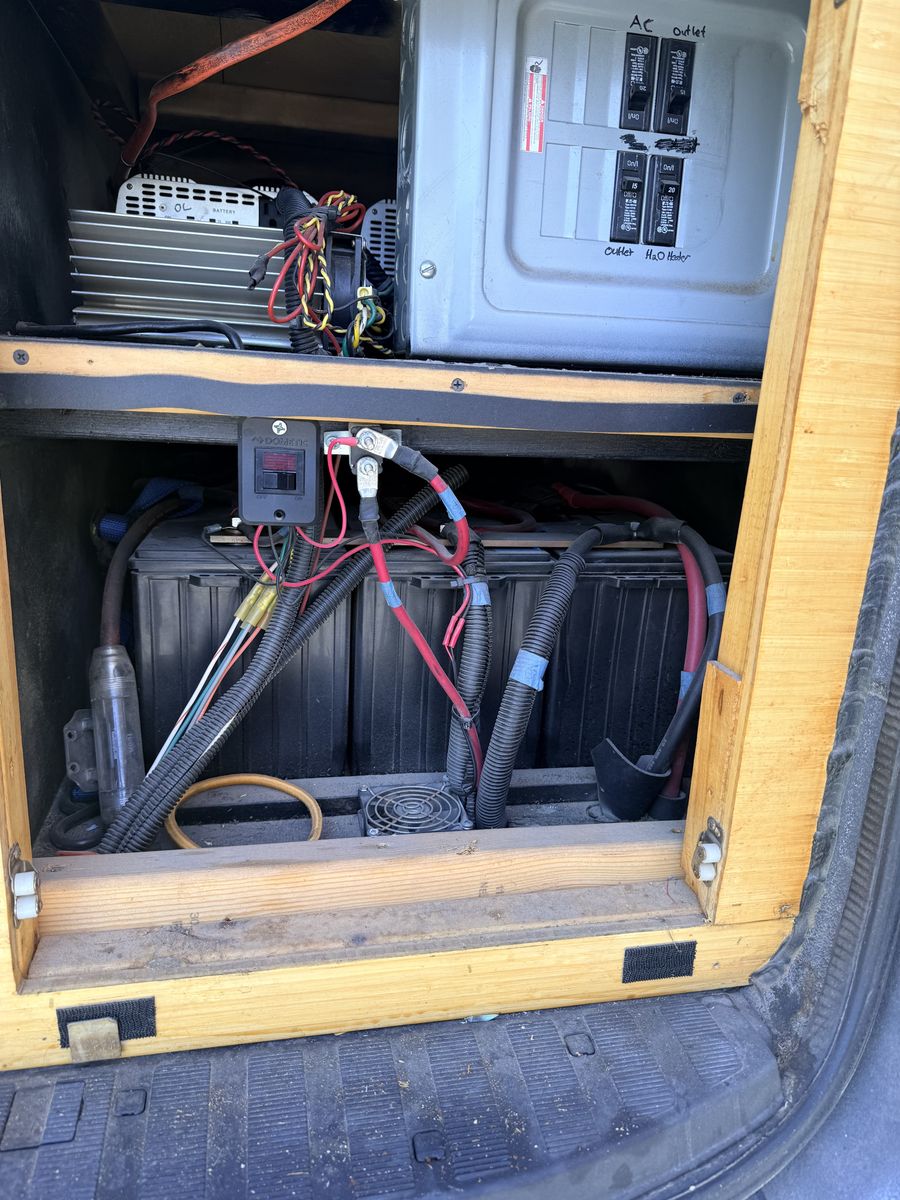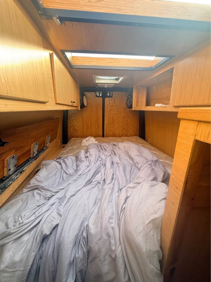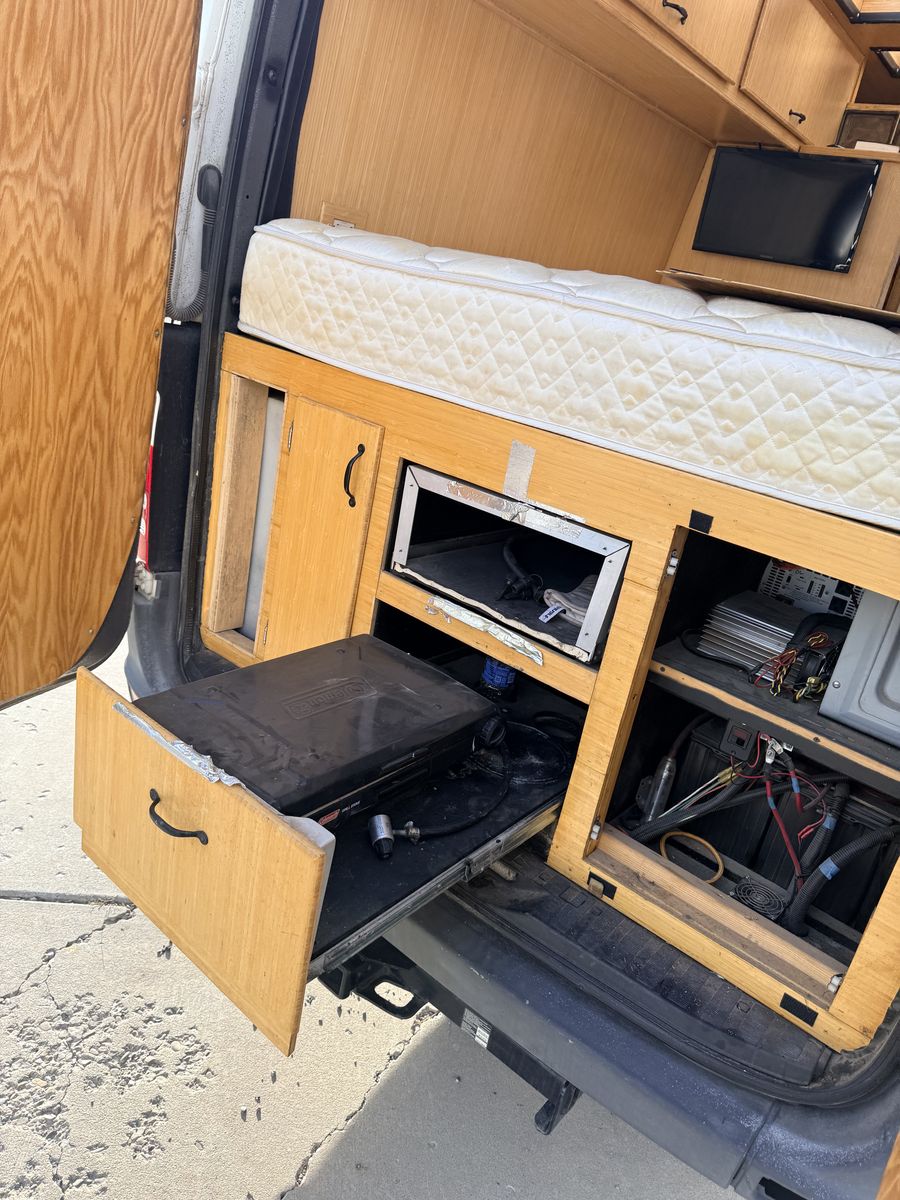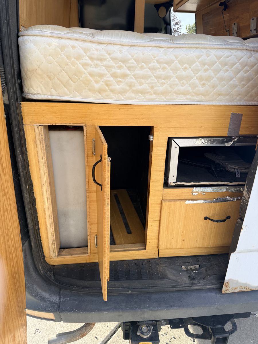 Built out camper, dually Mercedes diesel sprinter van, I don't know much about this, as I am selling it for my mother in law who had a change of plans. It was just driven up from Vegas last month, and seems to run great. I did a little looking around, and found that it has what looks like a generator mounted underneath, and 6 batteries wired up to several large inverters under the bed, it is wired with outlets throughout the van, and breakers all wired up. It has a large dometic A/C on the roof, and what looks like a water storage tank, and a waste water tank, the wiring looks like it was done well, but some of the wood work needs some love, it also has a slide out camp oven, and removable little table. If you have specific questions or want more pictures feel free to ask, but for someone wanting a head start on what could be a great camper van, this would make a fun project. Clean Title in hand. Text is best, or leave a message and I will call you back.