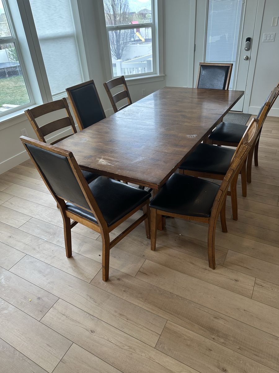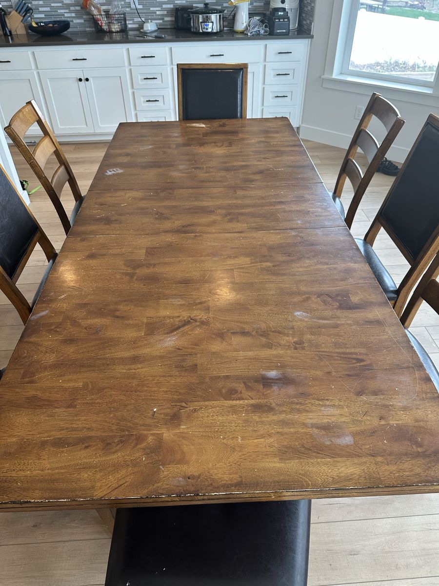 ZelleBeautiful kitchen table and 8 chairs. The chairs are all padded and in great condition. The table has some scratches on it. It has a center piece that can be removed to shorten it if desired. Dimensions: 7’(l)x 36”(w) x 30”(h) Priced to sell. Must go quickly.