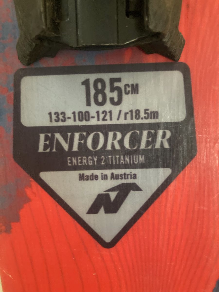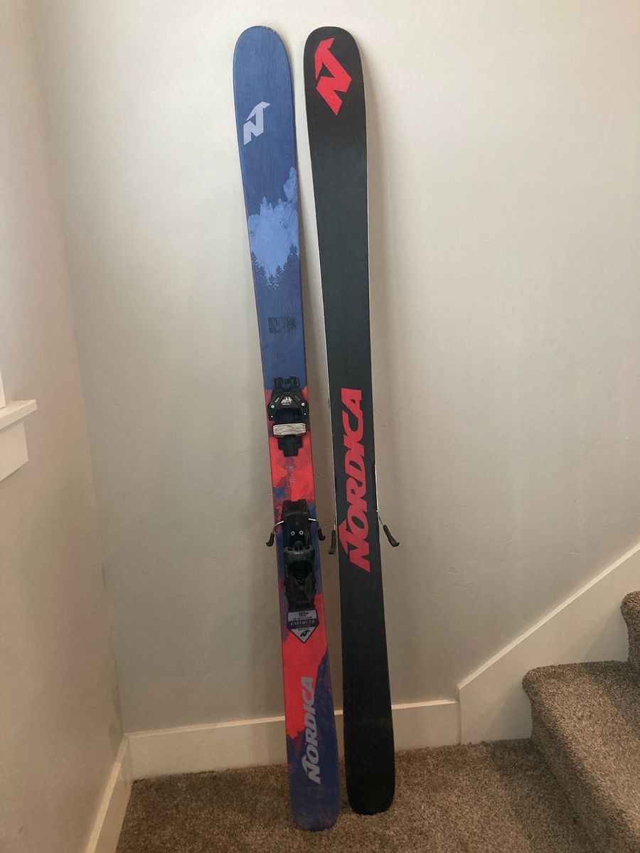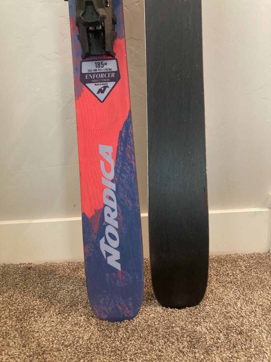 VenmoDurable Nordica Enforcer 100 all-mountain skis in size 185cm. Skis have a blue and red mountain graphic on top with black and red bases. Pair comes with adjustable black bindings already mounted.