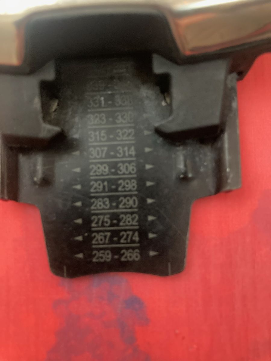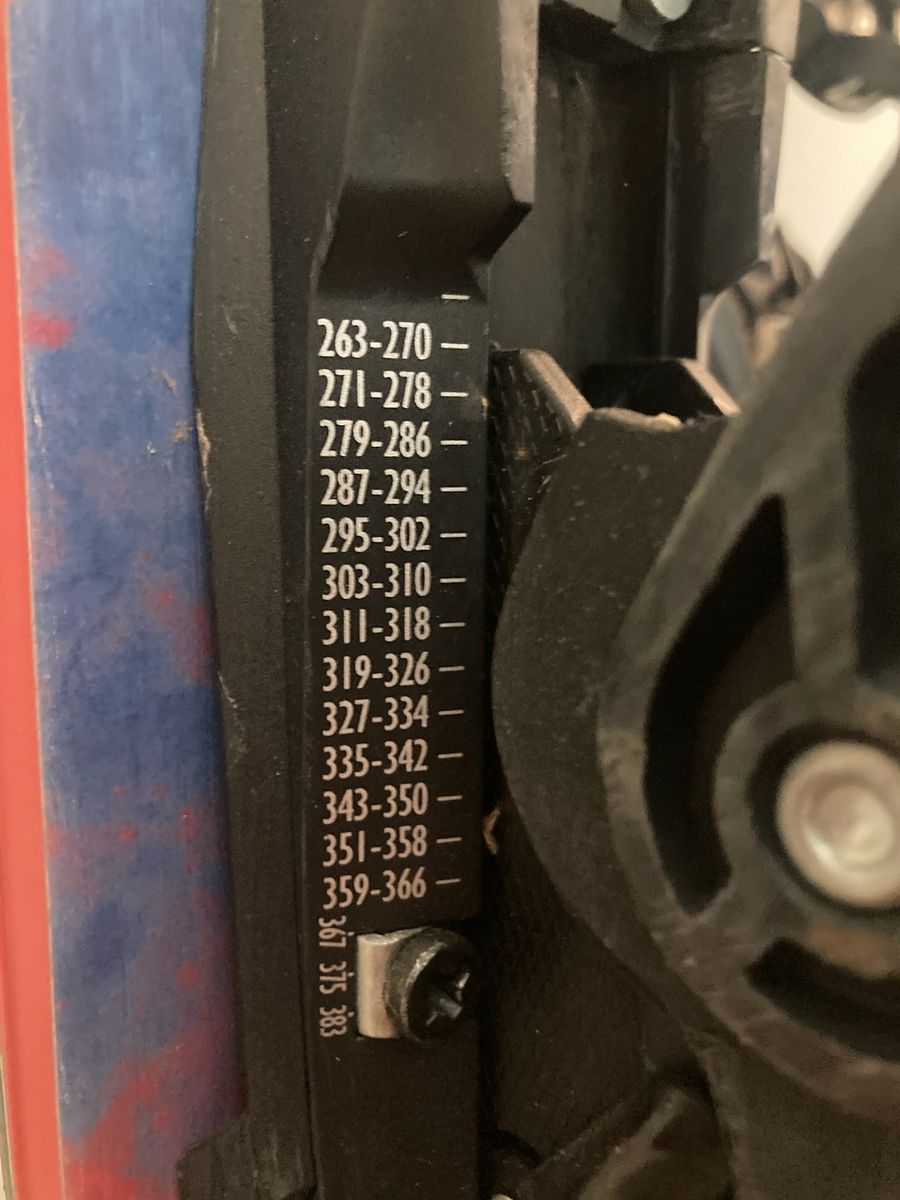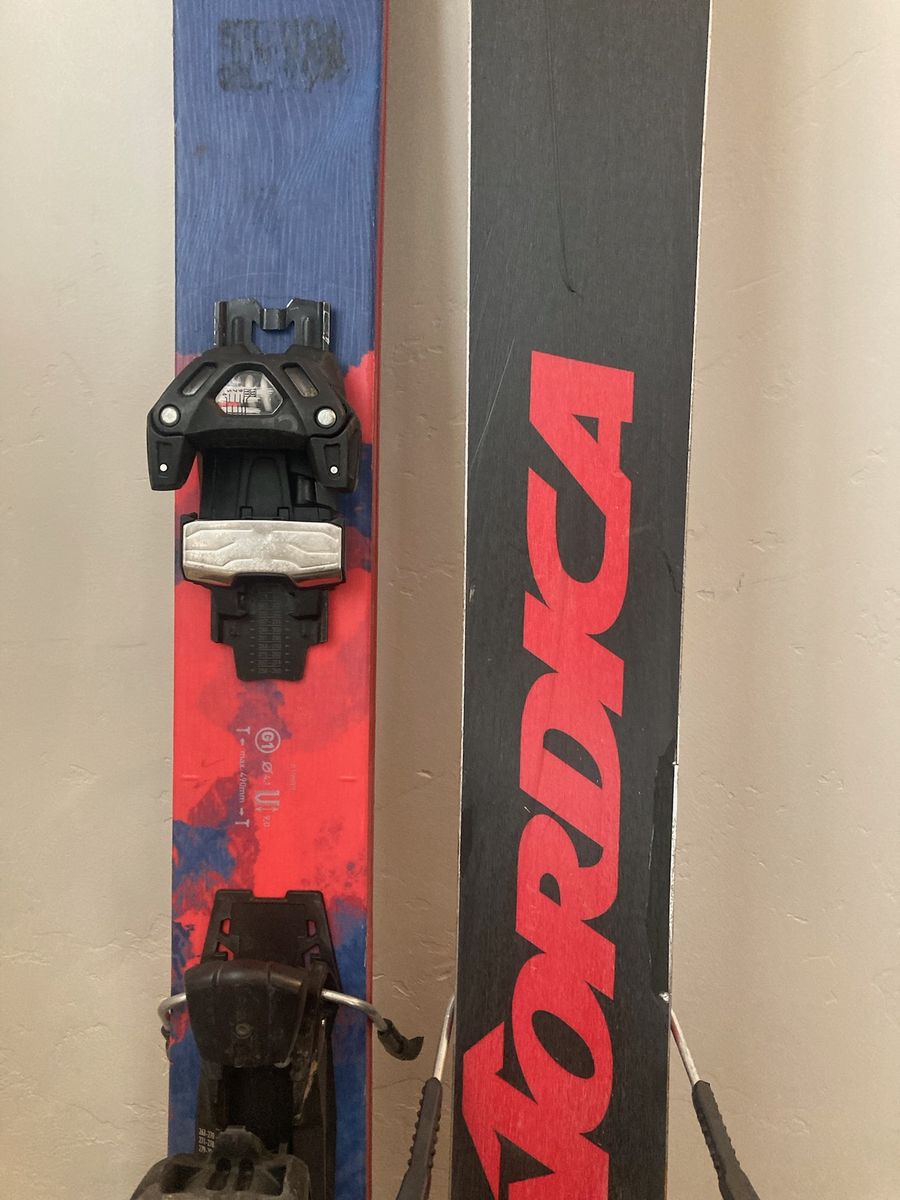 VenmoDurable Nordica Enforcer 100 all-mountain skis in size 185cm. Skis have a blue and red mountain graphic on top with black and red bases. Pair comes with adjustable black bindings already mounted.