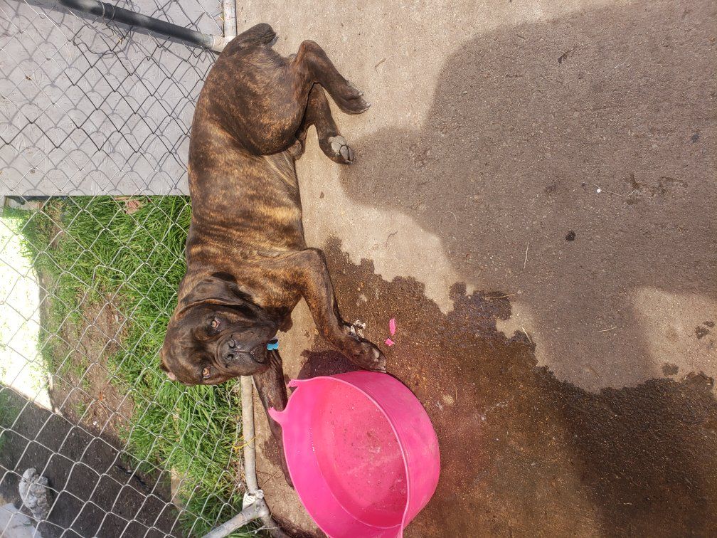 Born May 25th 2025 I have one pup left out of my litter of 12 French Mastiff, Cane Corso mix. he knows sit, shake, he's house trained he's got a great temperament has all his shots. he is intact. call with any questions