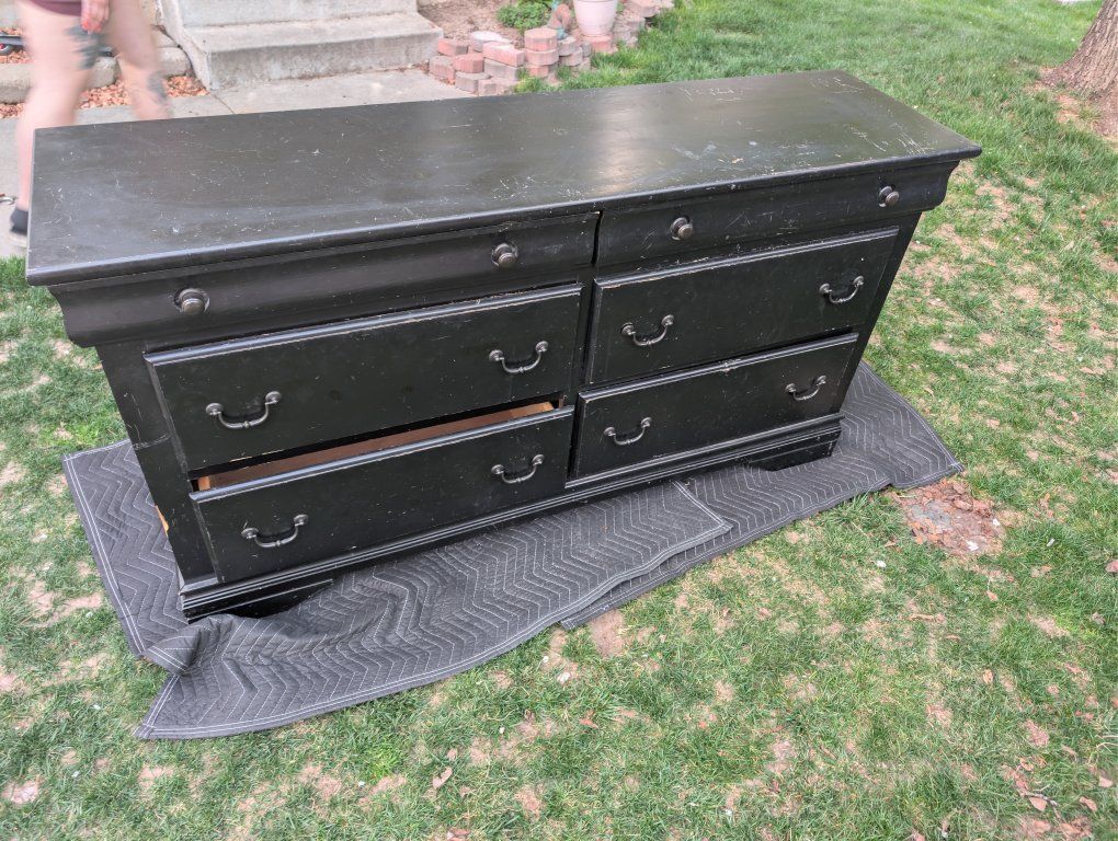 VenmoUsed, and has wear was going to fix it up when i bought it from the last person but never got around to doing it. It's a fairly heavy duty dresser. a Needs a new slide on one drawer, and others possibly tighten up. 64 wide 34 high and depth of 18
