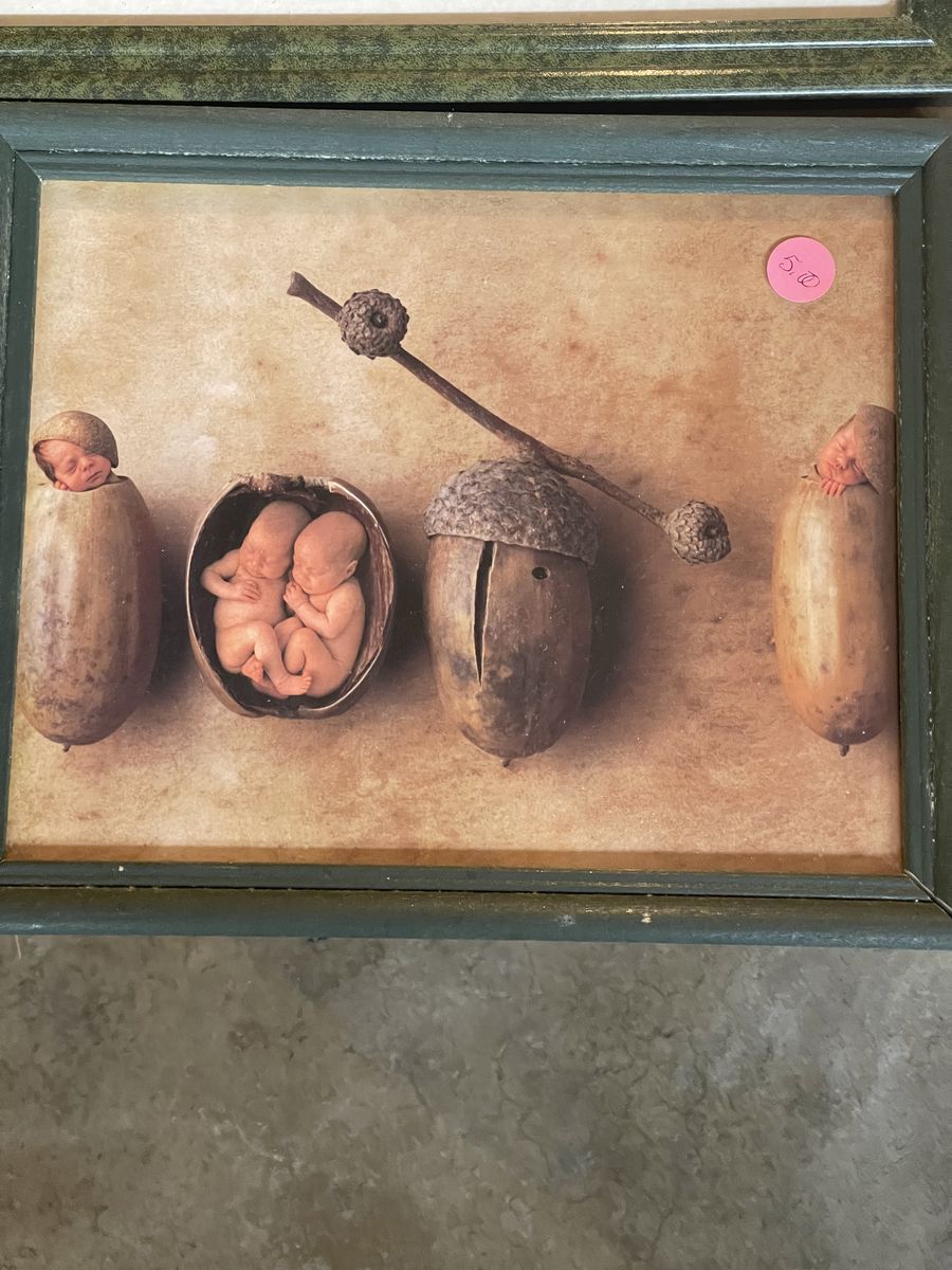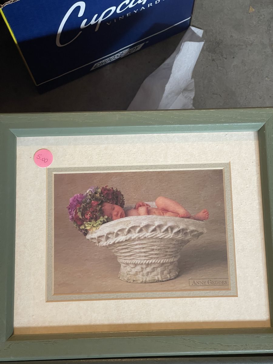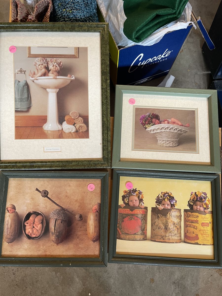 I have various items here for sale. The sea shell picture is an excellent shape it 21 1/2 x 33 1/2 $20 The Oak Westminster clock chimes on the hour it works with batteries. It’s about 18 inches tall. $30 Large, brown metal decorative peace is 24” in diameter. $15 Watham oval quartz clock is 11 1/2” x 9 1/2” $5 Anne Getty‘s baby pictures 8 x 11 $5 and the larger one is $9 My greatest blessings, magnetic picture holder is new still has the plastic on it $15 Small ceramic picture with the pink trim $5 Glass decorative dish with lid $8 Solid glass, decorative bird dish $8
