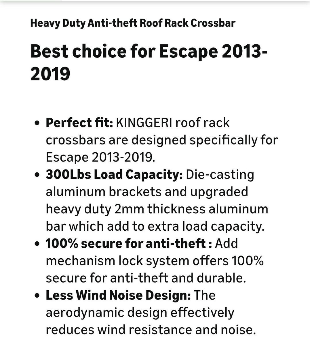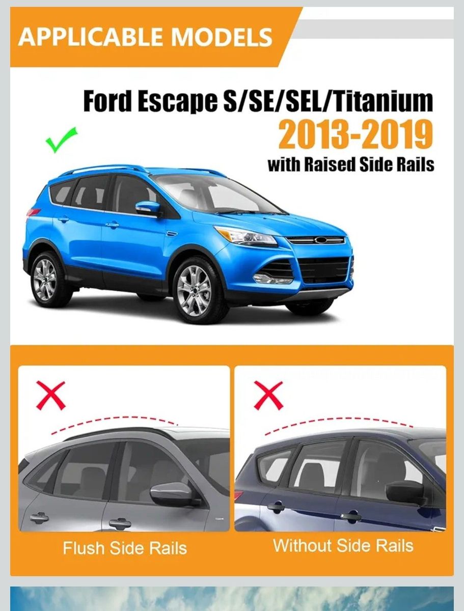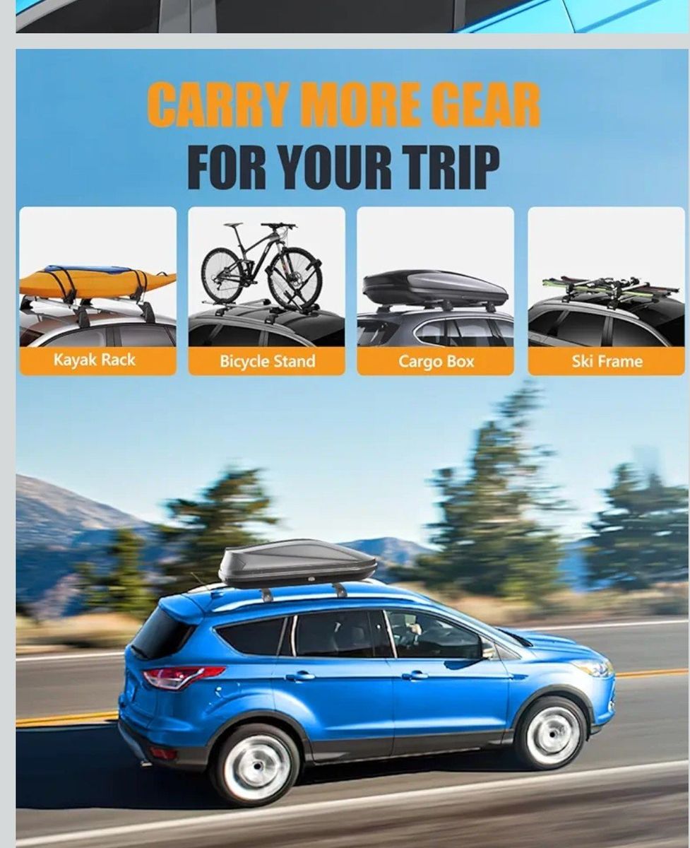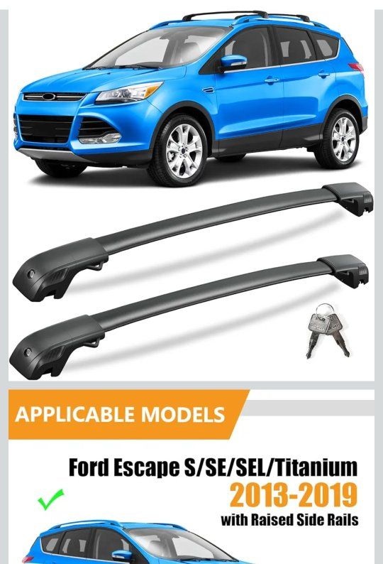 Venmokingger # 2-A88-2-16 roof rack cross bars with raised rails for Ford Escape S/SE/SEL/Titanium, anti-theft design, black matte powder coated, 300 lbs max load, lockable, heavy duty, material cast- aluminum, the four brackets of the kingger roof luggage rack crossbar are all designed with the tie down loops, this design allows you to easily secure items to the roof of your car, brand new, $ 60, send me a message if you are interested I'm located in West Valley City