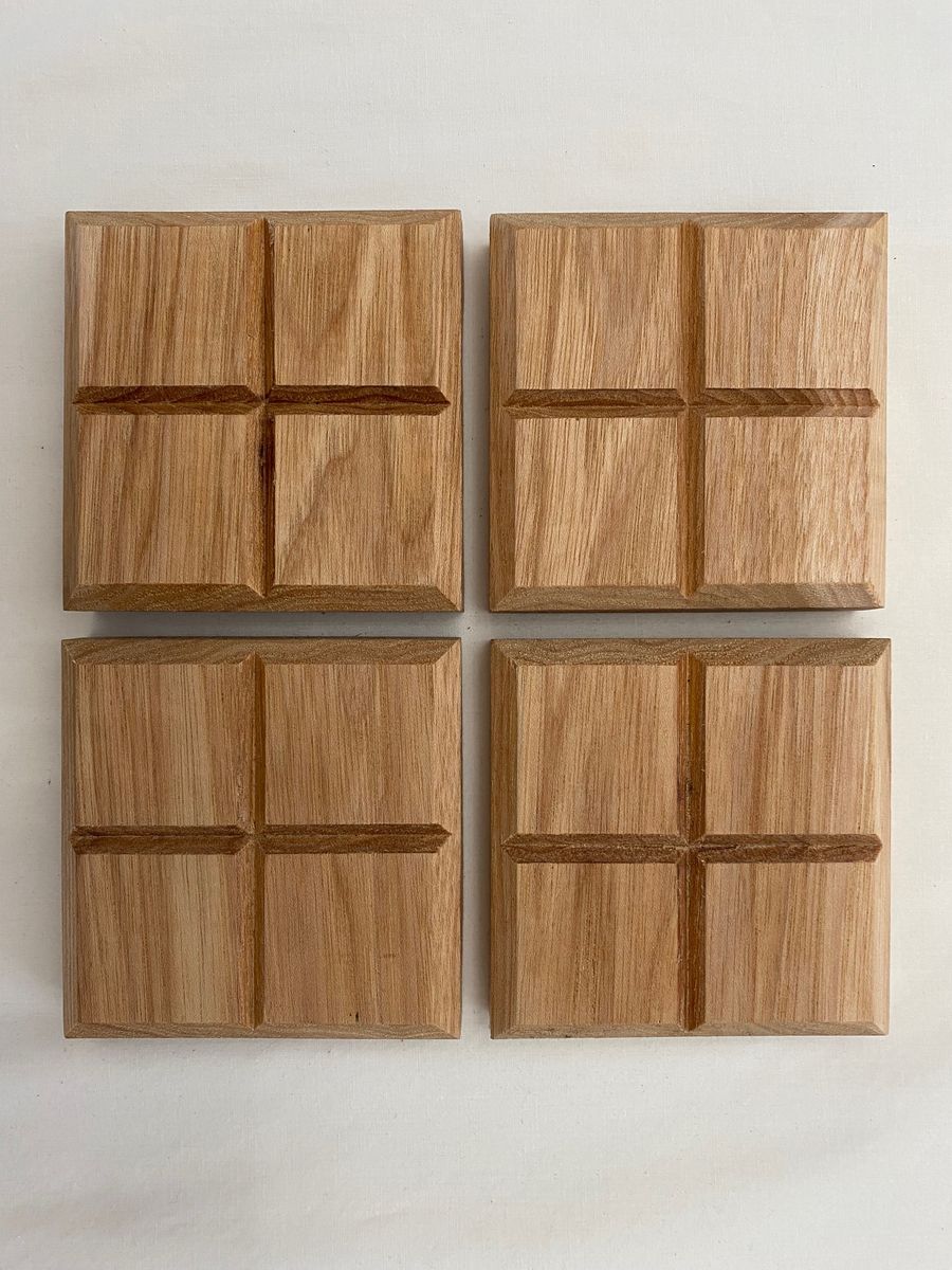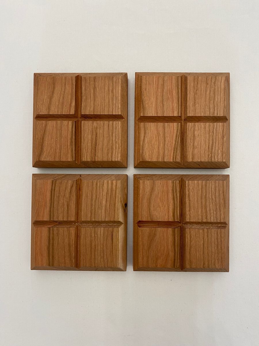 Dimensions • 3.75" square x 0.75" Thick • 3.5" square x 0.75" Thick • 3.0" square x 0.75" Thick • Available in a 4-pack • Made from solid hardwood in your choice of Walnut, Cherry, Hickory, Red Oak or White Oak • Oiled using food-grade butcher block conditioner, which is safe and easy to maintain • Made in Syracuse UT