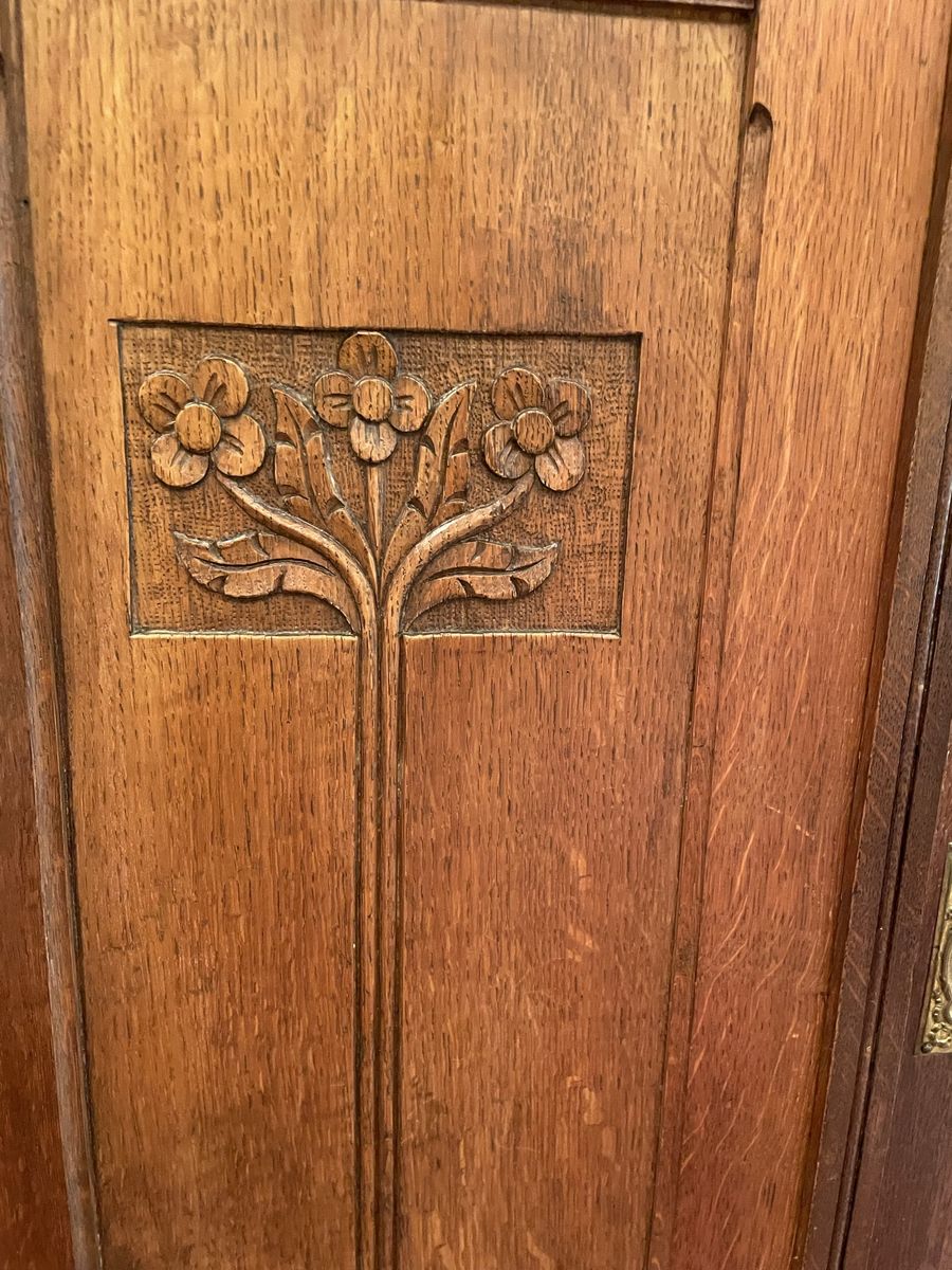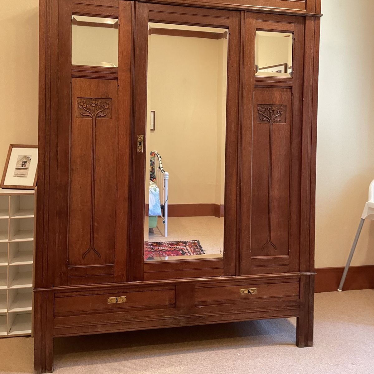 ApplePayAntique English oak Arts and Crafts/Mission armoire. Central mirrored door, beautiful decorative carvings, two drawers with keys. Circa 1910. Measures 80” high x 4’10” wide x 23” deep. $1899. Venmo or cash only.