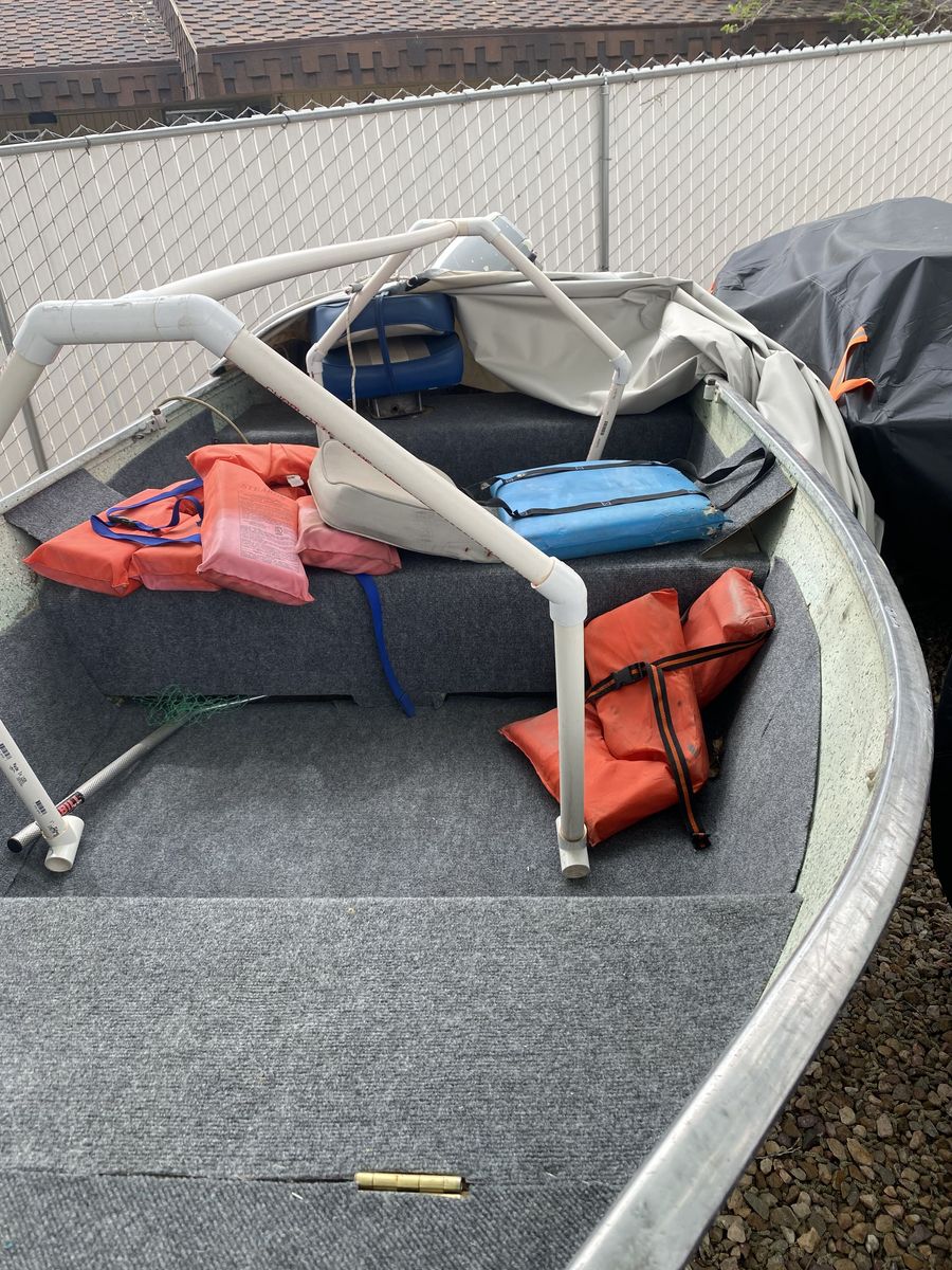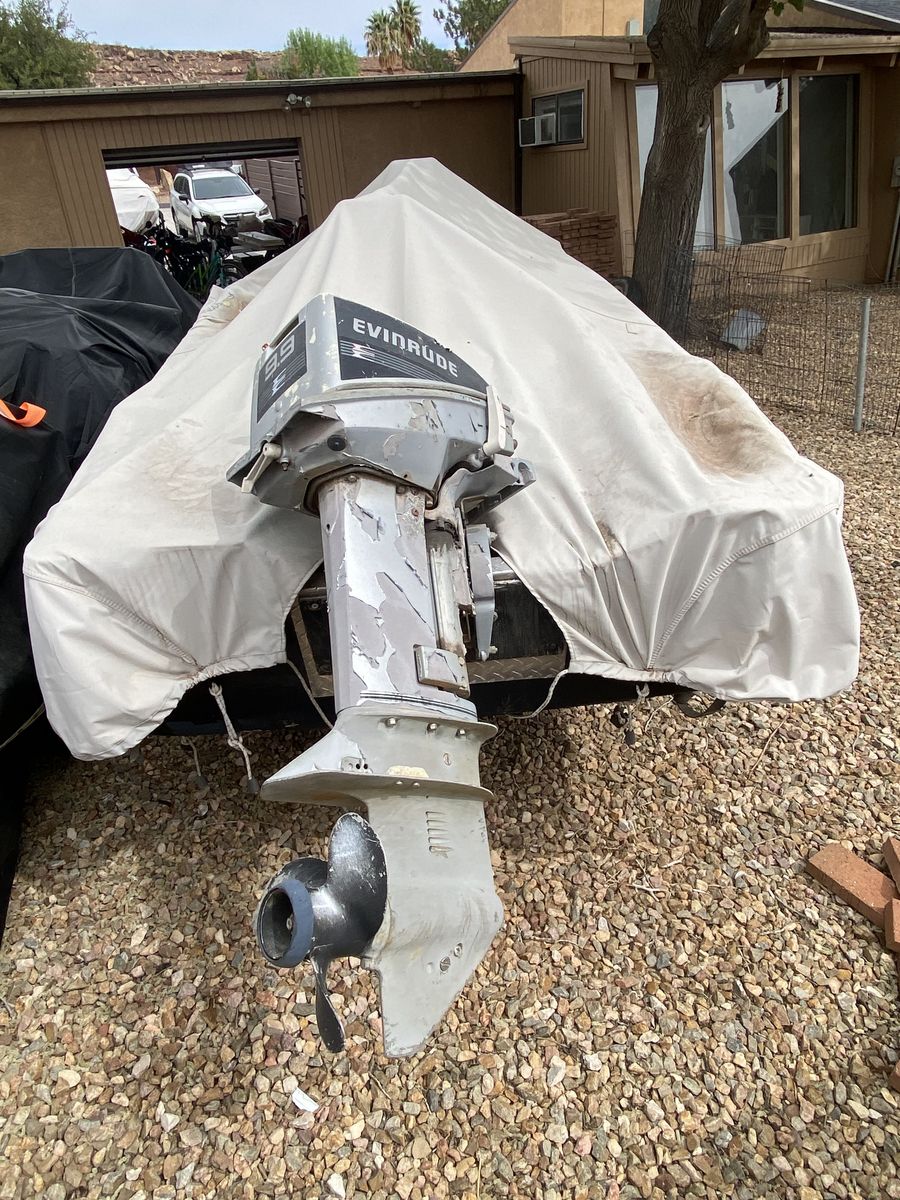 12 foot Fishing boat with 9 hp Evinrude outboard. I bought this boat about 5 years ago. A couple years ago I put the new cover on it. The impeller was changed 2 years ago. We also re-upholstered the inside. Clean little boat. Has a newer gas tank. I have not started the motor in 2 years. We have a ski boat and a pontoone boat. No time for this. It may need tires. All around great boat for the price. Great boat for trolling. This boat is good for 3 adults.