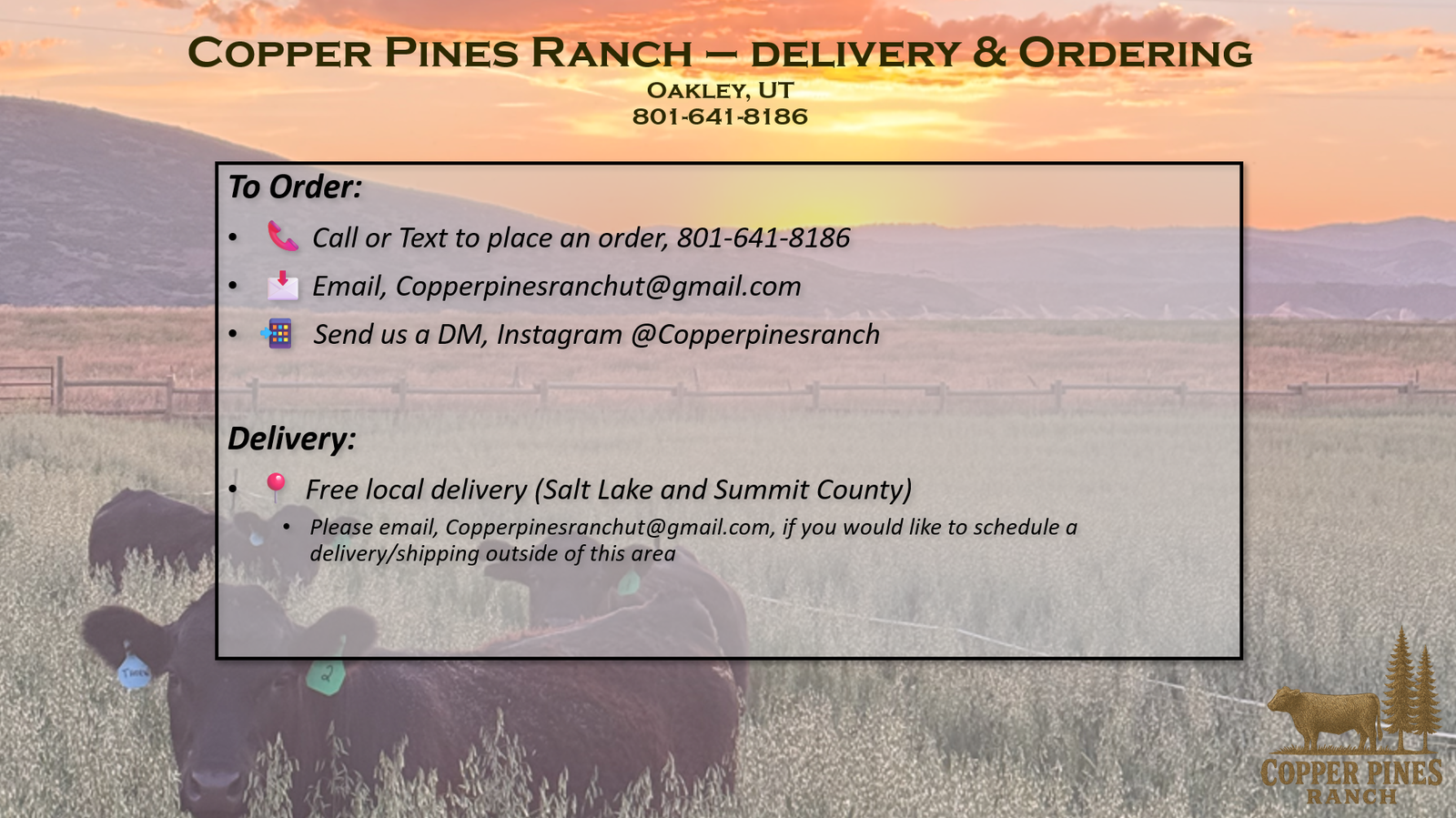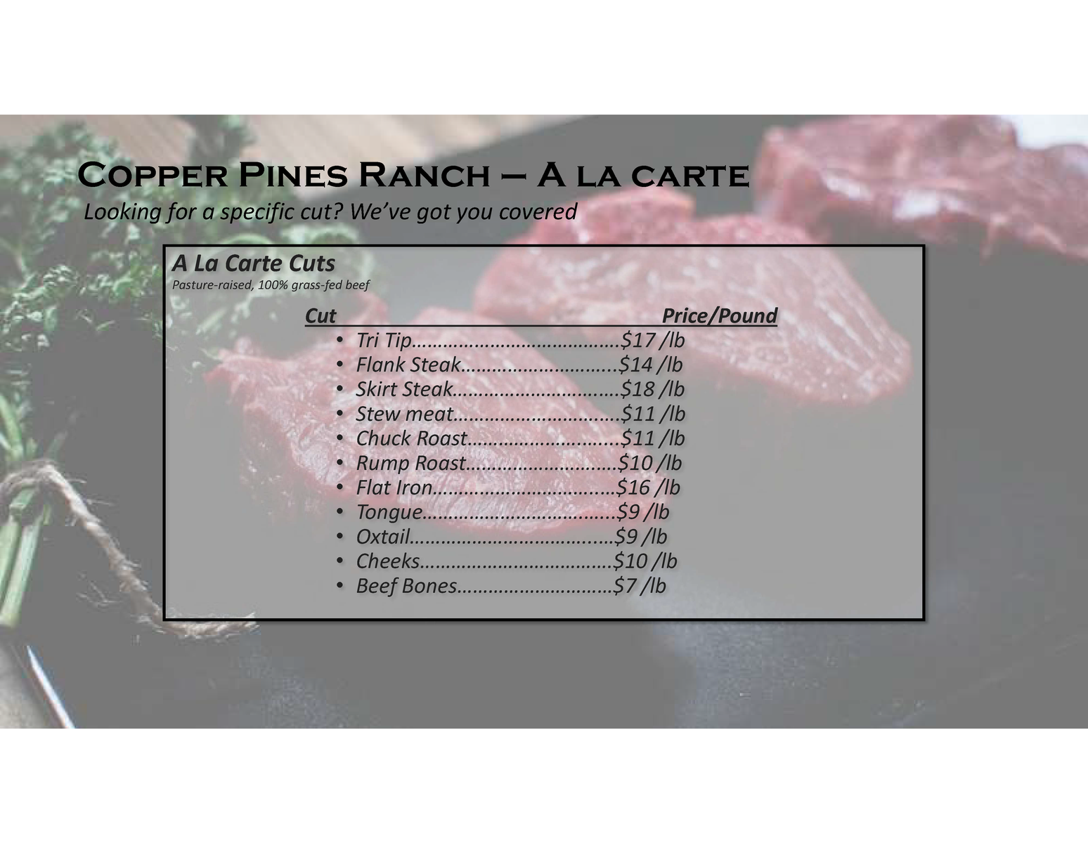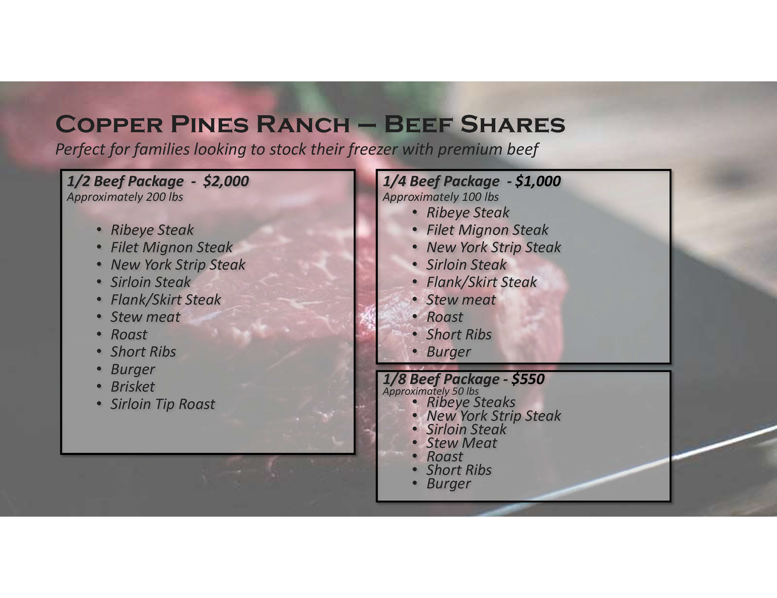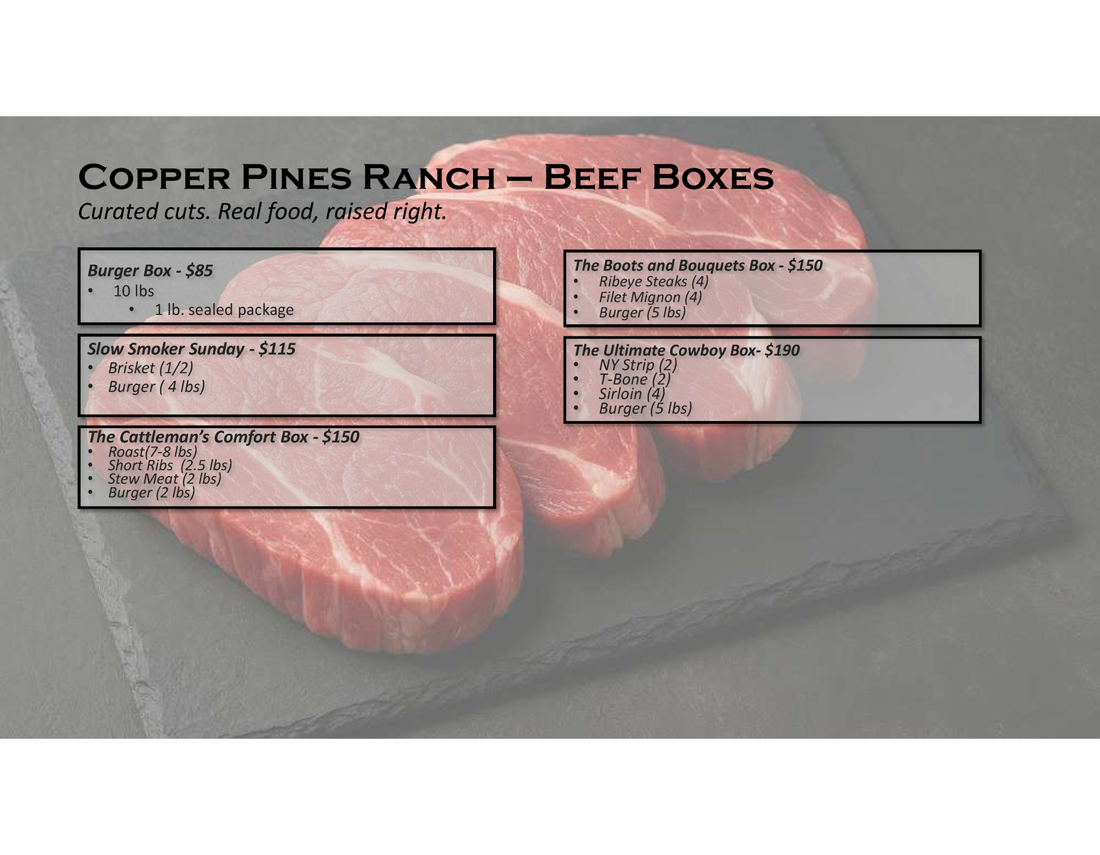 Venmo100% Grass-fed, grass-finished beef, raised naturally for better nutritioin and better living. The steers are born, raised, finished and processed in Utah. The beef is dry-aged for 14 days to bring out the tenderness and rich, natural flavor.