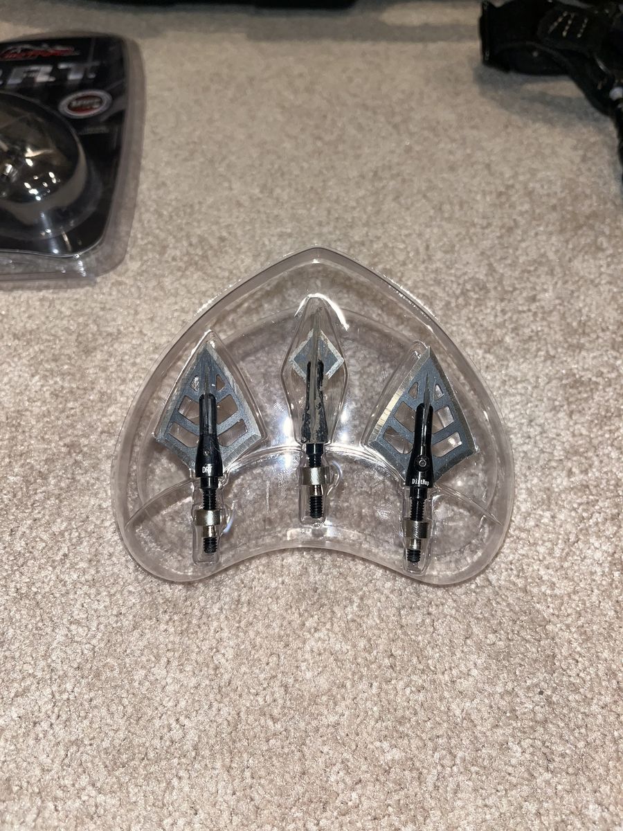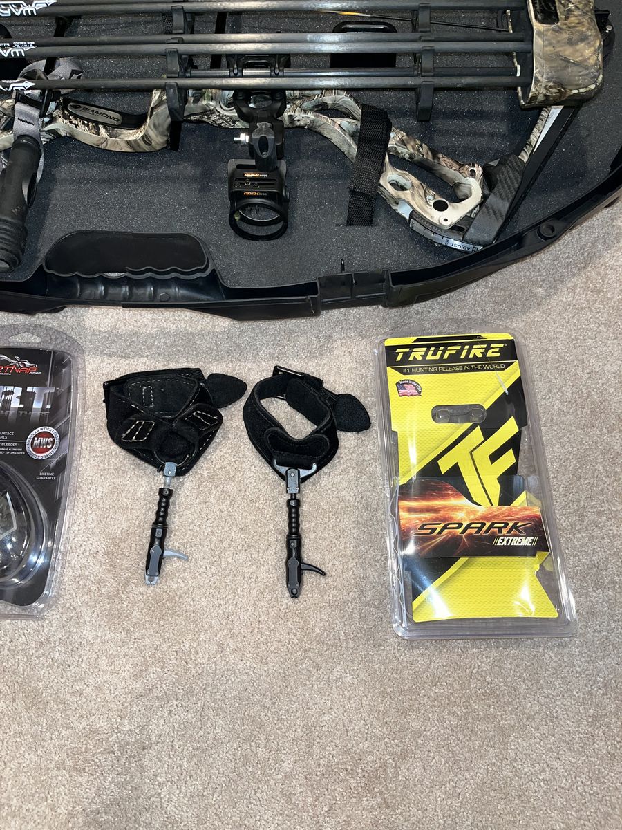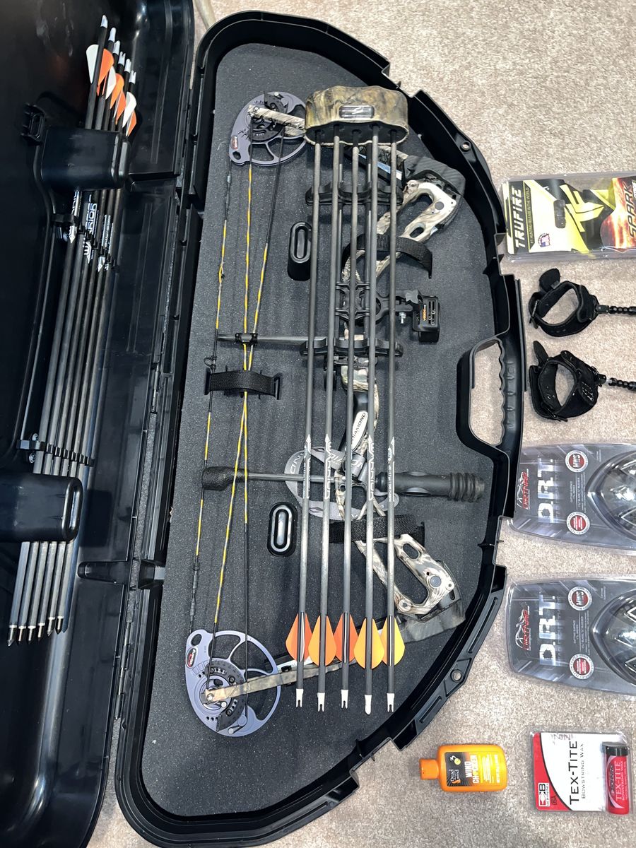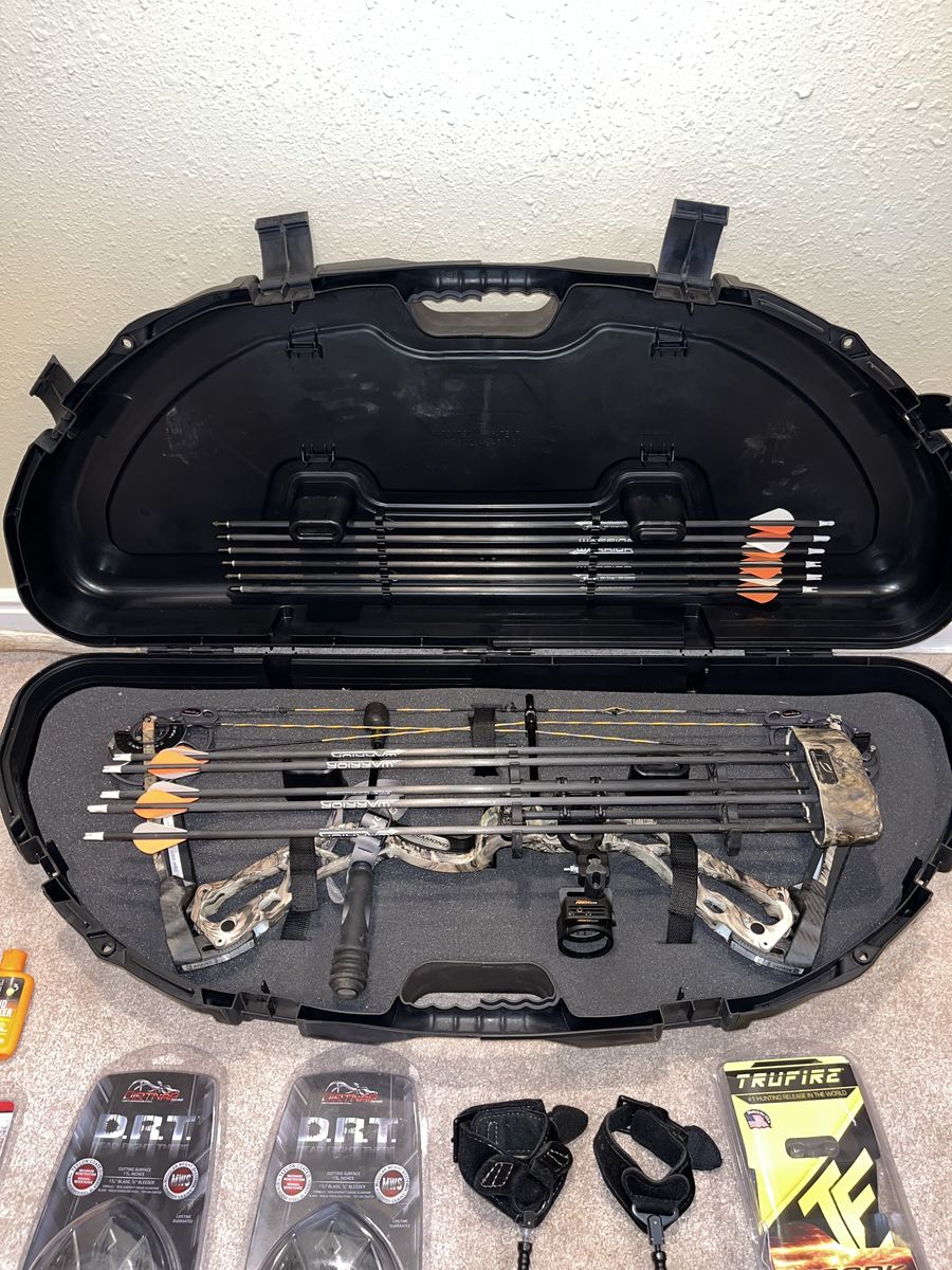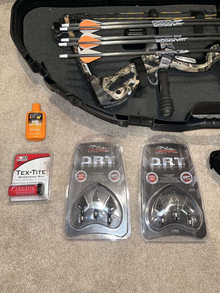 Comes with lots of extras: -Diamond Edge SB-1 bow -Tru-Fire Spark Extreme release -Tru-Fire release (back-up release, can’t remember exact model) -Dirt Nap DRT broadheads, 2 packs of 3. 2 broadheads have some damage, but these have a lifetime warranty and can be replaced. -11 Gold Tip Warrior Carbon arrows. 1 arrow has some damage to the tip and the plastic end, but the shaft is fine. Could be used as a replacement shaft if a different one is damaged. -Plano Protector hard bow case -Bow string wax -Wind Checker -Archery target (very used, but still works)