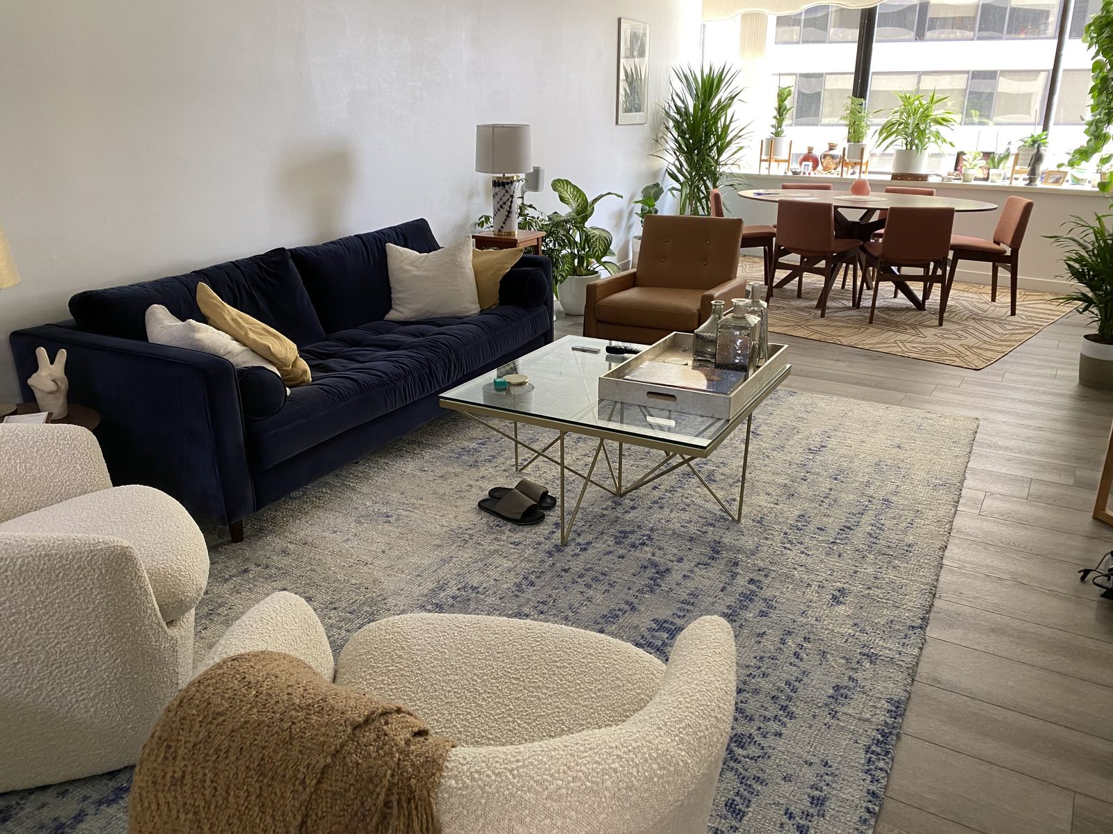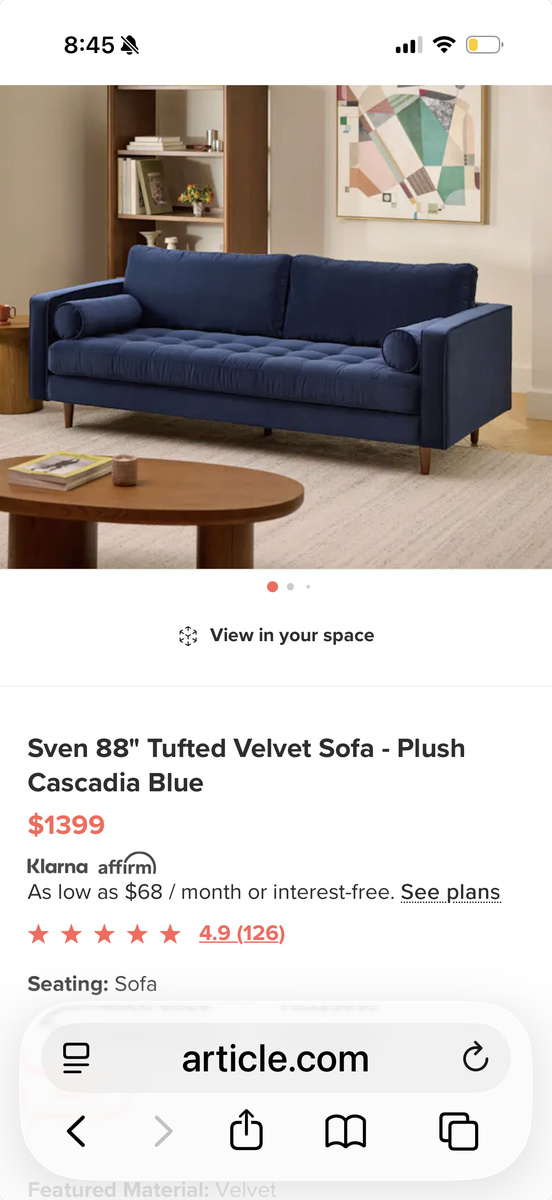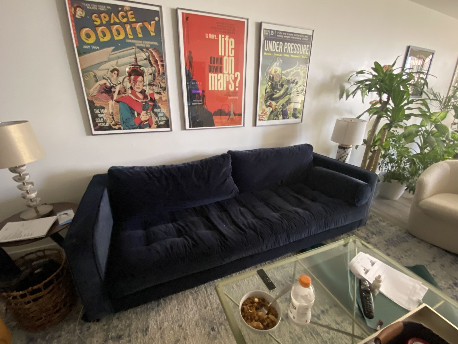 ApplePay88" x 38" this Article Sven mid century inspired beaut is only 4 years old, and couldn't fit down the stairs of my new abode. In excellent/very good shape overall, performance velvet really holds up. One side of base cushion has slight softening typical of normal use, but still comfortable and structurally solid. Stain free, pet free, smoke free/ It lists new at $1400, asking $750