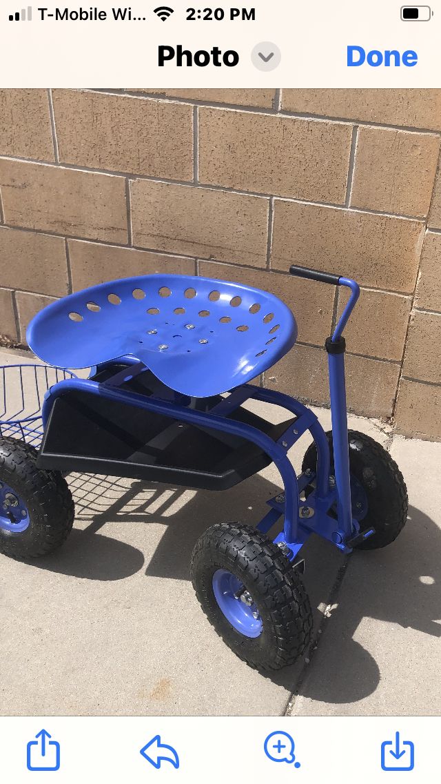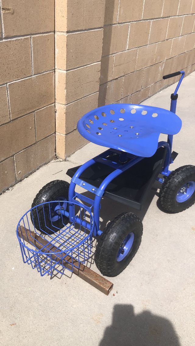Garden’s Tractor Scoot Back -Saving Tractor Scoot let’s you garden from a seated position virtually anywhere in your yard or garden. Use the extendable handle to pull the scoot behind you like a wagon. When retracted and locked in place, the handle serves as a sturdy hand hold. The swiveling tractor style seat has been lowered to give you better access when planting and harvesting. The hefty steel frame and pneumatic tires ensure a smooth, stable ride. New! And fully Assembled!! Color Blue! $60!!