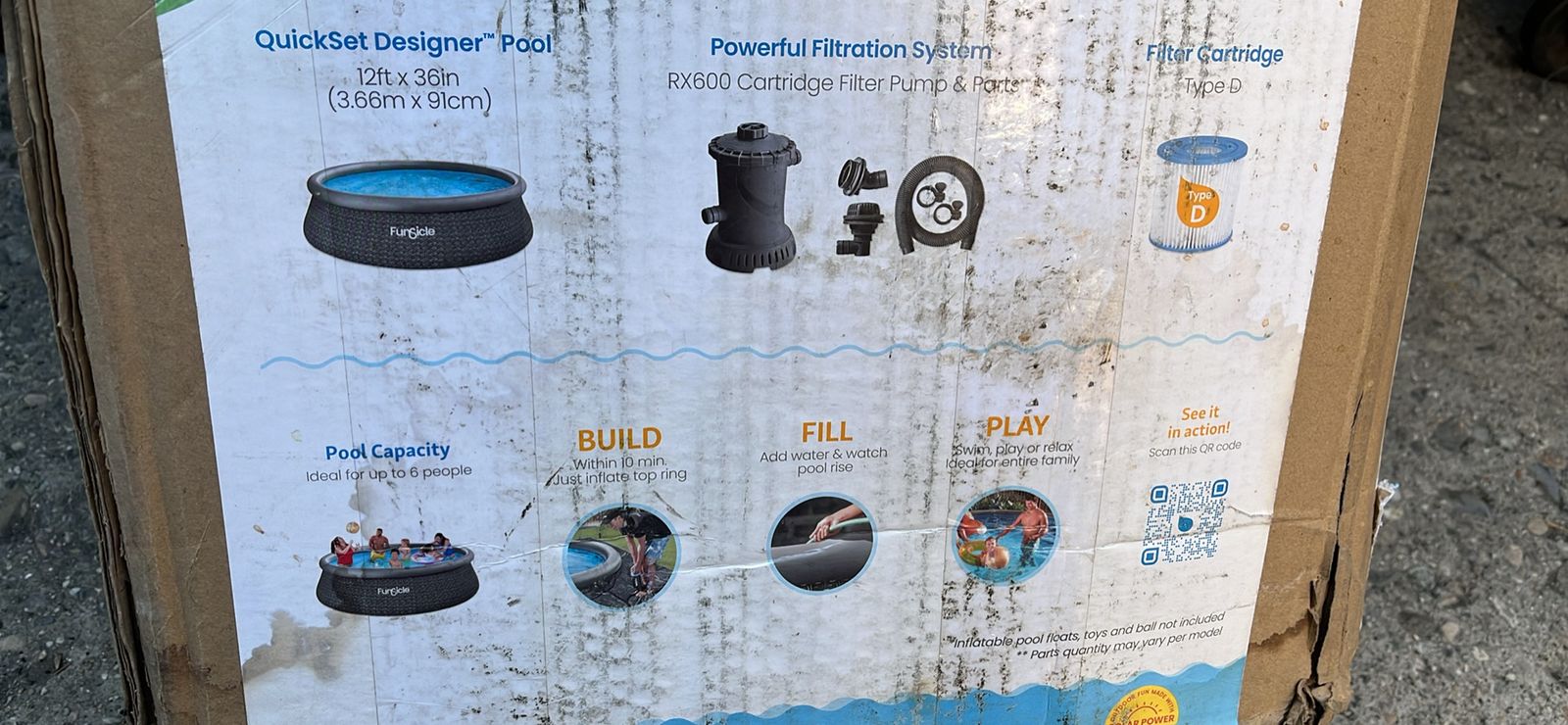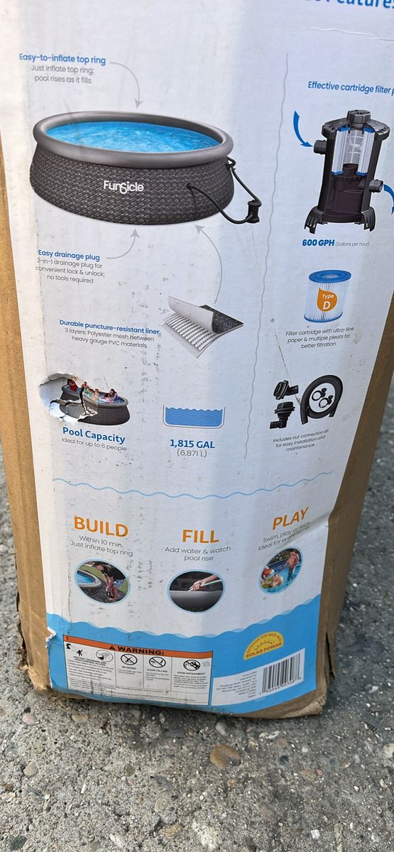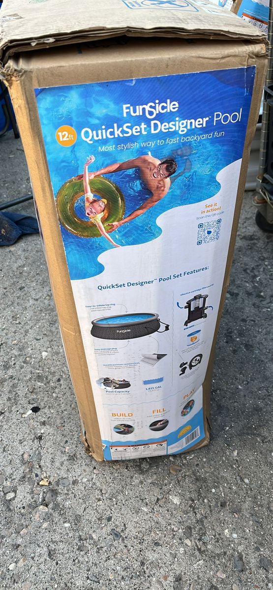 VenmoNEW FUNSICLE 12 FT DESIGNER POOL Round 12-foot by 36-inch above-ground backyard pool gives kids and adults a space to relax and play Pool for the backyard is ideal for up to 6 people and suitable for ages 6 years and up to splash the day away Quick and easy setup by inflating the top ring and watching as the pool rises as it fills with water Reliable 3-ply ToughMesh materials resist punctures for increased durability to use summer after summer Drainage plug allows for easy emptying and water removal Includes the Funsicle FiltraBoost 800 Pool Pump (with GFCI plug), Type D Filter Cartridge & repair patch Material: PVC Style: Dark Triple Basketweave Color: Brown Dimensions (L x W x H): 144 x 144 x 36 inches Weight: 32.61 pounds See Less See Less