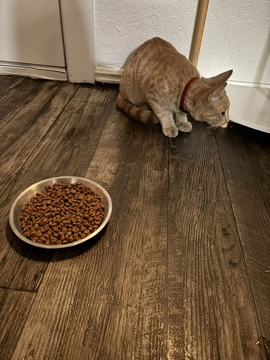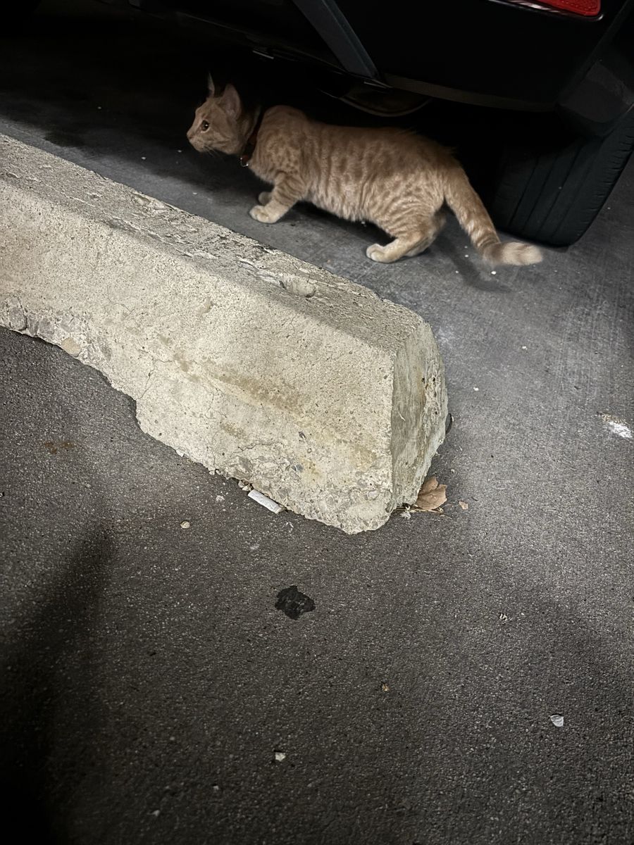 My neighbor called thinking this was my missing cat! We were able to catch it an I have it home with me. Red collar and definitely around 5-7 months old. Proof of ownership, not giving to a rando!