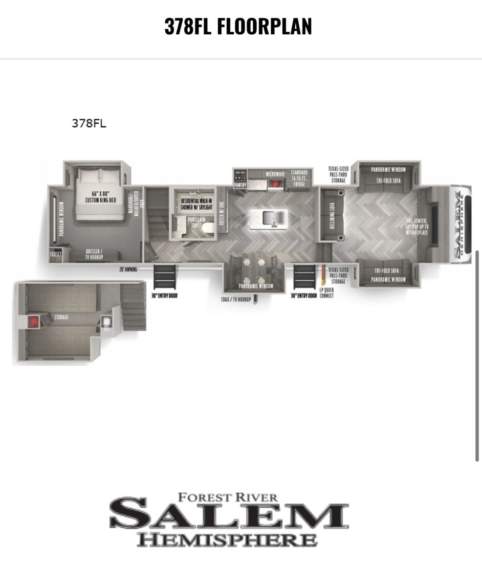 Loaded 2022 Forest River Salem Hemisphere 378FL 43 ft | 5 slide outs | sleeps 8 Features: Separate living room with 2 fold out couches and one double reclining couch with fire place a large flat screen TV Kitchen island with stainless steel sink, residential refrigerator and 3 burner stove Walk in shower Private master bedroom with king bed and dresser Washer/dryer hookups Loft with 2 twin mattresses Dual AC & furnace Auto leveling system Outdoors shower Large exterior storage Large awning w/ LED lights Radio with outdoor speakers 10 gallon water heater