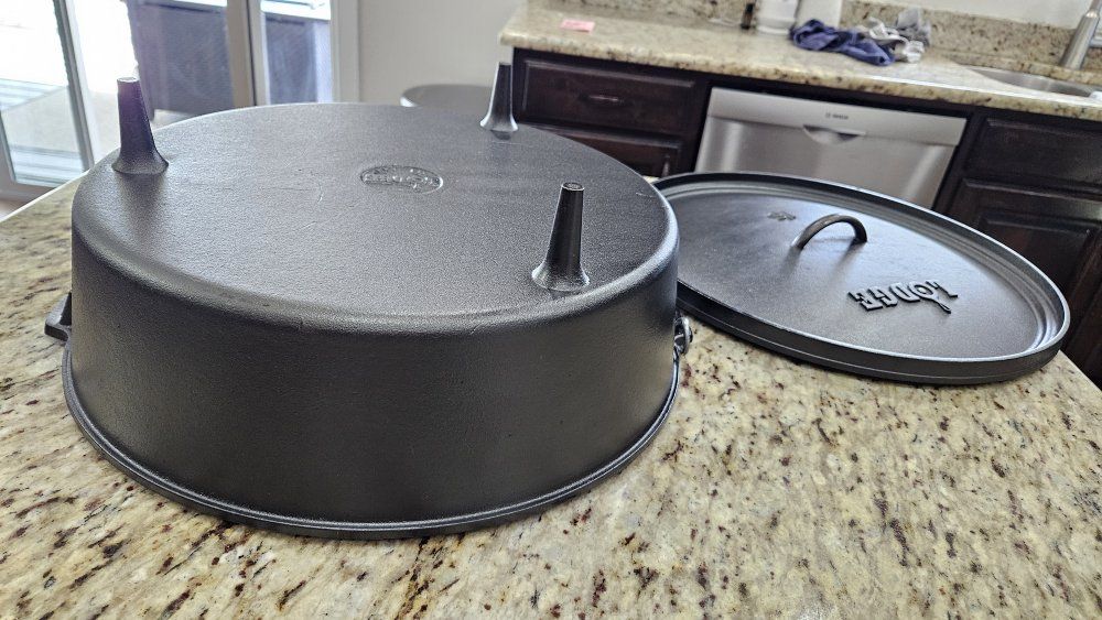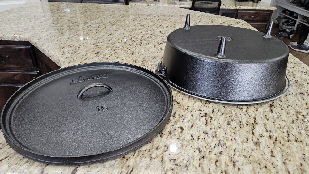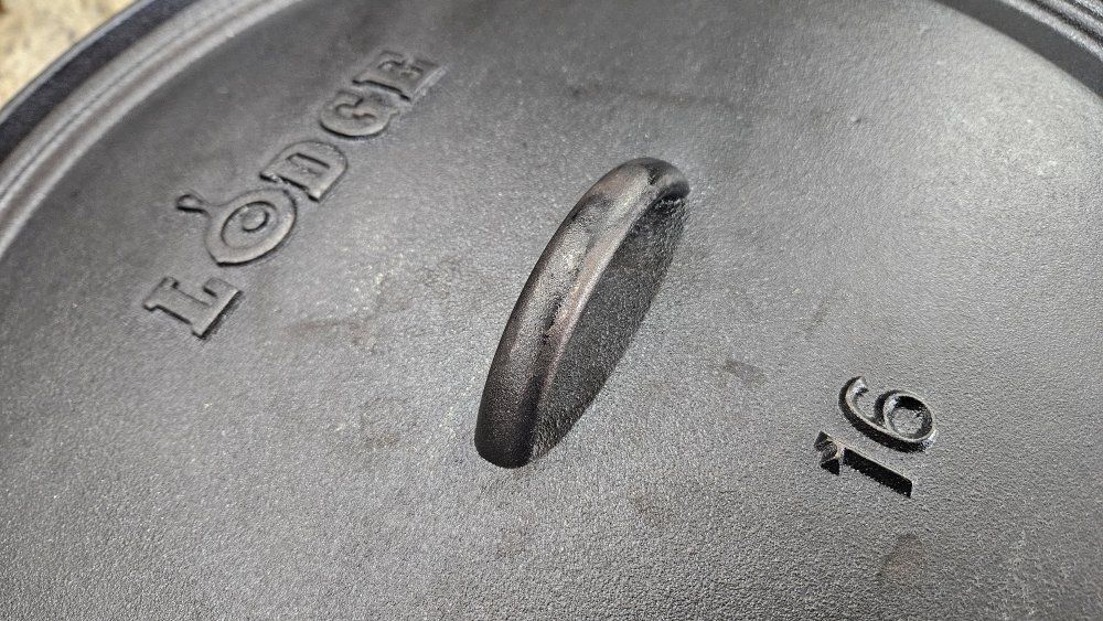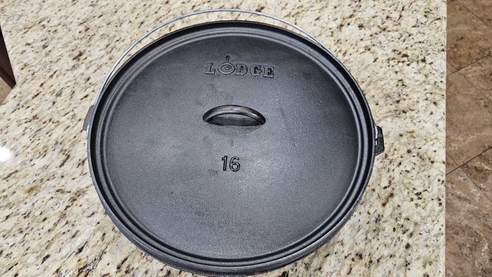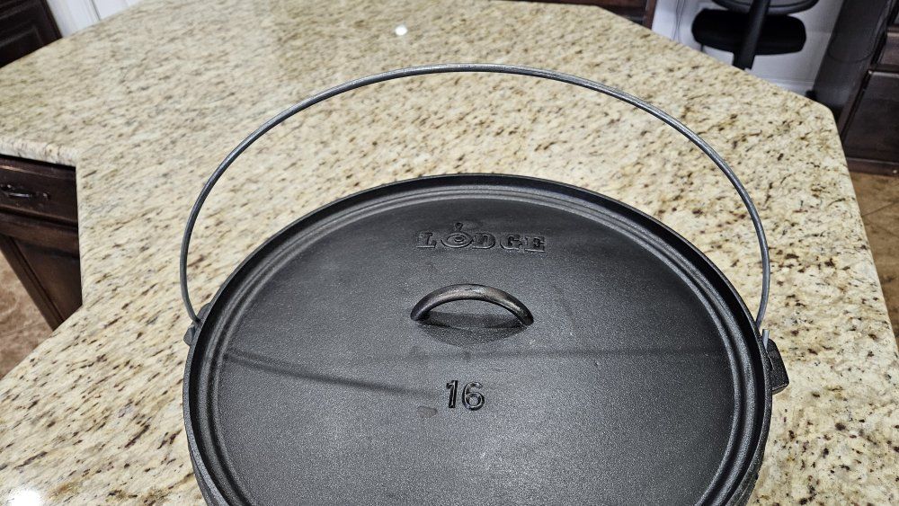 Lodge #16 Camp Oven Discontinued model. Collectible. Excellent condition New Old Stock Embossed Lodge #16 Dutch Oven. Never used. Original seasoning. Not stripped. Selling as is. A light wipe down with a damp rag. Clean inside and out.