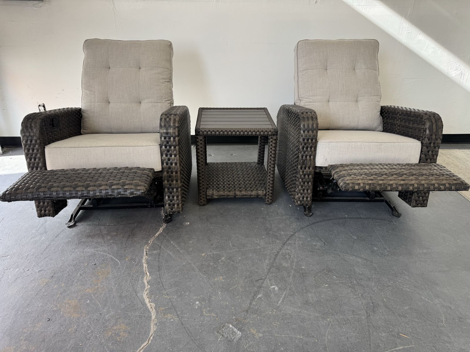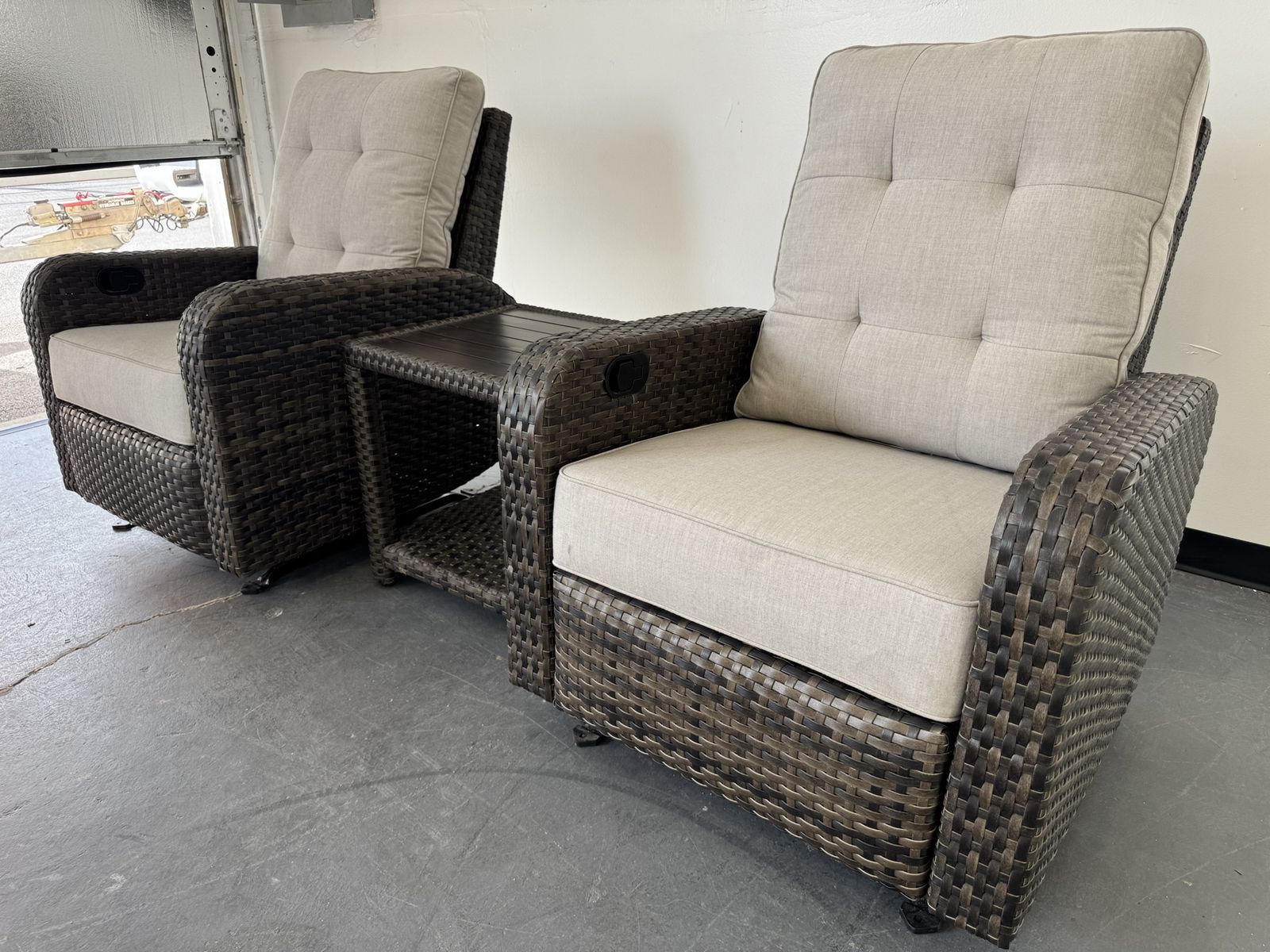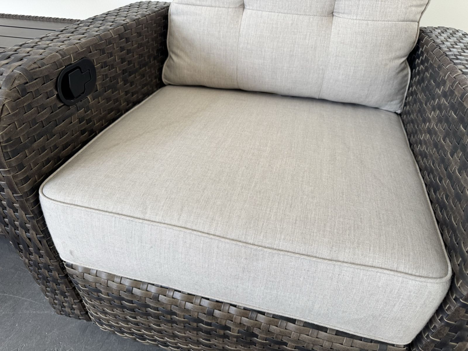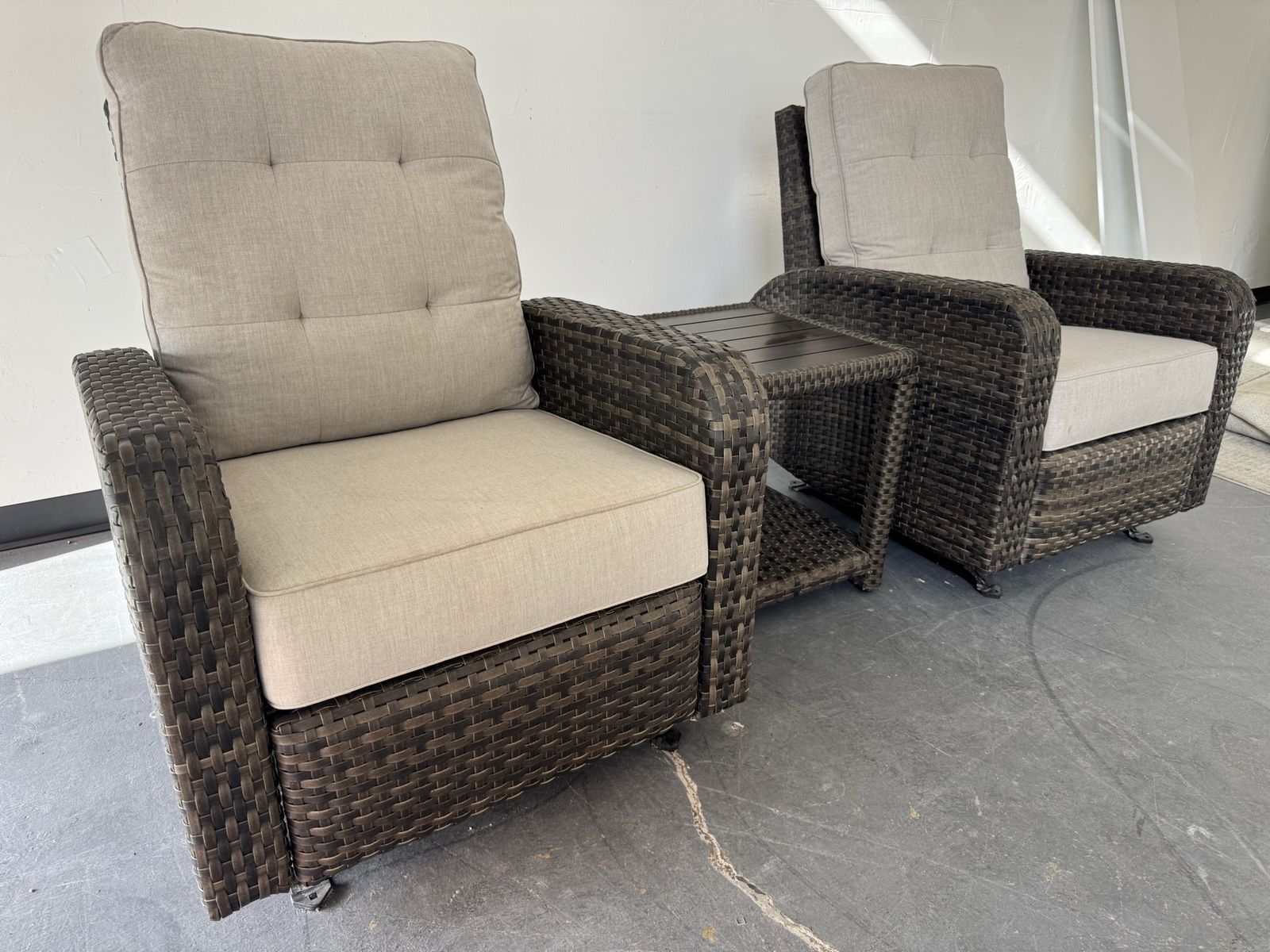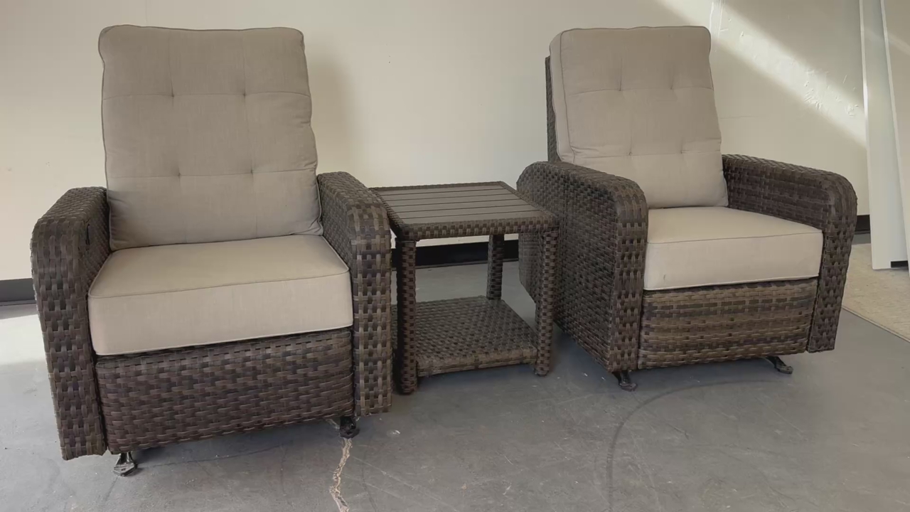 Features: Includes Two Glider Recliner Chairs, and One Side Table Rust-resistant Aluminum Frames All-weather, Hand-woven Resin Wicker Cushions are Made with Sunbrella® Fabric that is Resistant to Stains, Mildew, Chlorine and Fading