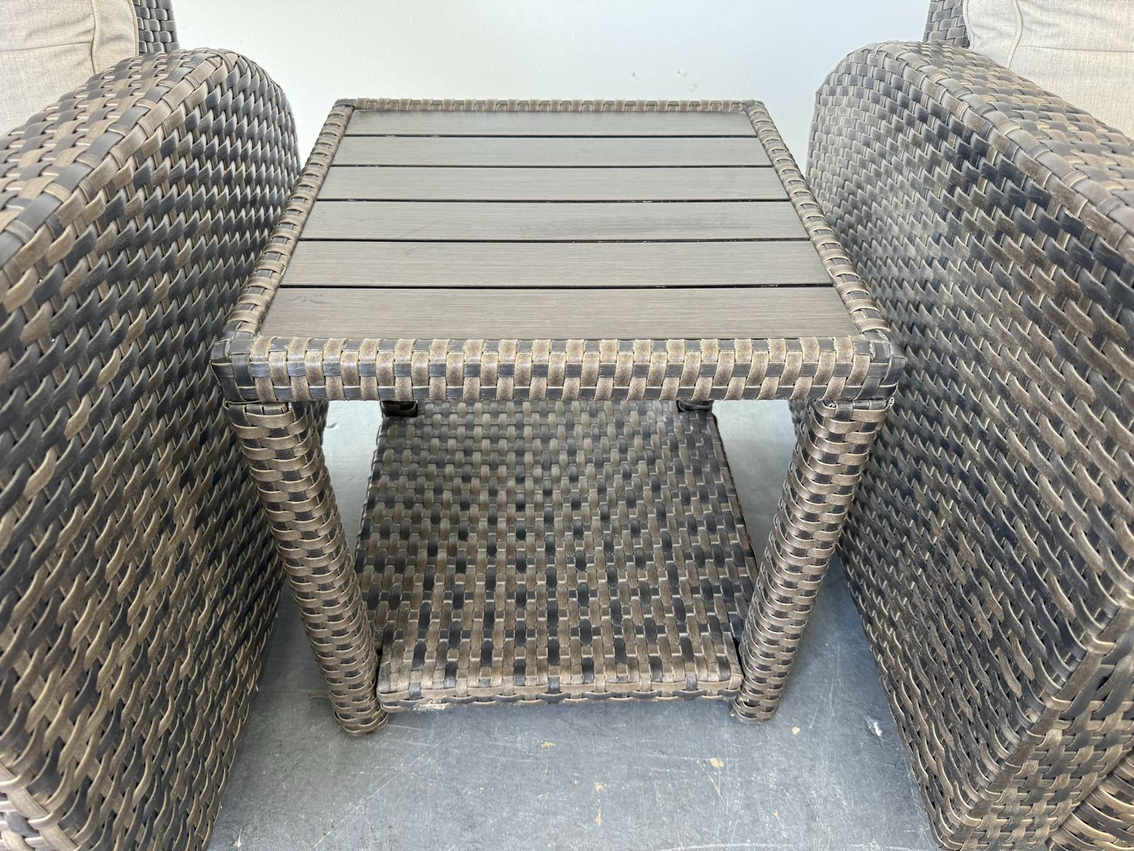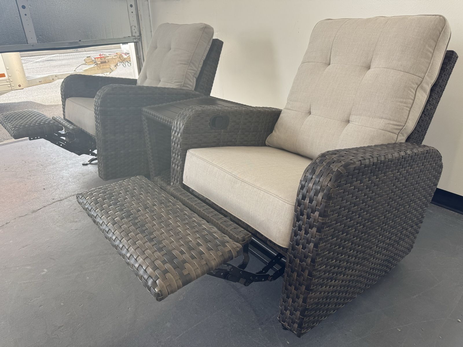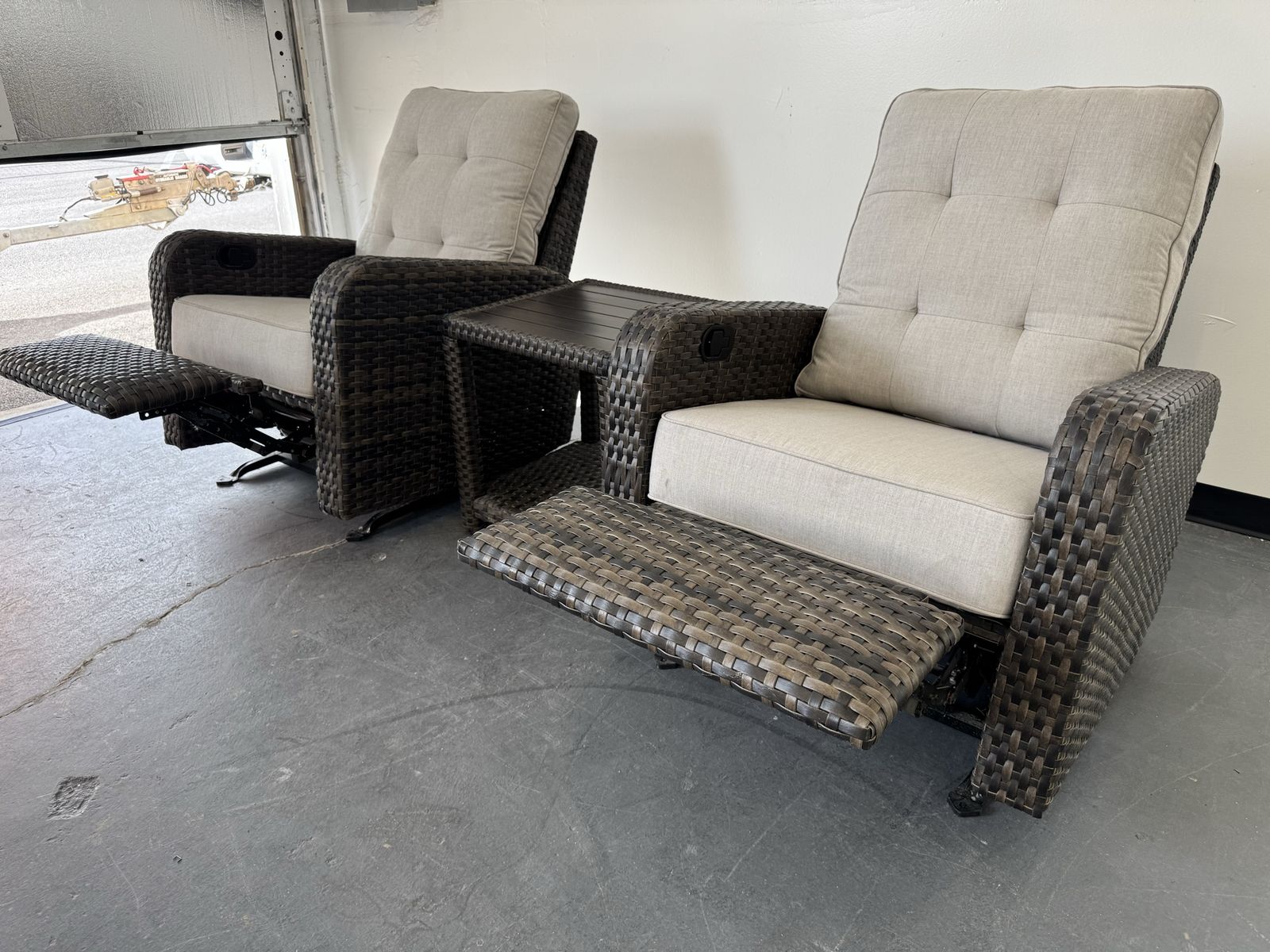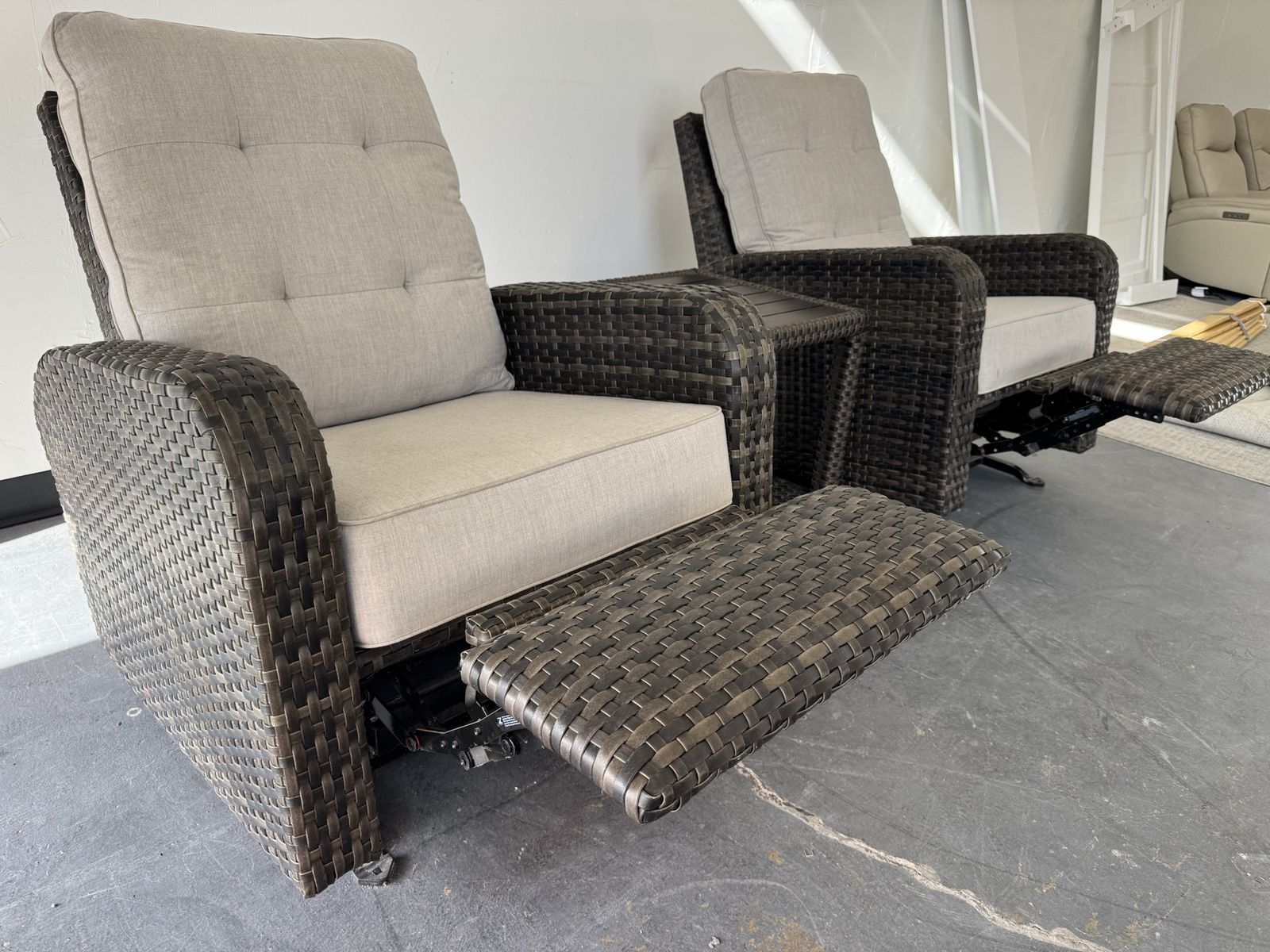 Features: Includes Two Glider Recliner Chairs, and One Side Table Rust-resistant Aluminum Frames All-weather, Hand-woven Resin Wicker Cushions are Made with Sunbrella® Fabric that is Resistant to Stains, Mildew, Chlorine and Fading