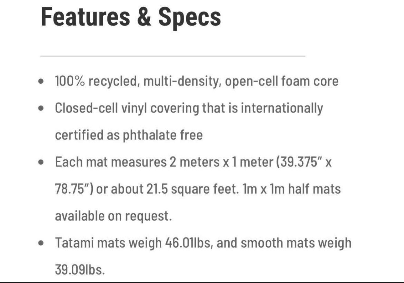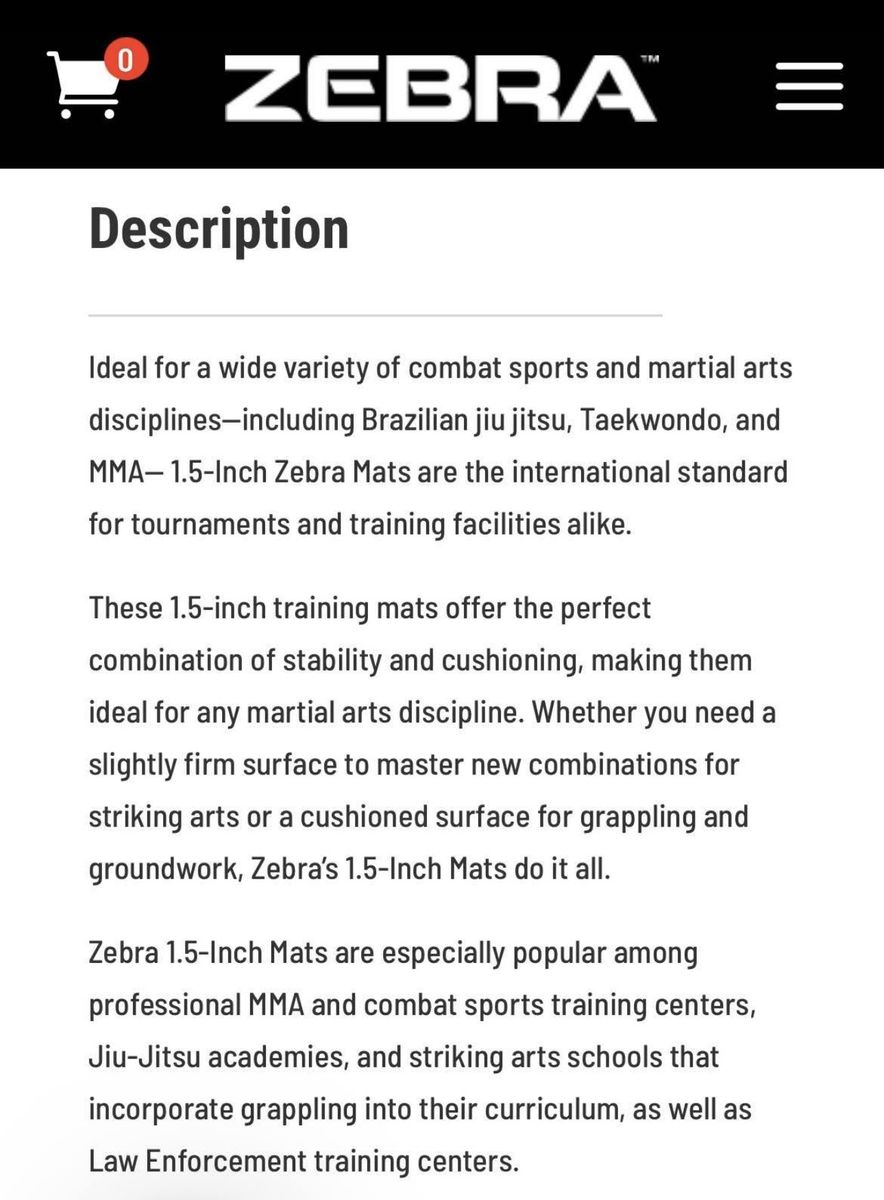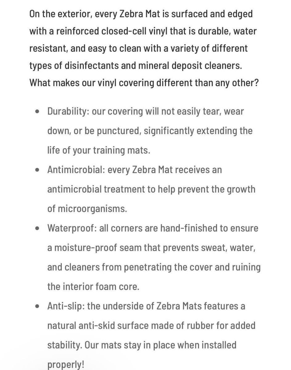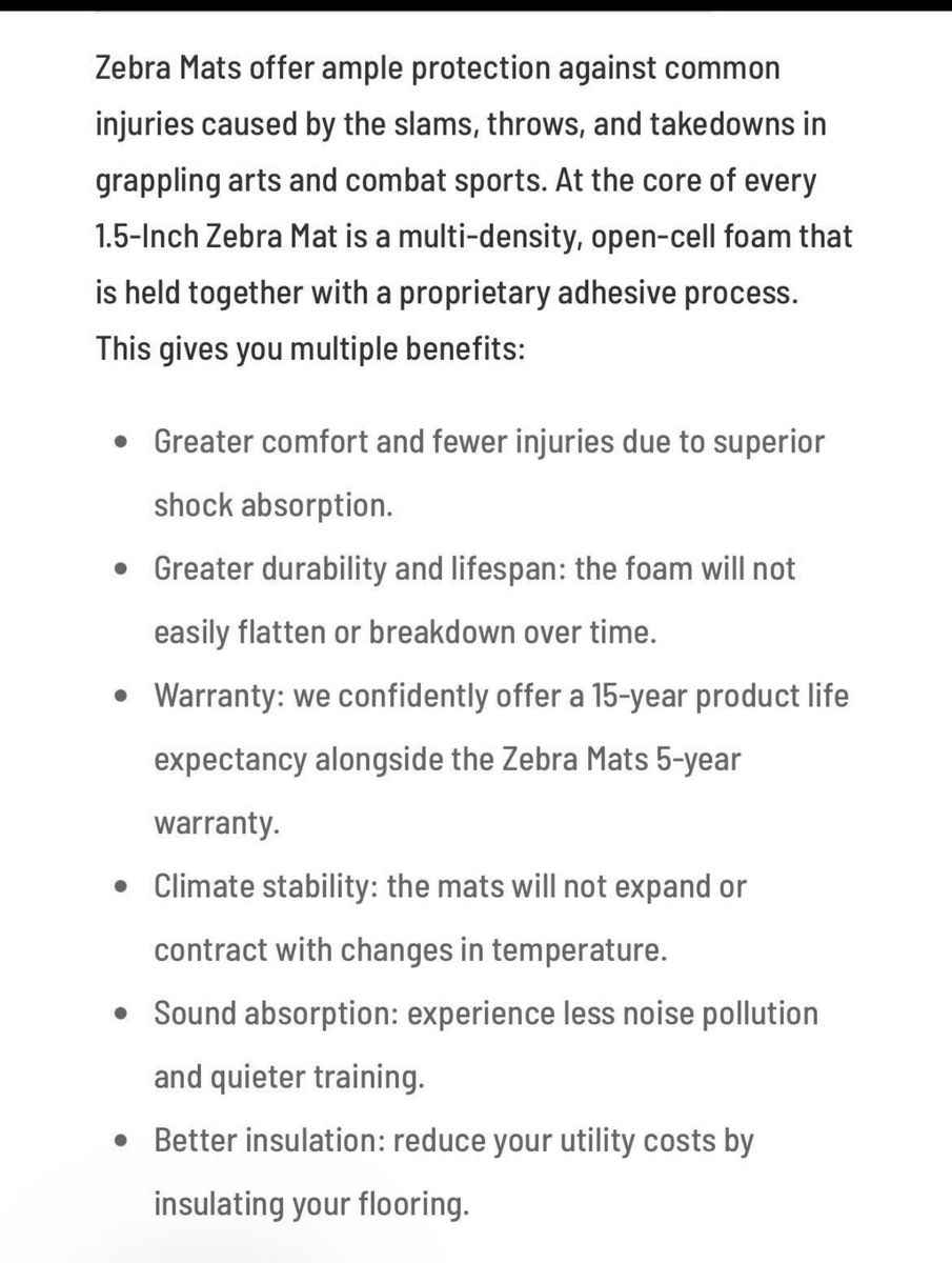 VenmoSmooth zebra mats that are 1.5 inches thick. There are 14 mats in total, each measuring 39.375 inches by 78.75 inches, which equals 21.5 square feet each. Additionally, I have 8 filler pieces available. I'm looking to sell each mat for $115, or all of them including the filler pieces for 1,500