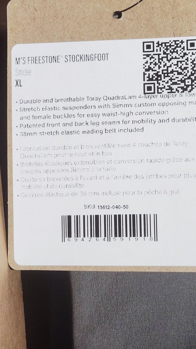 Features & Specifications****Brand: Simms Model: Freestone Stockingfoot Waders Year: 2025 MSRP: $450 Size: Men’s XL (Regular) Color: Stone Condition: Brand New with Tags (NWT), New in Original Box Construction: Built with a durable 4-layer Toray QuadraLam upper and lower for waterproof, breathable performance Pockets: Built-in inside pocket; upper chest pocket array with top-access stretch-woven storage pocket, micro-fleece-lined handwarmer pockets, and integrated loop fly patch Suspenders: Stretch elastic suspenders with Simms custom opposing male and female buckles for easy waist-high conversion Belt: Dual rear belt loops with 38 mm stretch elastic wading belt included Booties: Anatomically shaped neoprene stockingfeet Gravel Guards: Built-in gravel guards help keep debris out of your boots Weight: 3 lb. 3 oz. Build Quality: Durable Simms construction trusted by anglers worldwide