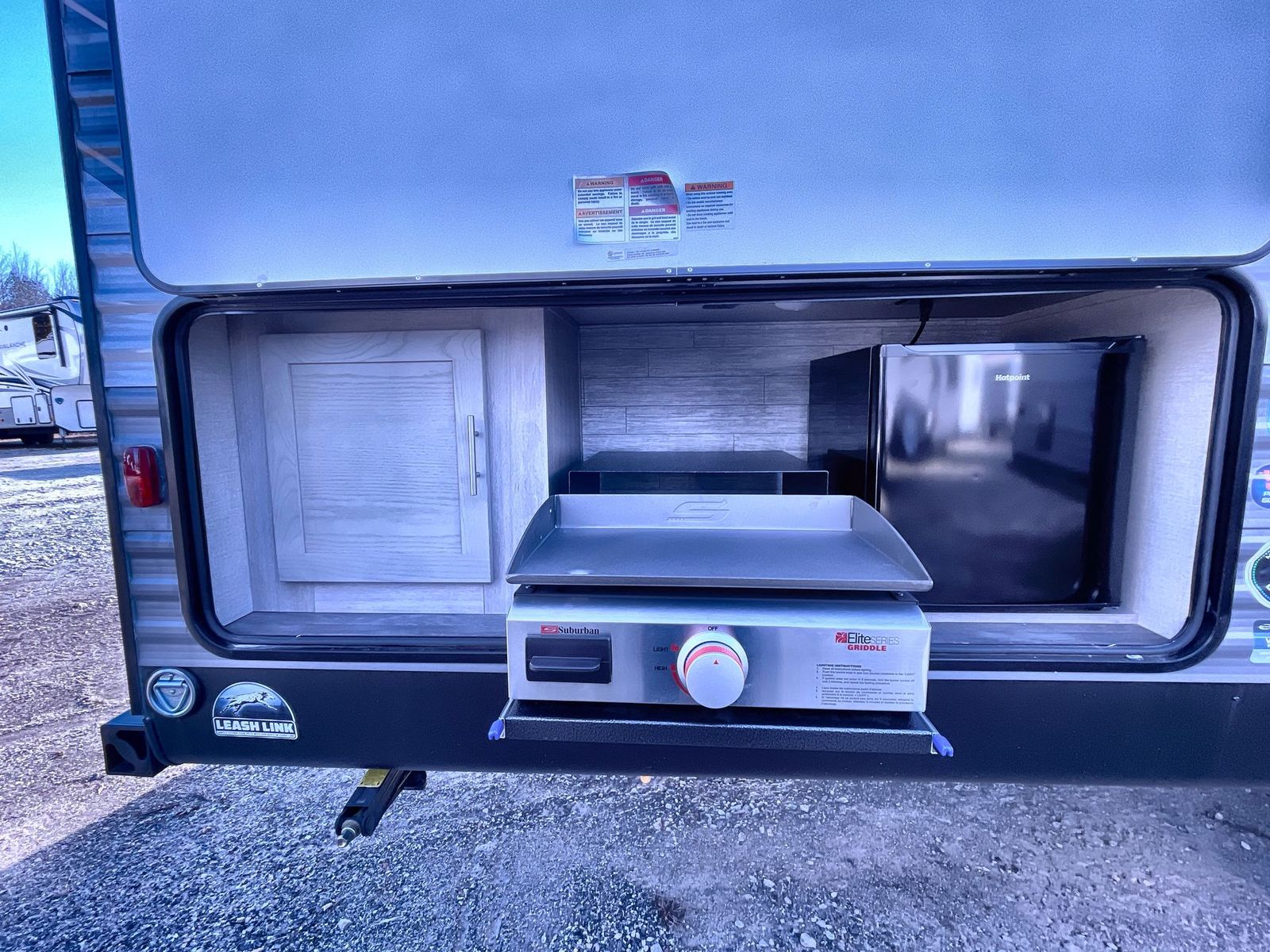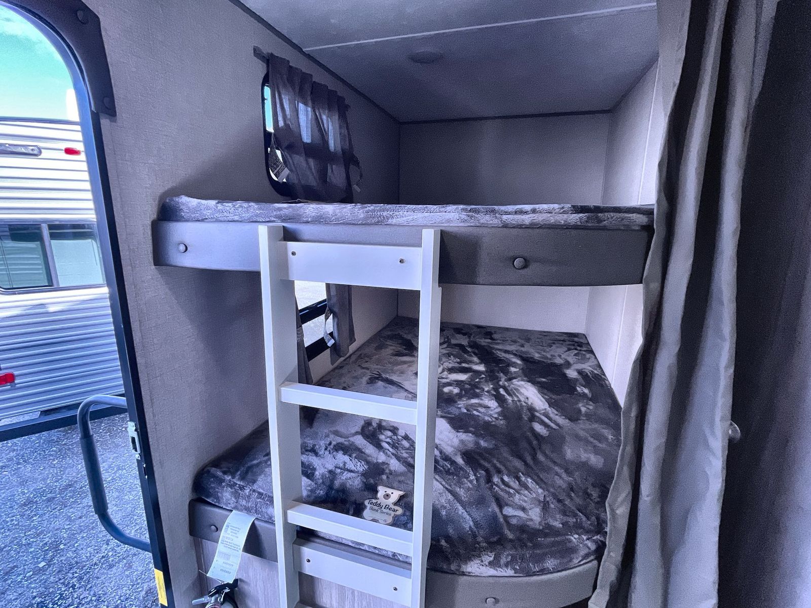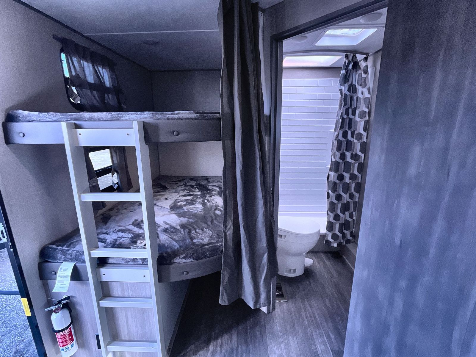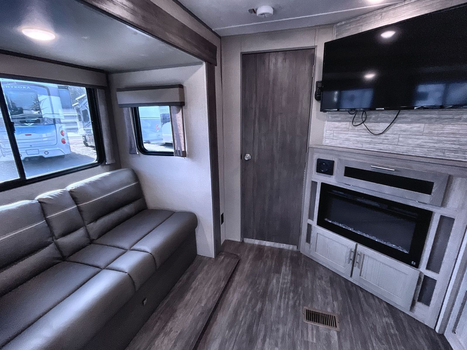 Life is easier in this travel trailer with dual entry doors! One of the entrances leads directly into the front private bedroom which has a 60" x 74" queen bed with wardrobes on either side to hang your clothes and a coat closet. The second entrance is right by the double-size bunks and rear corner bathroom that has a tub/shower with skylight above for a shower with a view when you look up. The living area has everything you need for a cozy evening indoors between the 60" trundle sofa with an arm rest/cupholder to set your drink while you enjoy the optional fireplace at the entertainment center or you can play a few card games at the U-shaped dinette. Cook a sunrise breakfast at the outside camper kitchen with the pull-out griddle, a cabinet for storage, and a refrigerator for cold orange juice!