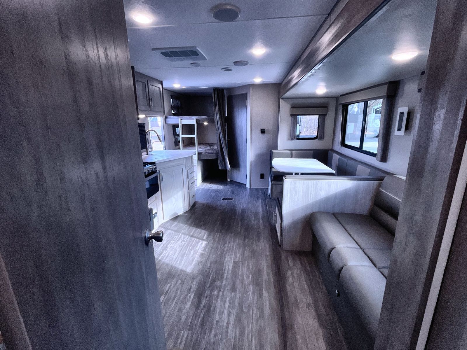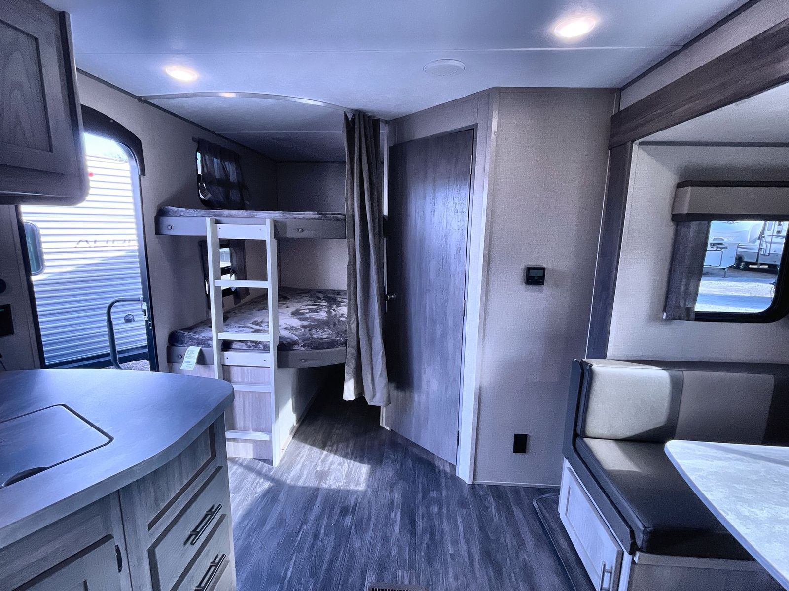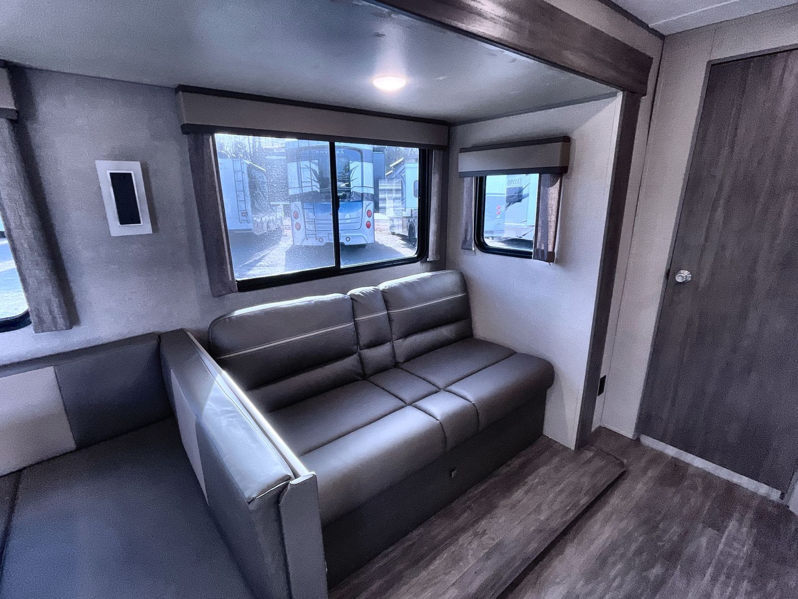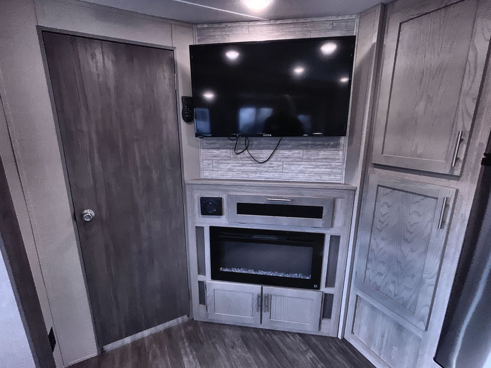 Life is easier in this travel trailer with dual entry doors! One of the entrances leads directly into the front private bedroom which has a 60" x 74" queen bed with wardrobes on either side to hang your clothes and a coat closet. The second entrance is right by the double-size bunks and rear corner bathroom that has a tub/shower with skylight above for a shower with a view when you look up. The living area has everything you need for a cozy evening indoors between the 60" trundle sofa with an arm rest/cupholder to set your drink while you enjoy the optional fireplace at the entertainment center or you can play a few card games at the U-shaped dinette. Cook a sunrise breakfast at the outside camper kitchen with the pull-out griddle, a cabinet for storage, and a refrigerator for cold orange juice!