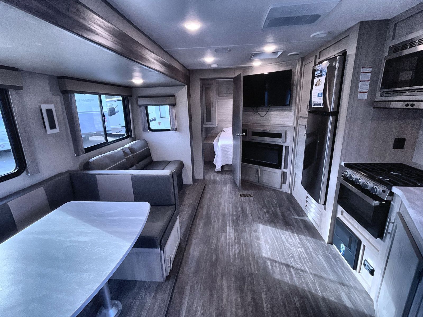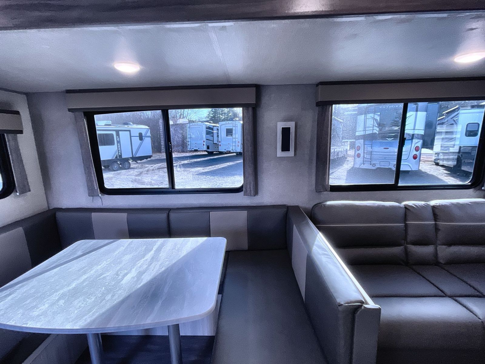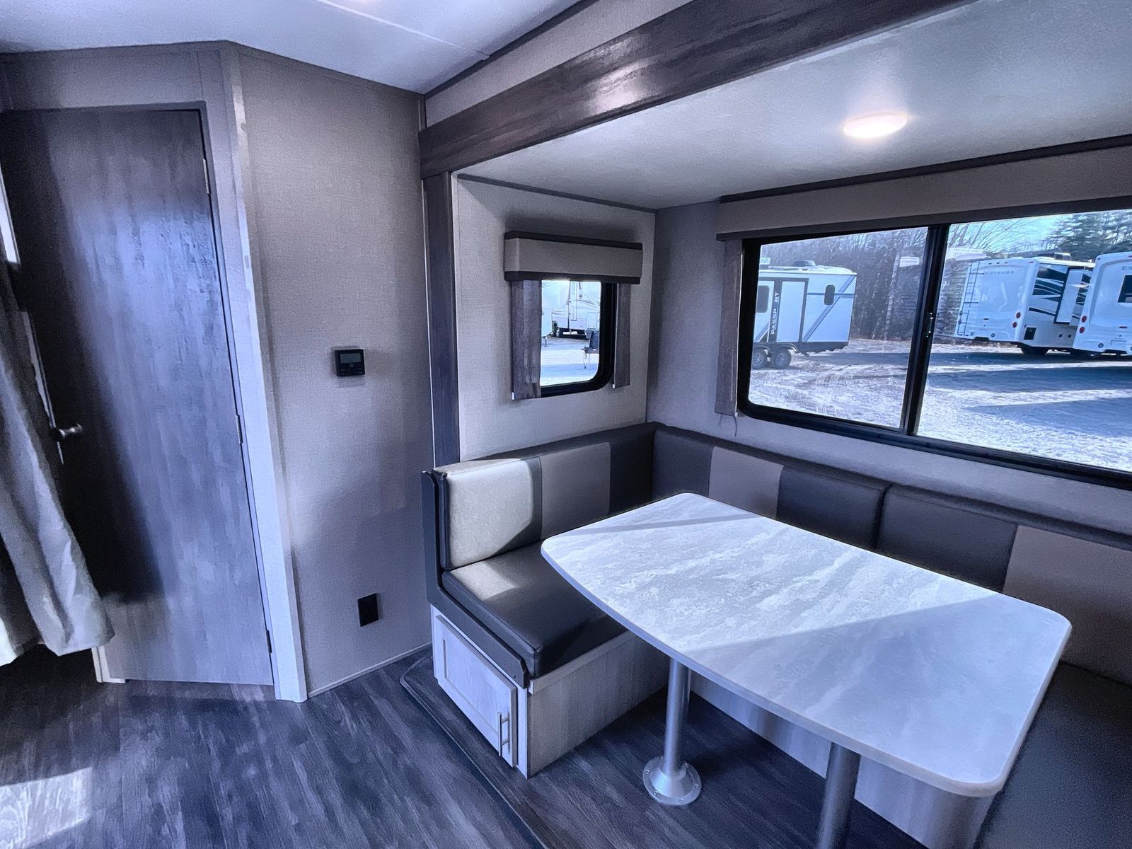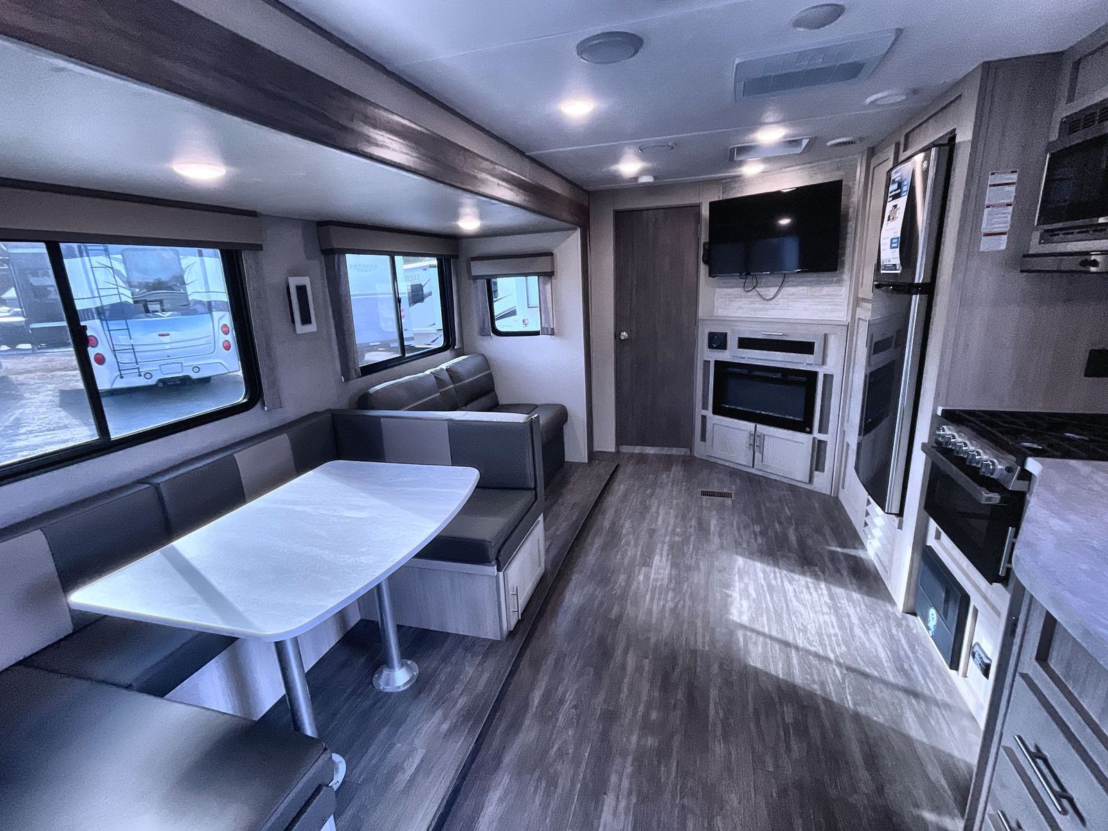 Life is easier in this travel trailer with dual entry doors! One of the entrances leads directly into the front private bedroom which has a 60" x 74" queen bed with wardrobes on either side to hang your clothes and a coat closet. The second entrance is right by the double-size bunks and rear corner bathroom that has a tub/shower with skylight above for a shower with a view when you look up. The living area has everything you need for a cozy evening indoors between the 60" trundle sofa with an arm rest/cupholder to set your drink while you enjoy the optional fireplace at the entertainment center or you can play a few card games at the U-shaped dinette. Cook a sunrise breakfast at the outside camper kitchen with the pull-out griddle, a cabinet for storage, and a refrigerator for cold orange juice!