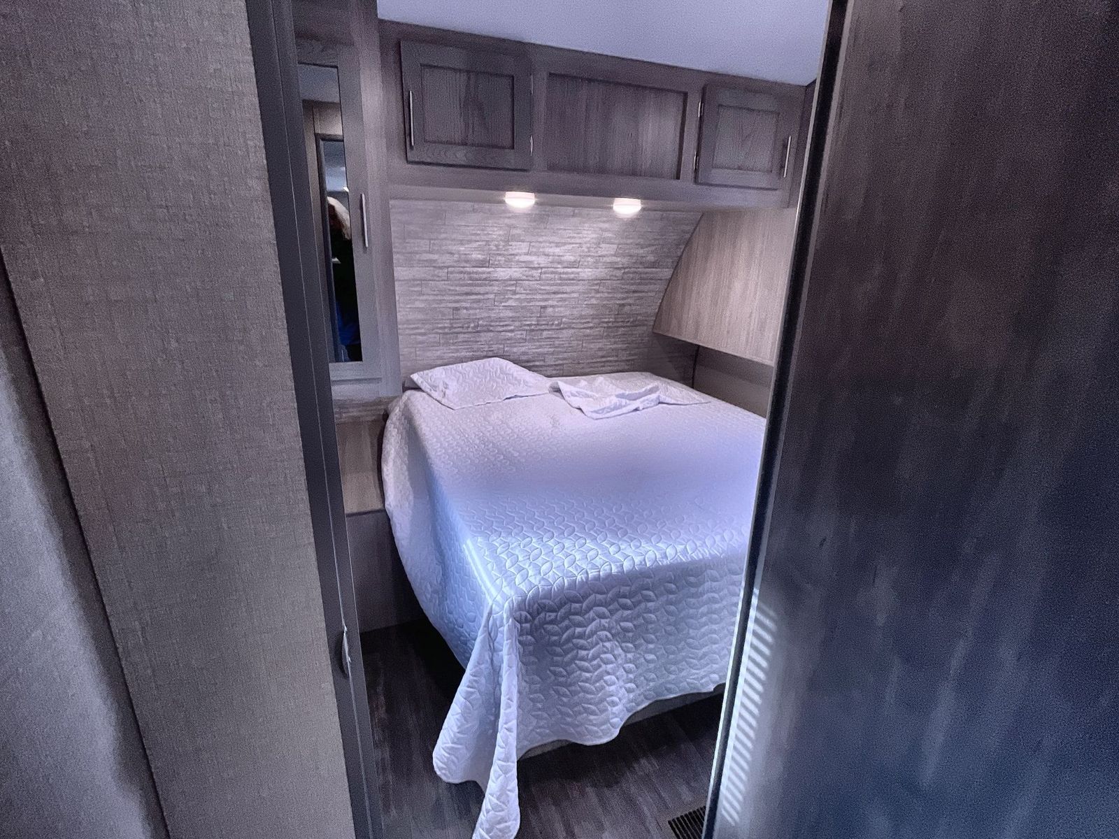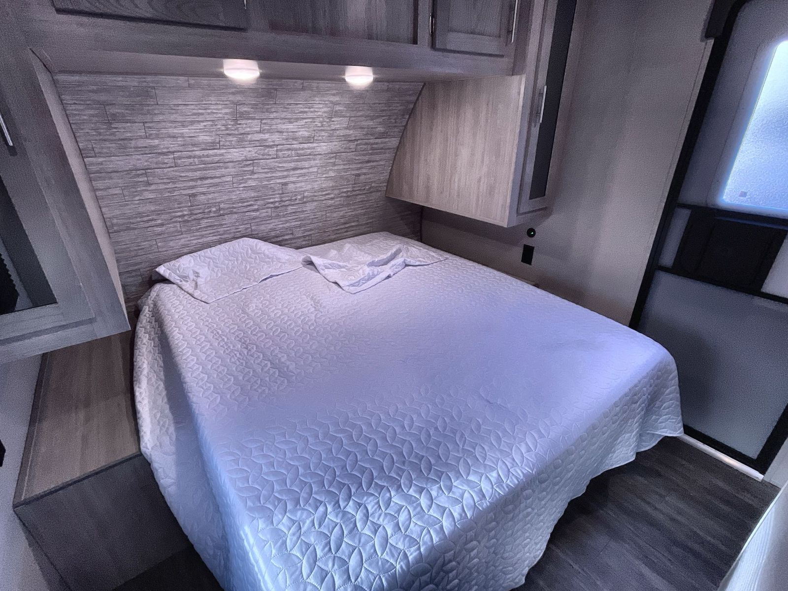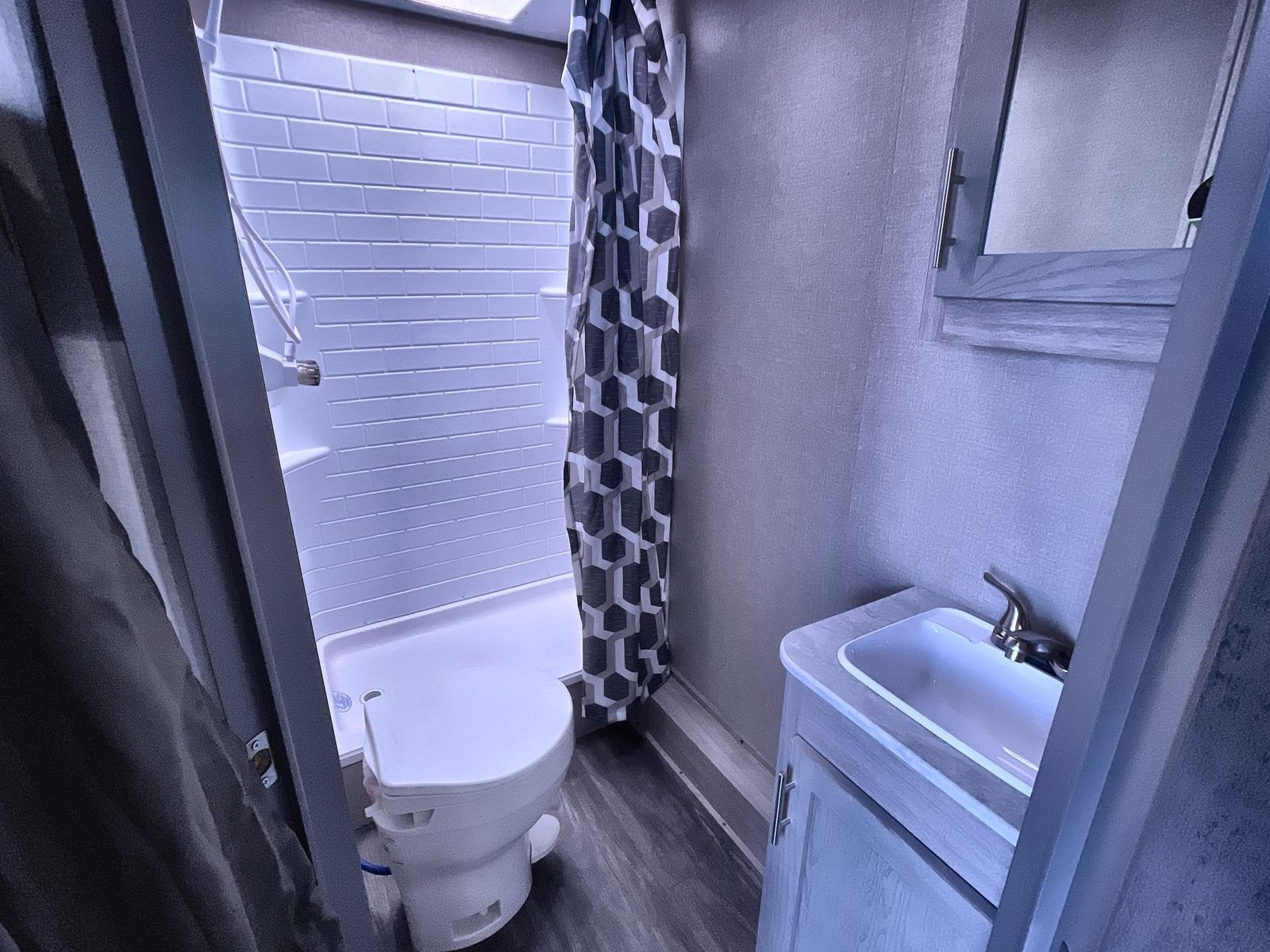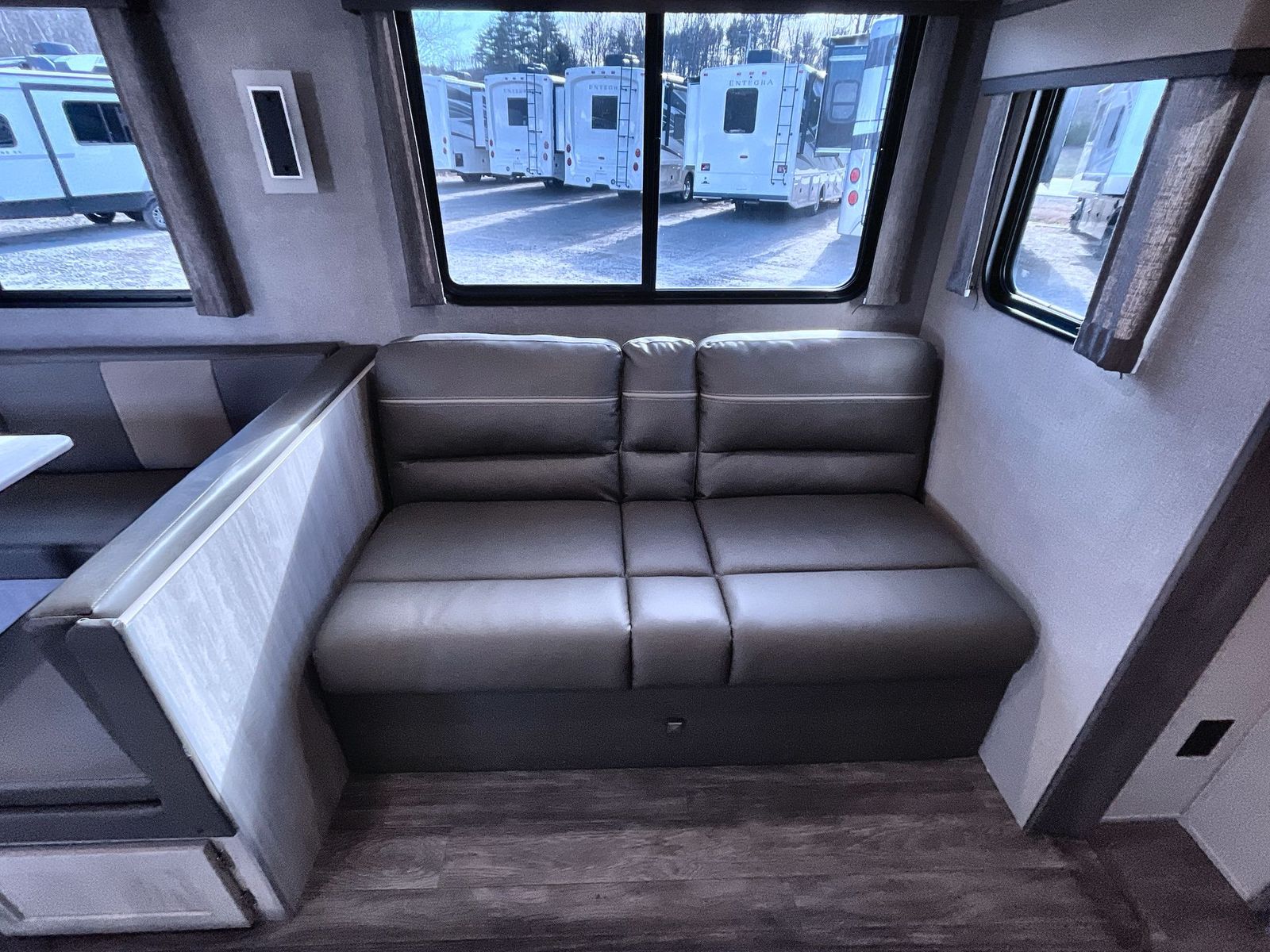 Life is easier in this travel trailer with dual entry doors! One of the entrances leads directly into the front private bedroom which has a 60" x 74" queen bed with wardrobes on either side to hang your clothes and a coat closet. The second entrance is right by the double-size bunks and rear corner bathroom that has a tub/shower with skylight above for a shower with a view when you look up. The living area has everything you need for a cozy evening indoors between the 60" trundle sofa with an arm rest/cupholder to set your drink while you enjoy the optional fireplace at the entertainment center or you can play a few card games at the U-shaped dinette. Cook a sunrise breakfast at the outside camper kitchen with the pull-out griddle, a cabinet for storage, and a refrigerator for cold orange juice!