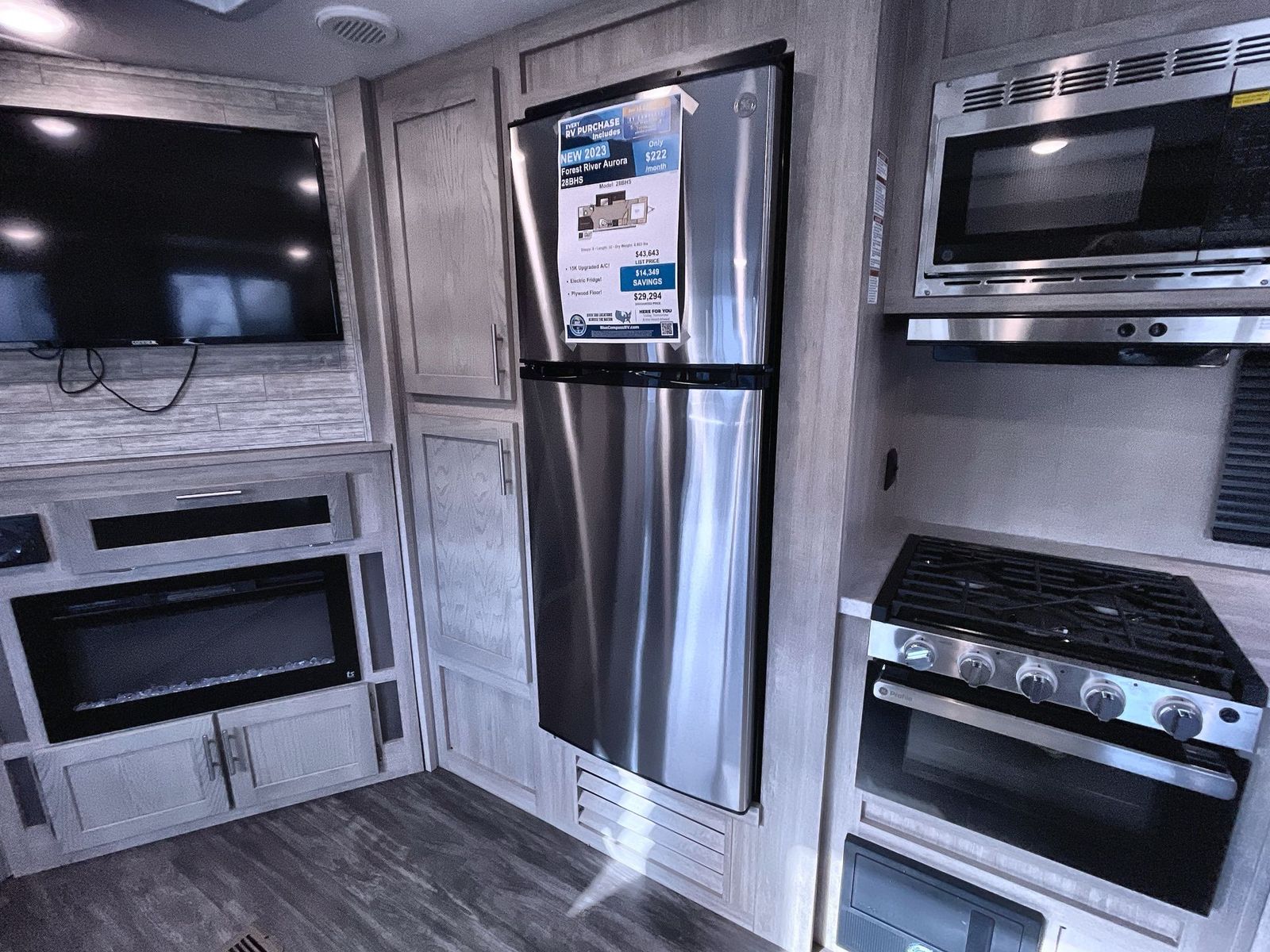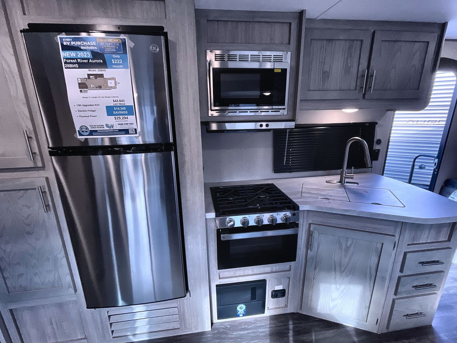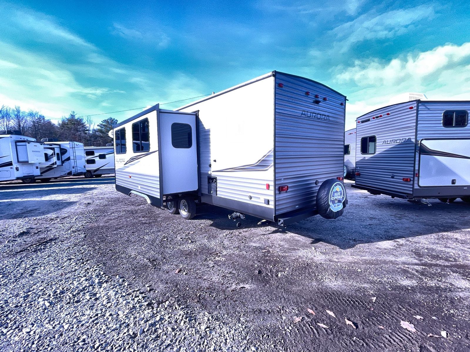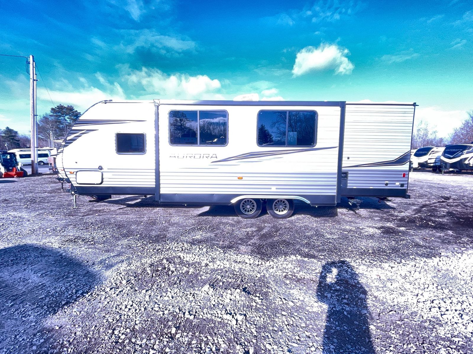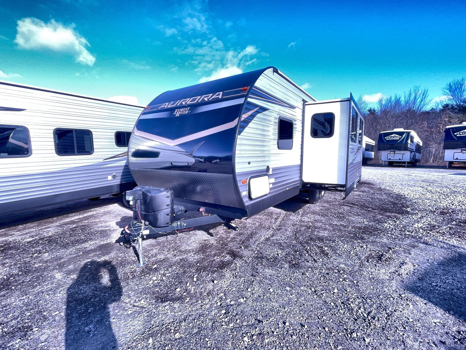 Comfortability, usability, and quality is what you will find in each one of these Forest River Aurora travel trailers, toy haulers or destination trailers! They are designed with a superior build and packed full with industry leading, functional, and distinctive standard features. SolidStep entrance steps and a Safe-T rail door assist on main entry door to help you safely enter and exit the unit. The diamond plate rock guard will protect your unit from road debris and the nitrogen filled radial tires, which keep their pressure longer, offer better fuel economy. You will also find upgraded JBL Elite exterior speakers outside, an electric awning with multicolor lights and remote, plus flush mount baggage doors for easy packing. The interiors are beautifully designed with a deep undermount farm style sink, stainless steel appliances, and linoleum flooring in the slide outs which will be easy to clean. Come find your favorite model today!