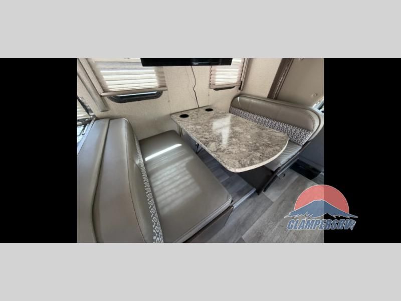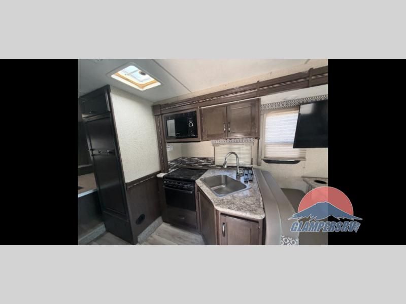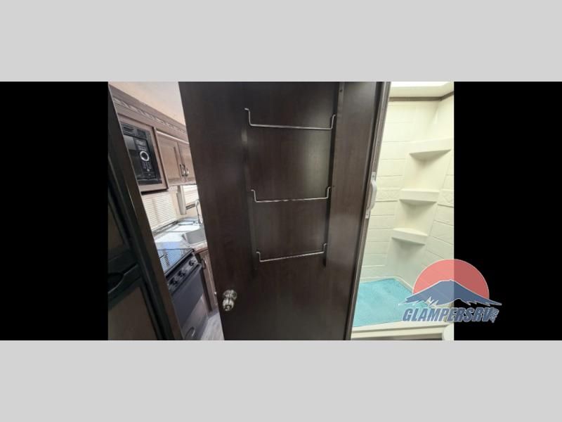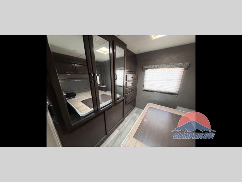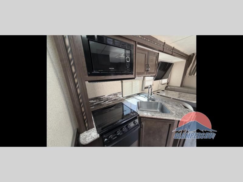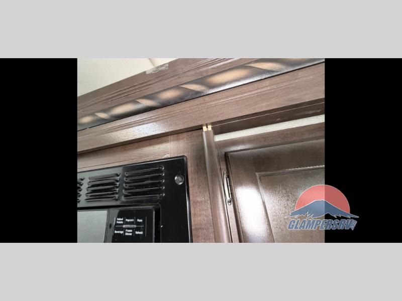 As you enter this model you will find yourself in the combined kitchen and living area. Here there is a slide out along the roadside which features a 71" Dream Dinette with a 40" LED TV above, a large sink, overhead cabinets, a three burner range with a microwave above, and adjacent to the slide out there is a refrigerator for your perishable food items. To the right of the door there is a 68" jack-knife sofa with an overhead cabinet.