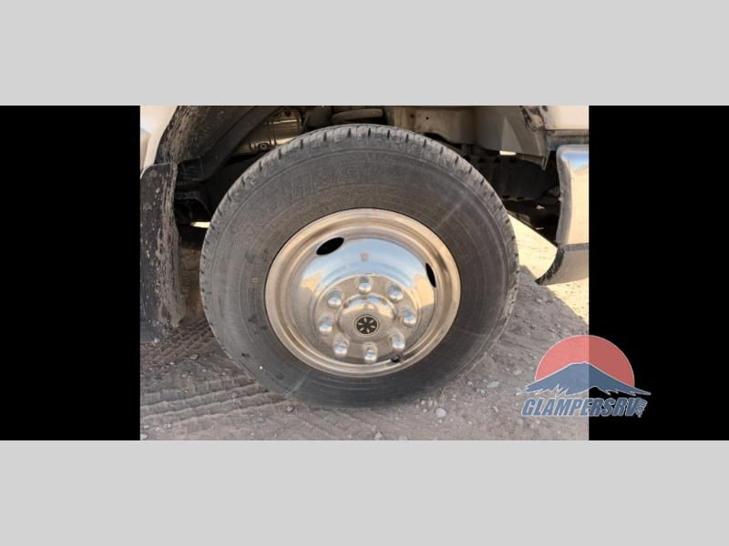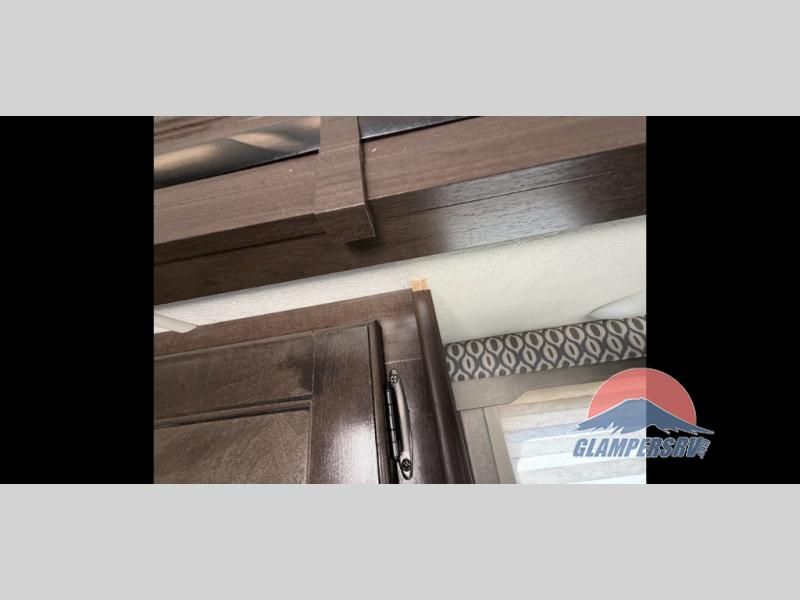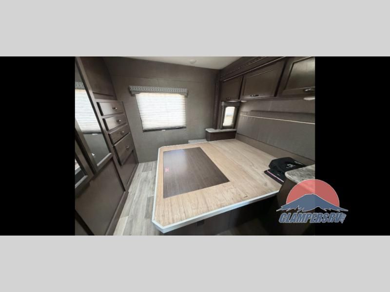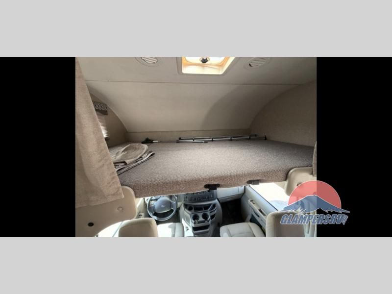 Above the cab there is a cab-over bunk with a 54"x96" sleeping area with two sets of overhead cabinets.