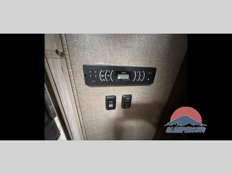 As you step up to the rear bedroom you will find a slide out queen bed with an overhead cabinet and two nightstands along the roadside. Across from the bed there is a dresser and a closet.