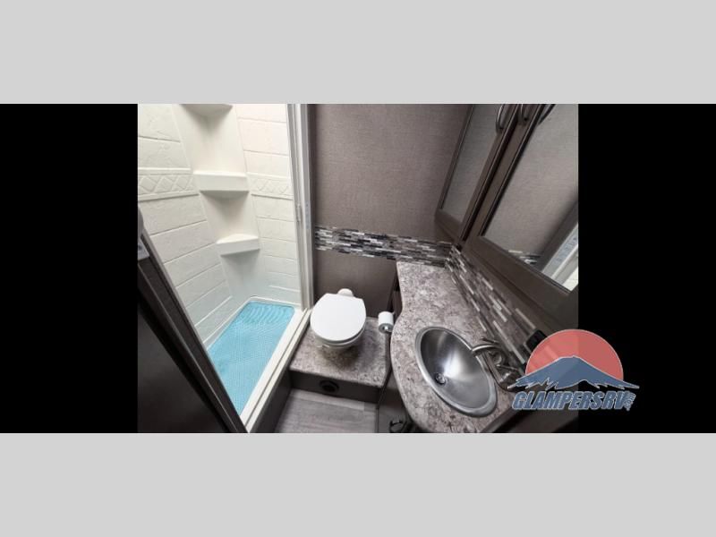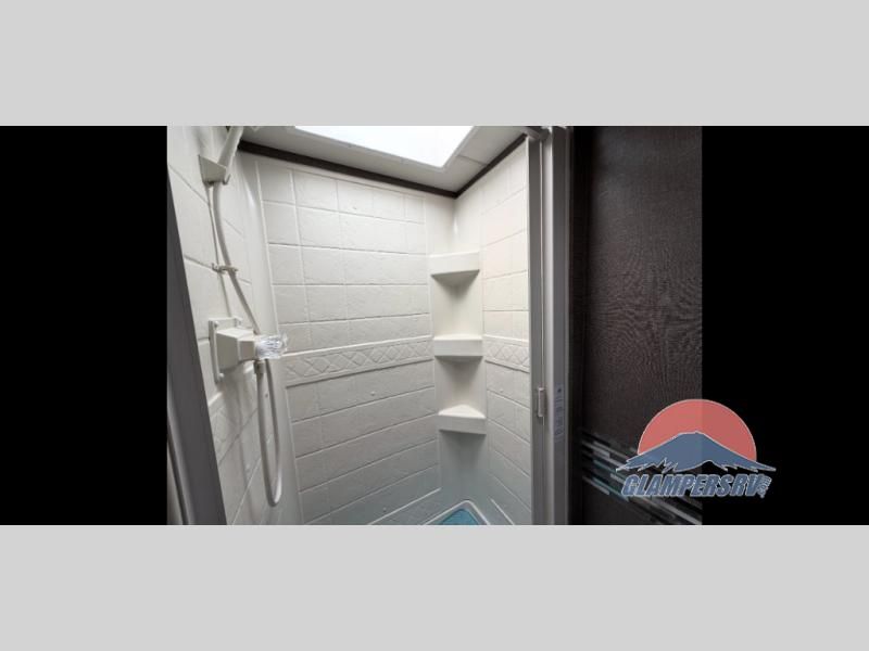 Heading toward the rear of this model, the side aisle bathroom is along the left side. Here there is a sink, plenty of counter space, an overhead cabinet, toilet, and a 24" x 36" shower.