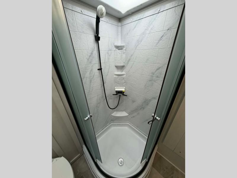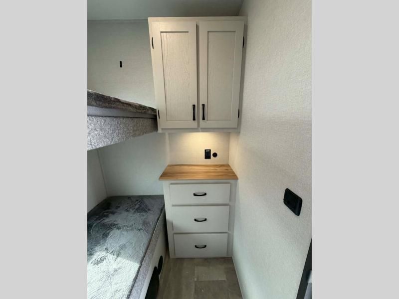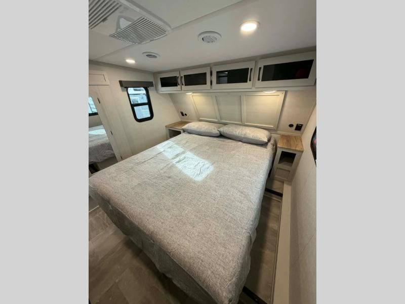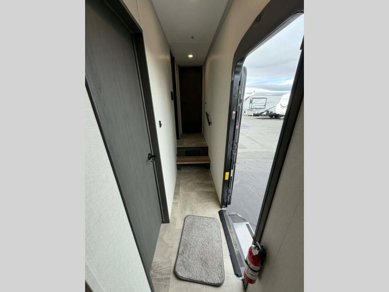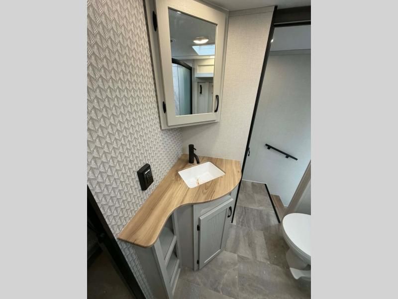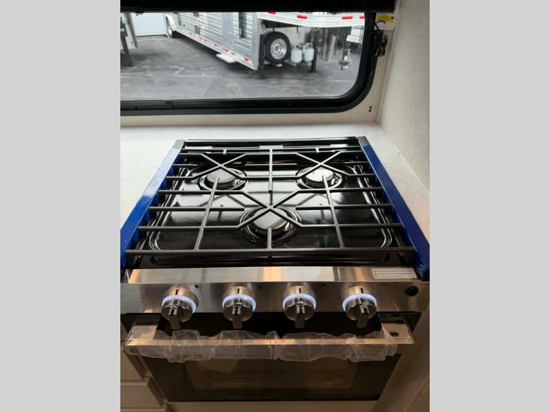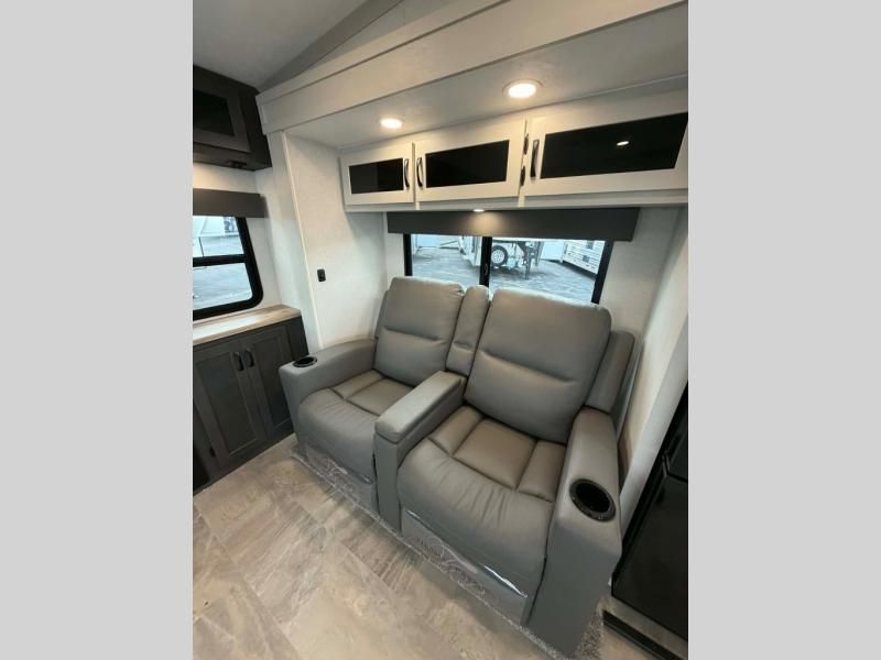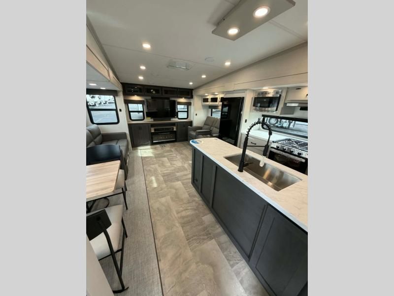 This fifth wheel is perfect for families or large groups since there is a front master bedroom and a middle bunkhouse! The front master suite not only has a queen bed to lay your head on at night and a wardrobe slide, but also an entrance into the dual entry bathroom. The middle bunkhouse has a 30" x 74" bunk bed and a flip-up bunk, shoe storage, and overhead cabinets to keep the clutter away. Grab some eggs from the 10 cu. ft. GE Dual Swing 12V refrigerator, fry them up on the three burner cooktop, and enjoy them at the free-spanning table. You can then read the morning newspaper on either the tri-fold hide-a-bed sofa and theater seating or watch the news with the rear entertainment center!