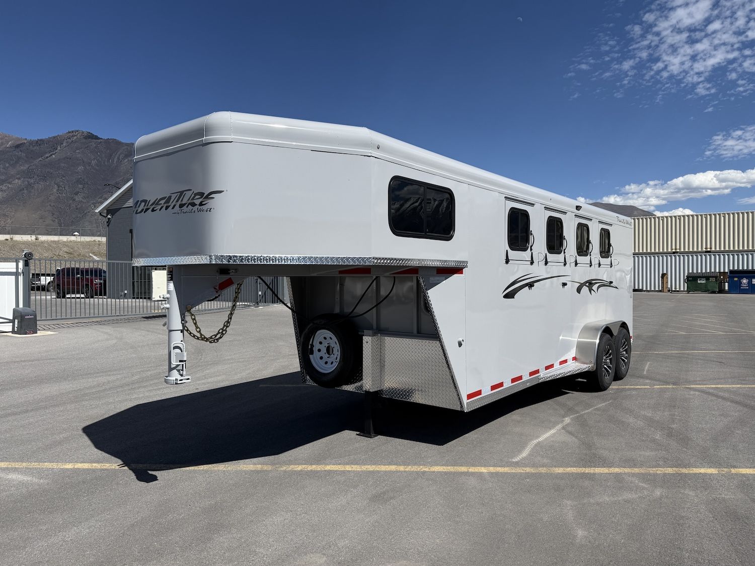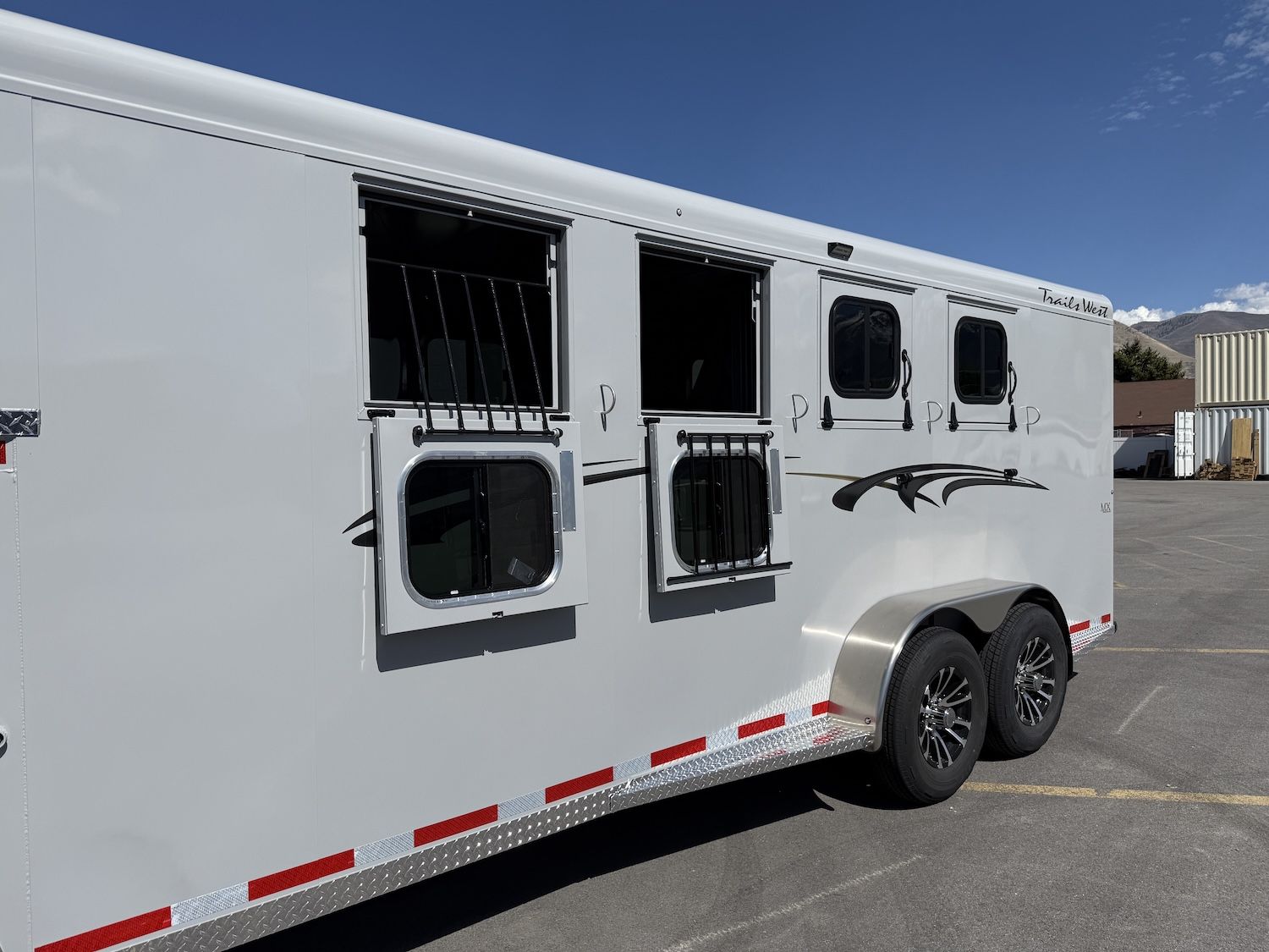 The Adventure MX trailer from Trails West is the best priced steel framed aluminum skinned trailer in the industry. It has the perfect combination of style, user friendly features, and value. This trailer has newly designed aerodynamic front, head side drop down feed windows, tail side sliding windows and rubber wall mats all the way around the horse compartment making it the best equipped trailer in its class.