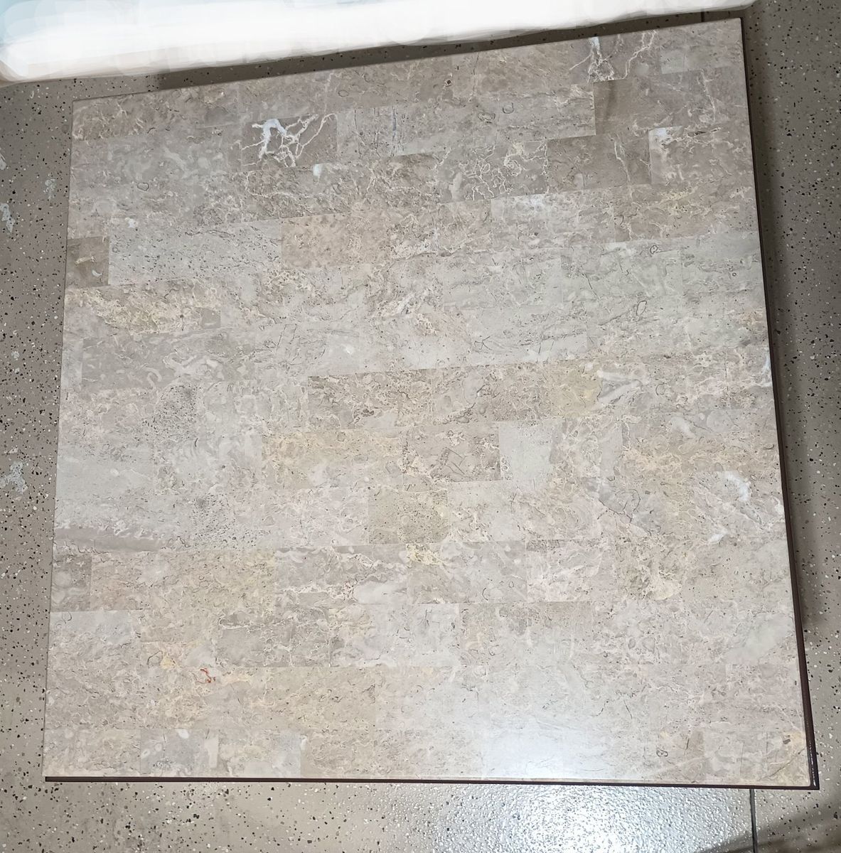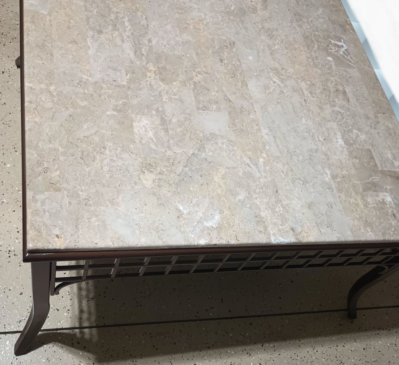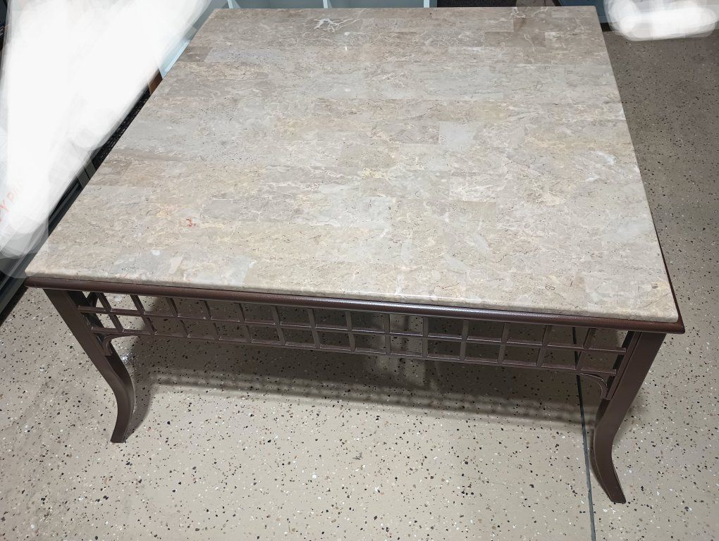 Marble Top, Iron Legs and Base. Large square coffee table for living room. Top 36" square, iron legs designed to flare slightly out. Height 18.5".