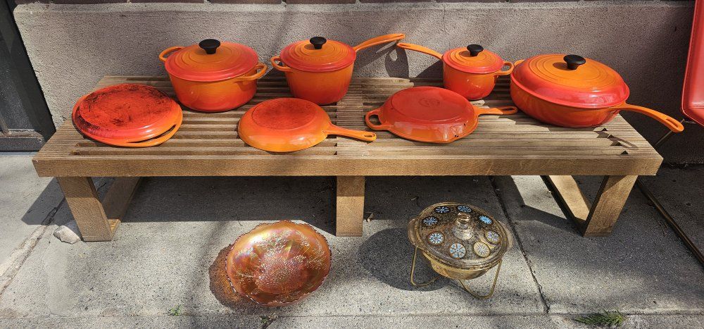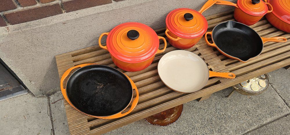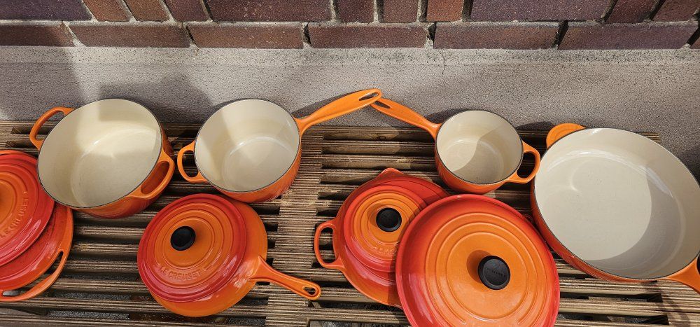 GooglePayLe Creuset enameled cast iron in the original Flame—proper pieces, proper weight, and the kind of cookware that doesn’t really wear out… it just changes owners. A mix of Dutch ovens, sauce pots, skillets, and a wide braiser that might quietly become your favorite thing you own. Some pieces clearly grew up together, others joined the party later—but it all works. If you know Le Creuset, you already know. Clean, solid, and ready to cook. No nonsense. I’ll let someone else decide whether to keep it intact or break it apart… I’m just passing it along. some have never been used and some have been gently used Located in Salt Lake City Message me if it speaks to you