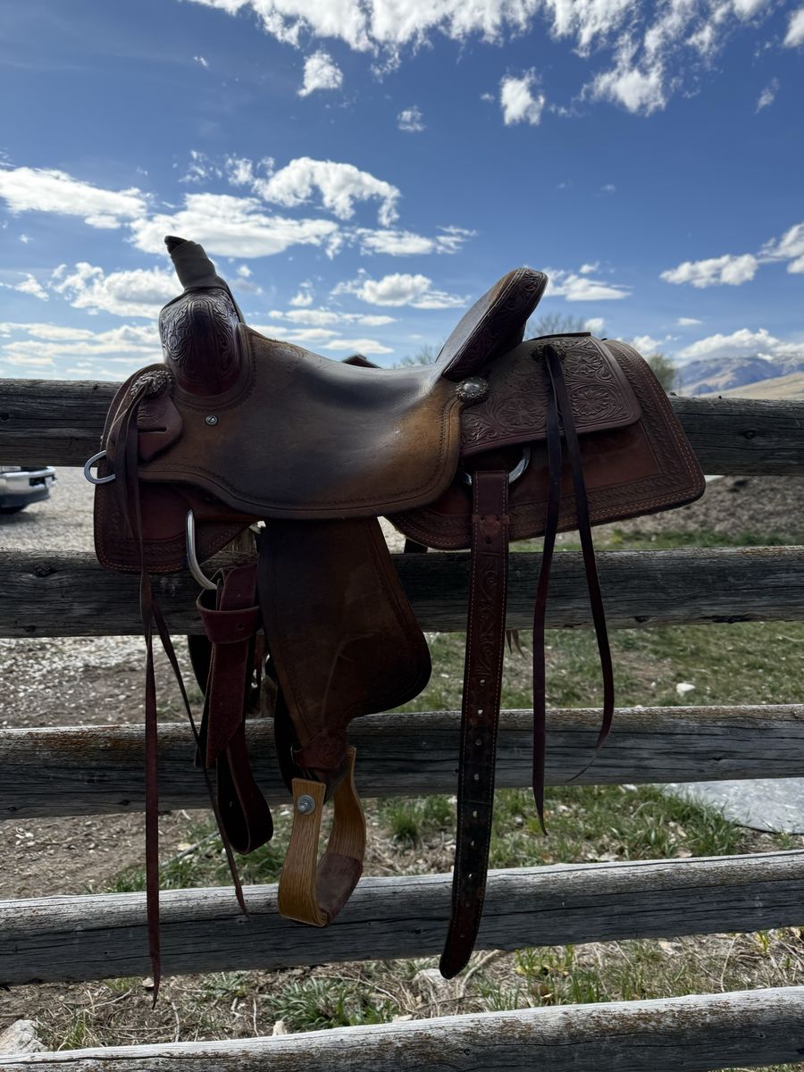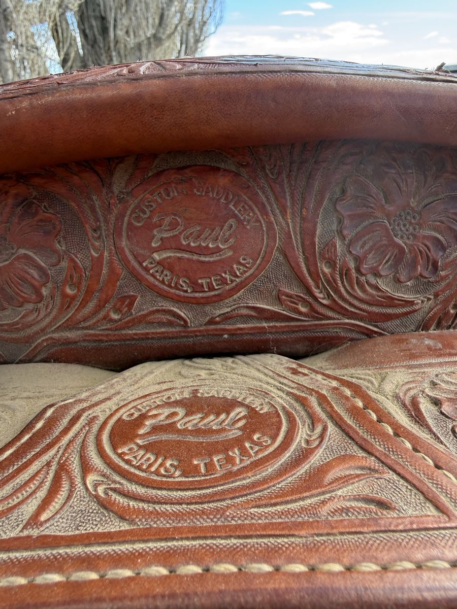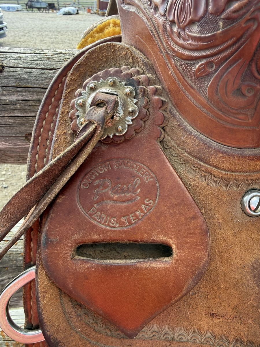 Paul cowhorse saddle for sale. It’s been a good training saddle, been roped out of a little. Fits a horse well. Seat finishes 15 1/2. Buyer pays shipping.