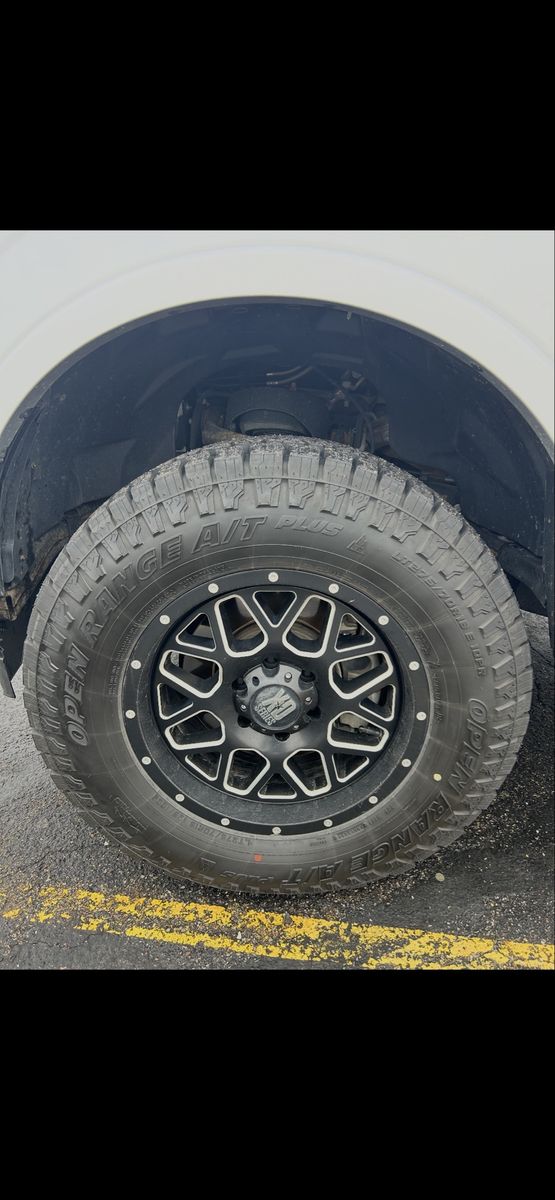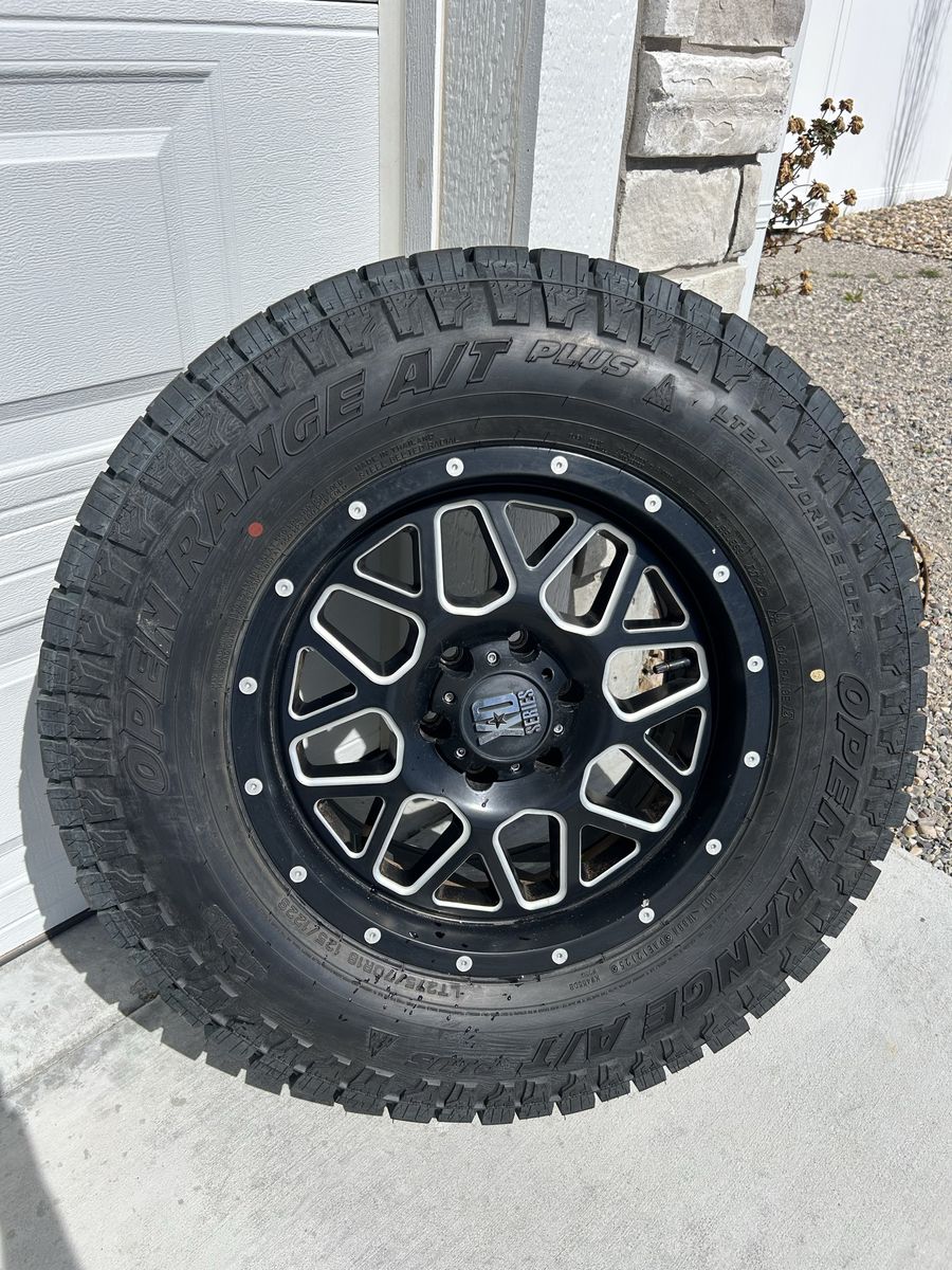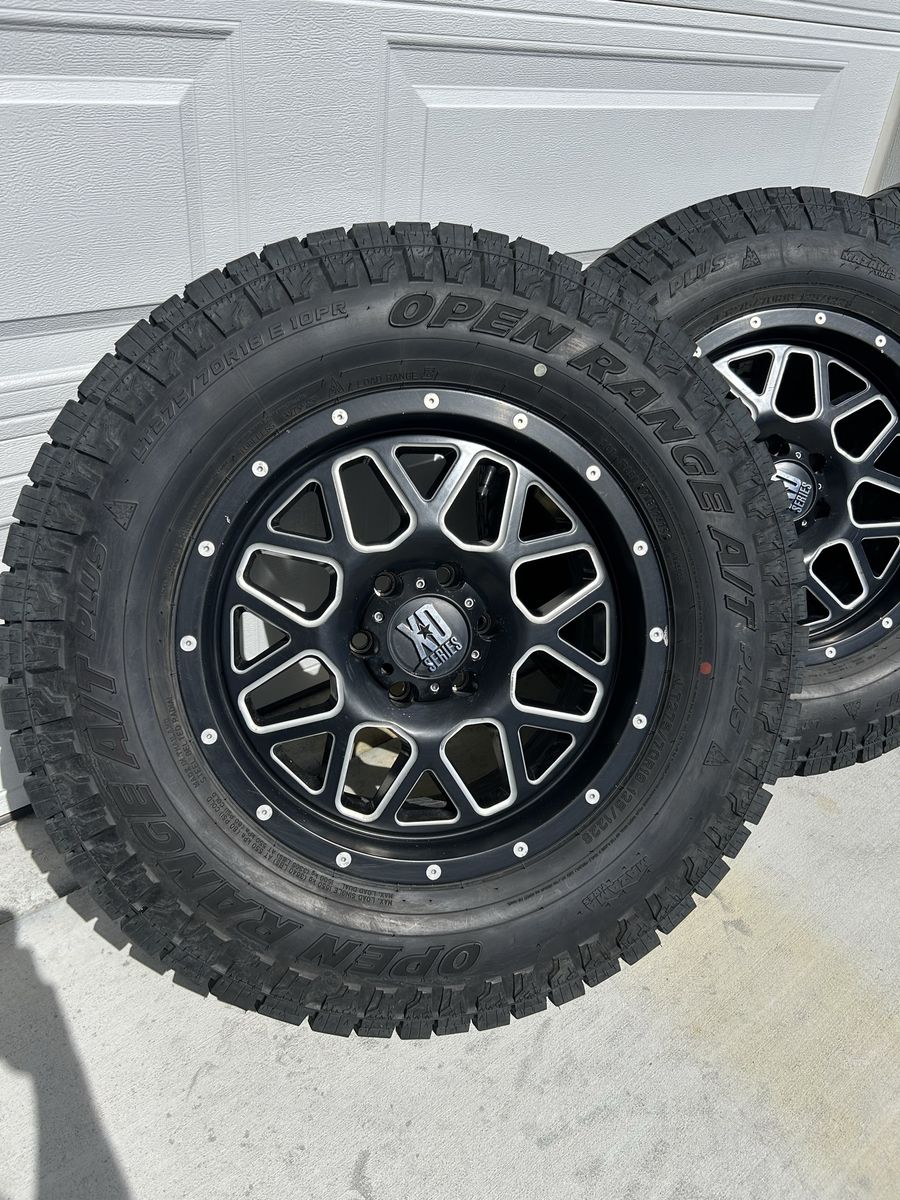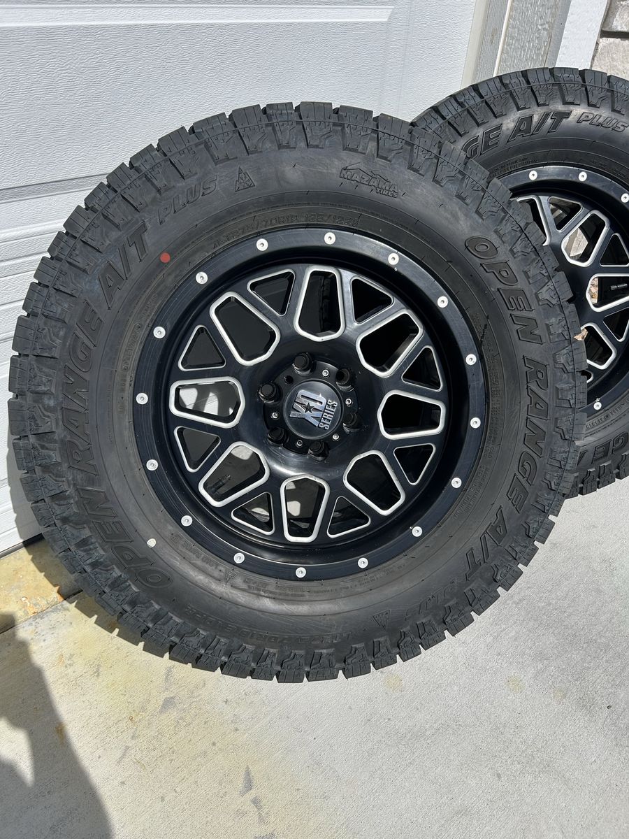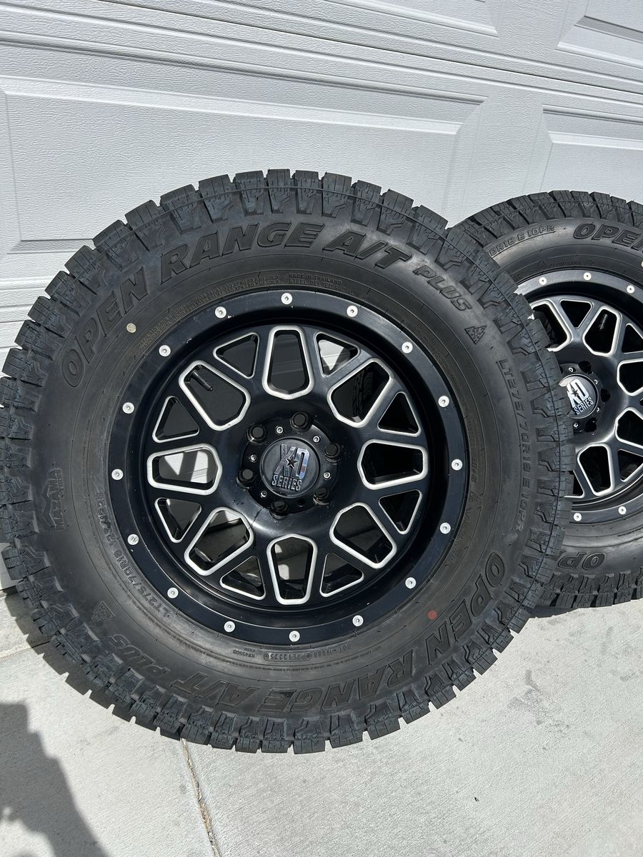 VenmoSet of 4 XD Grenade wheels. 6x135, 18x9, +18 offset (I think) with Open Range A/T Plus tires.\