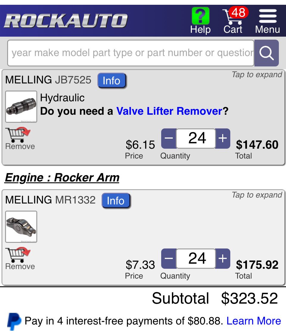 Brand new Melling rocker arms and lifters. 24 of each. Part number for the lifters: JB7525. Part number for the rocker arms: MR1332. These will fit most if not all of the Chrysler, Dodge, Jeep, Ram 3.6 Liter V6 Pentastar engine. Check your application to make sure these will fit. Asking $250 for all.
