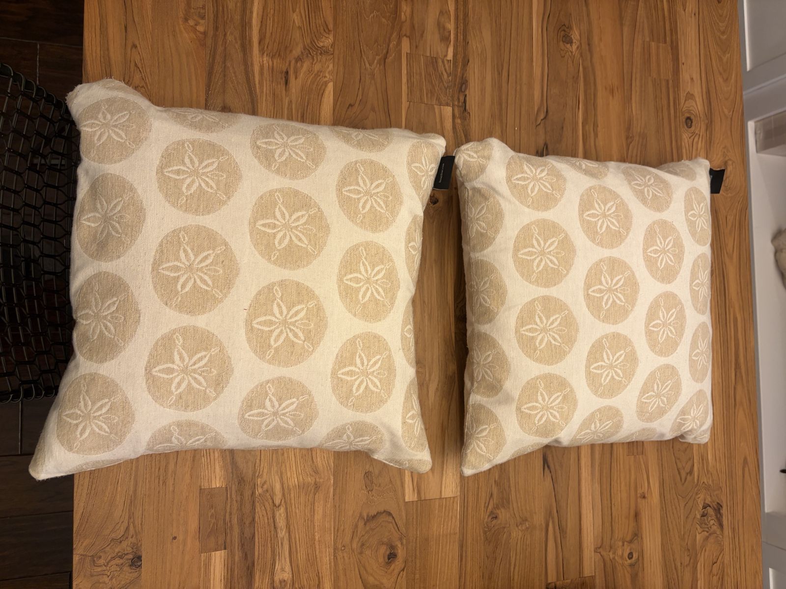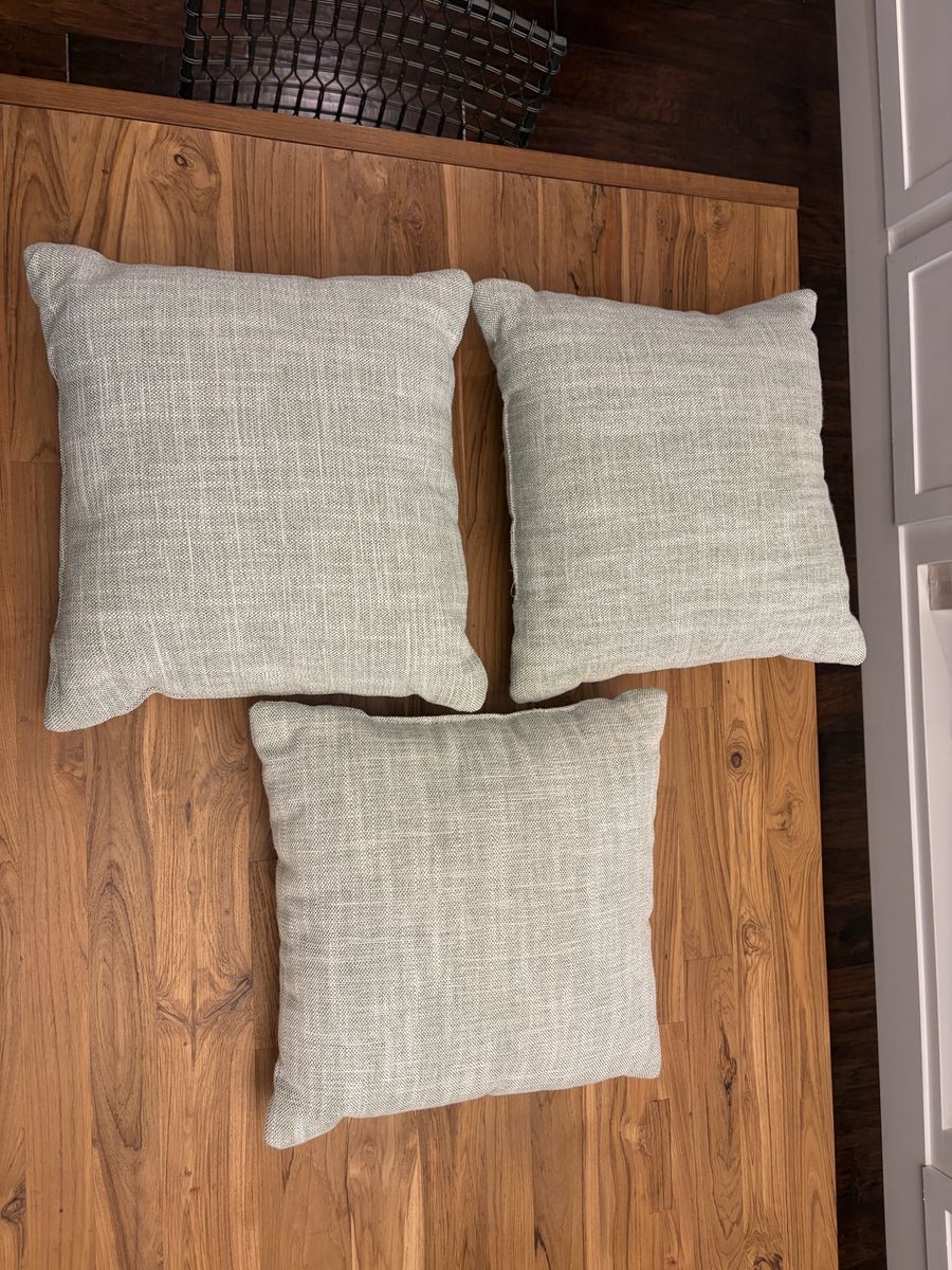 ZelleThree light sage green and two beige with sand dollars on them. All are indoor outdoor and in like new condition.