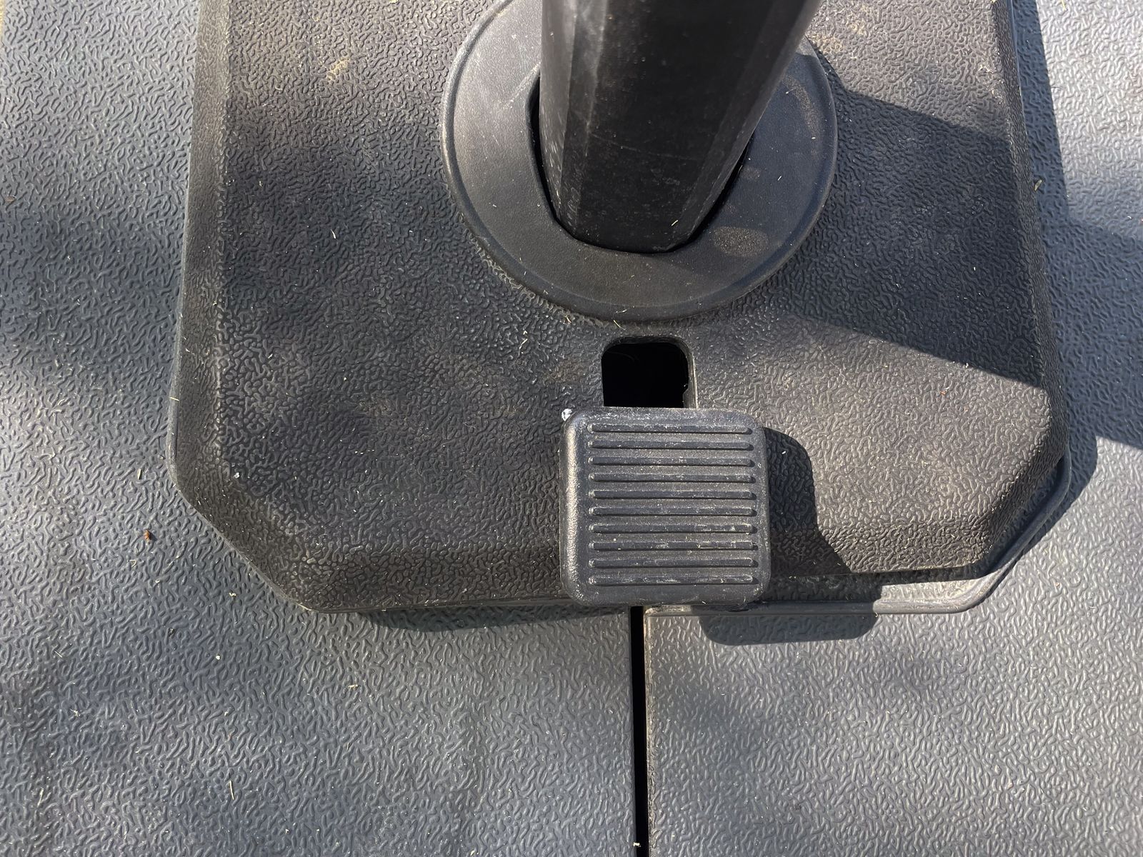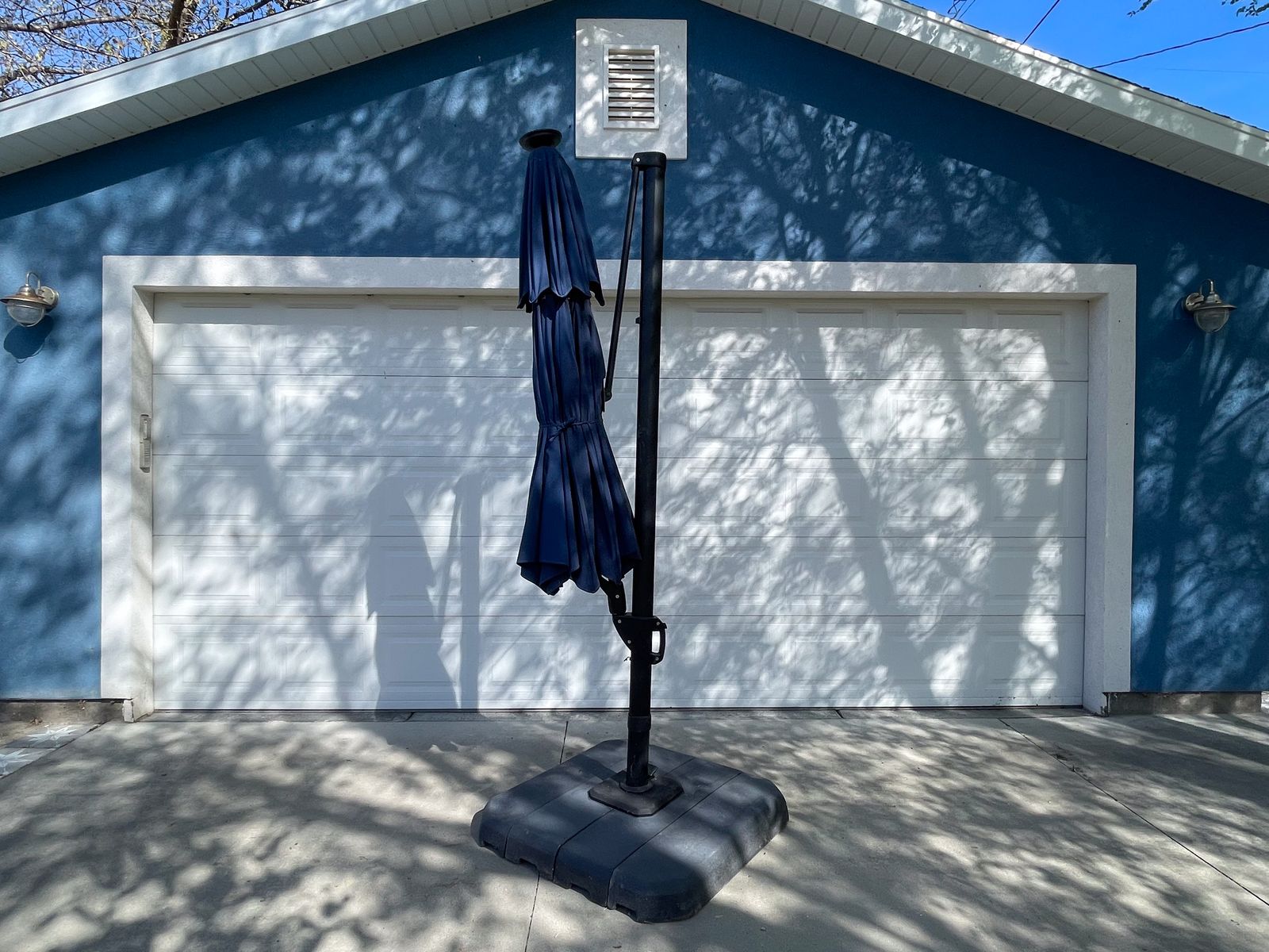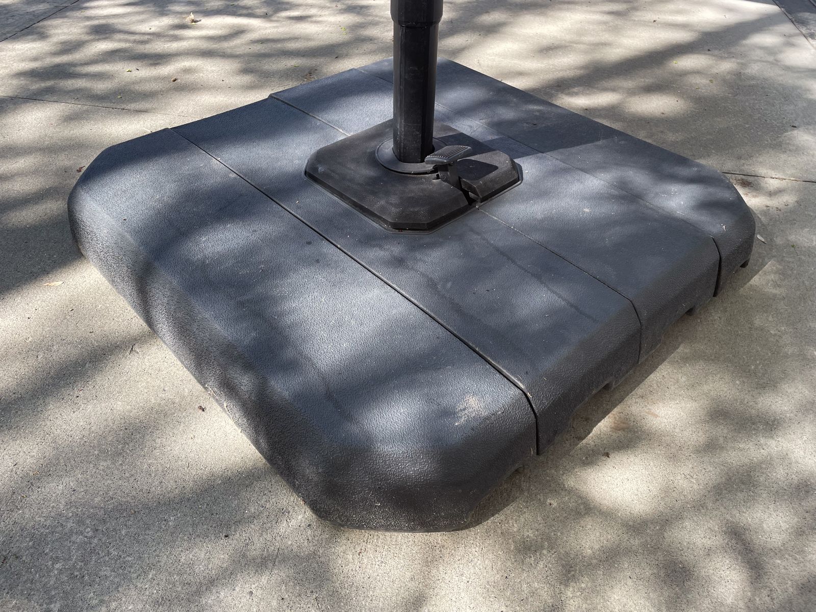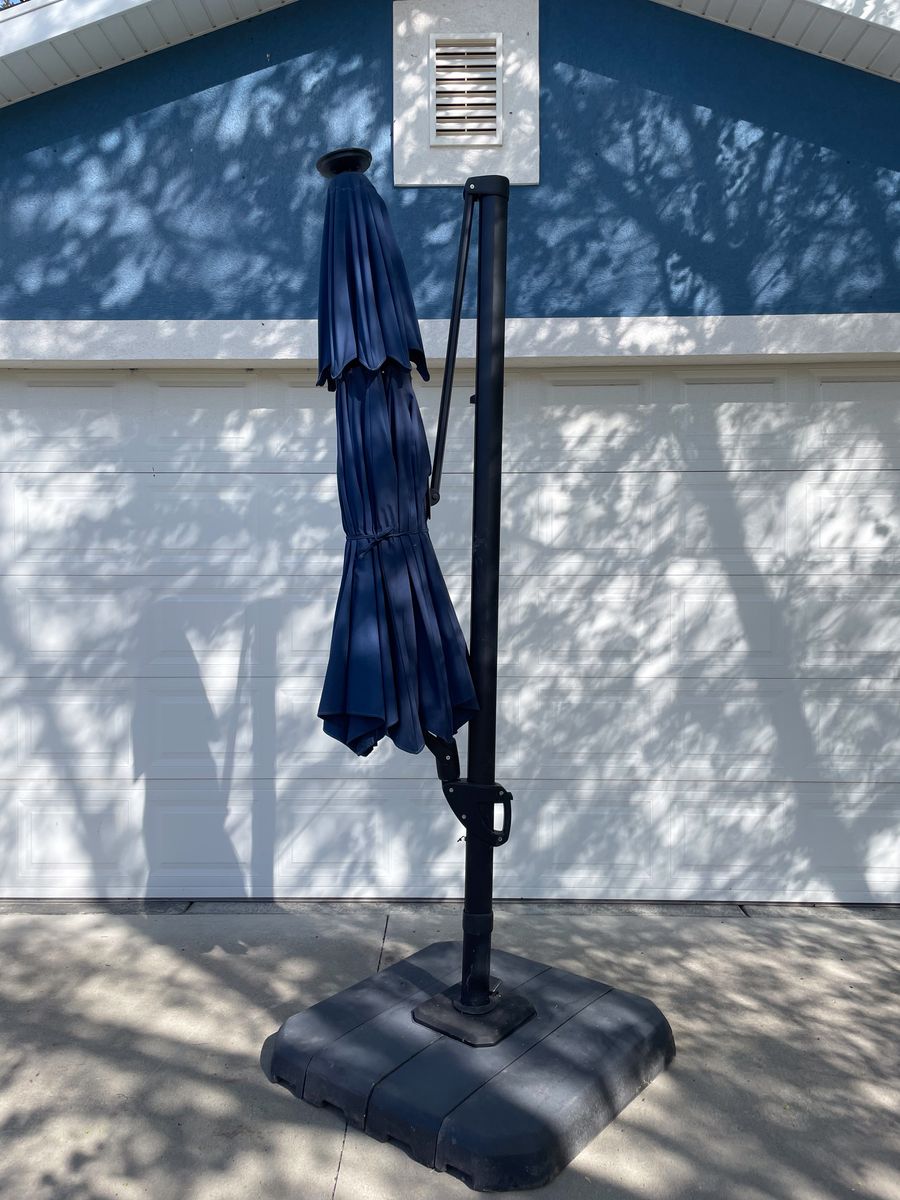 VenmoThis patio umbrella is a dream come true! It's huge. The stand is about 8ft tall and the umbrella is about 10ft wide. Despite it's size it is easy to position and pop open the umbrella and close it for when it is not in use. There is a pedal at the bottom for easy pivoting and the handle on the main post move the umbrella out with easy. There are four tanks you can fill with water to keep it in place and we've never had the wind knock it over. It is hard to see in the photos but there is a small solar panel at the top of the umbrella that powers the lights underneath.