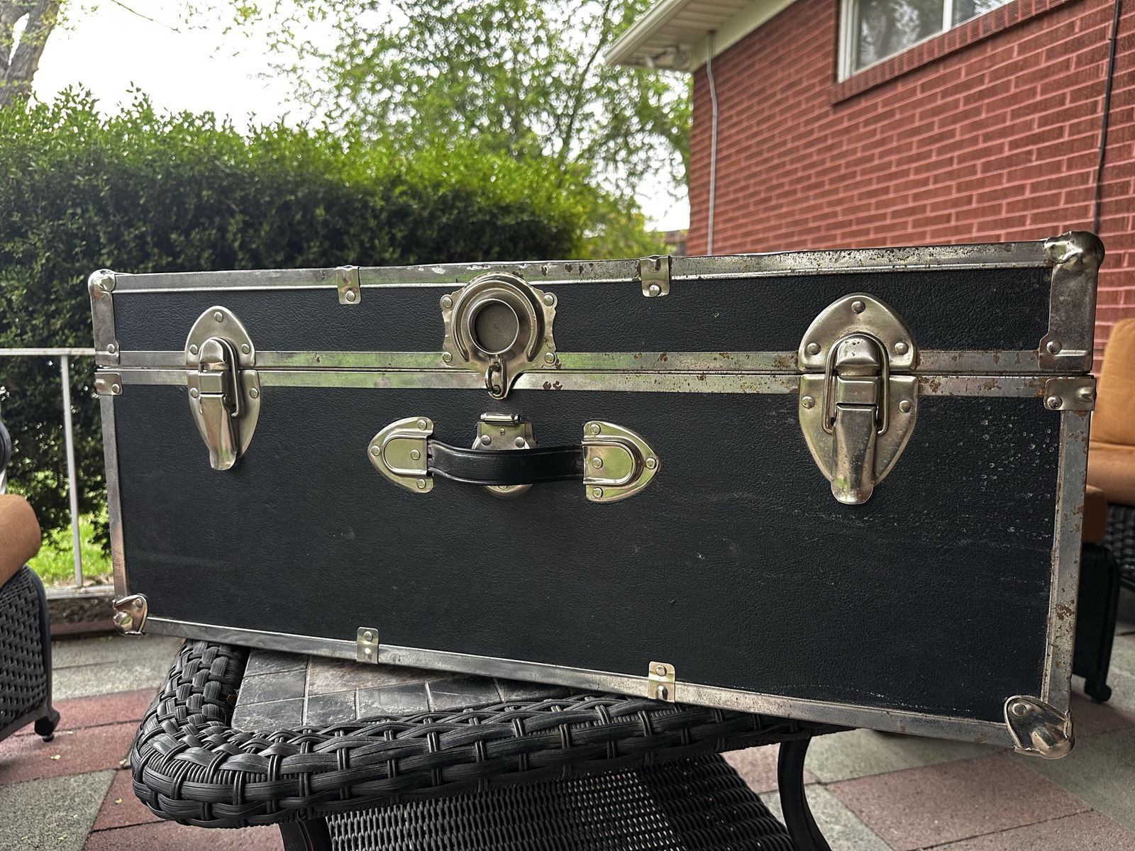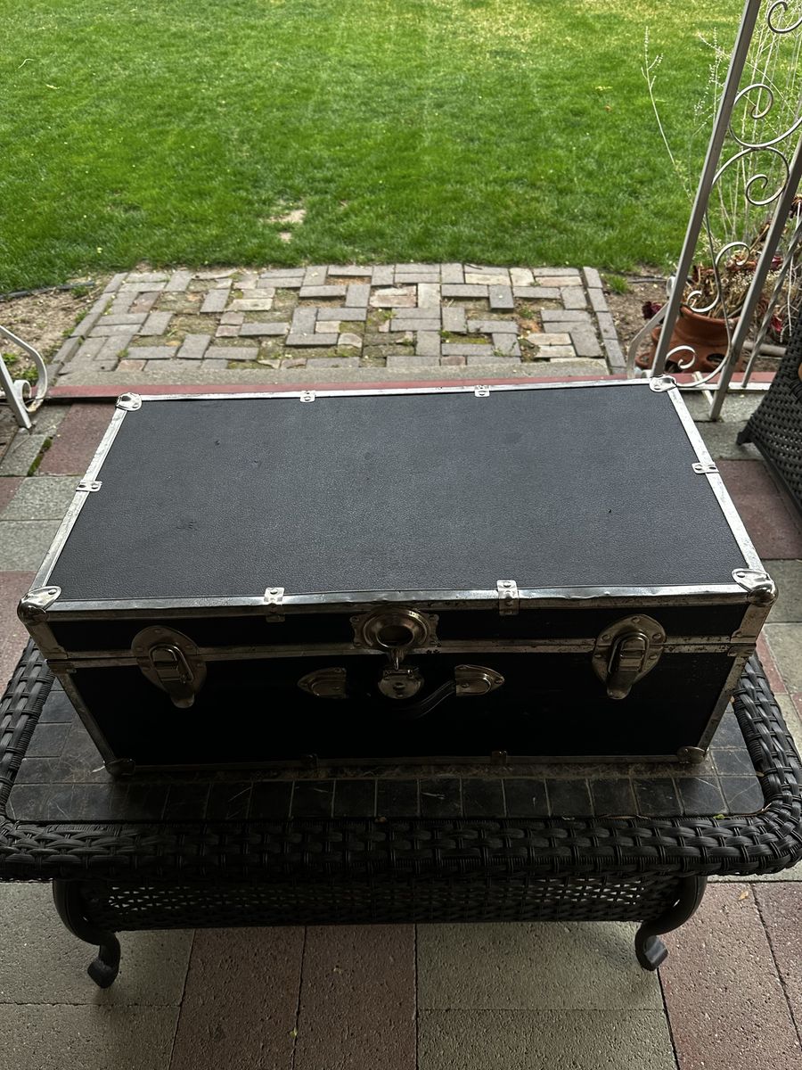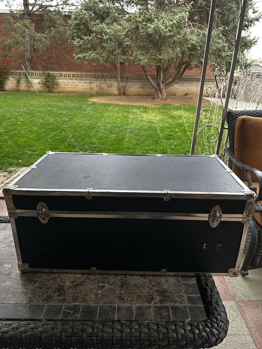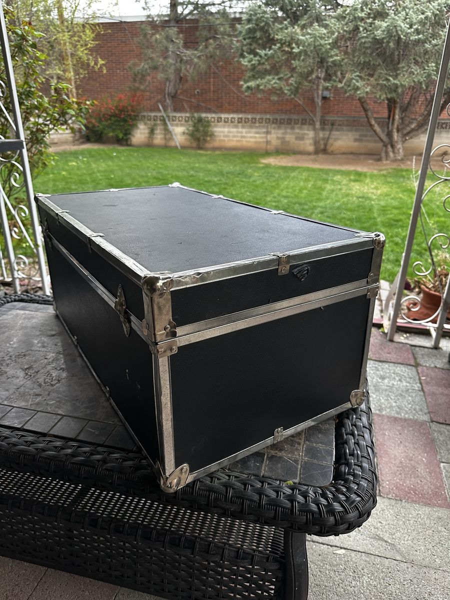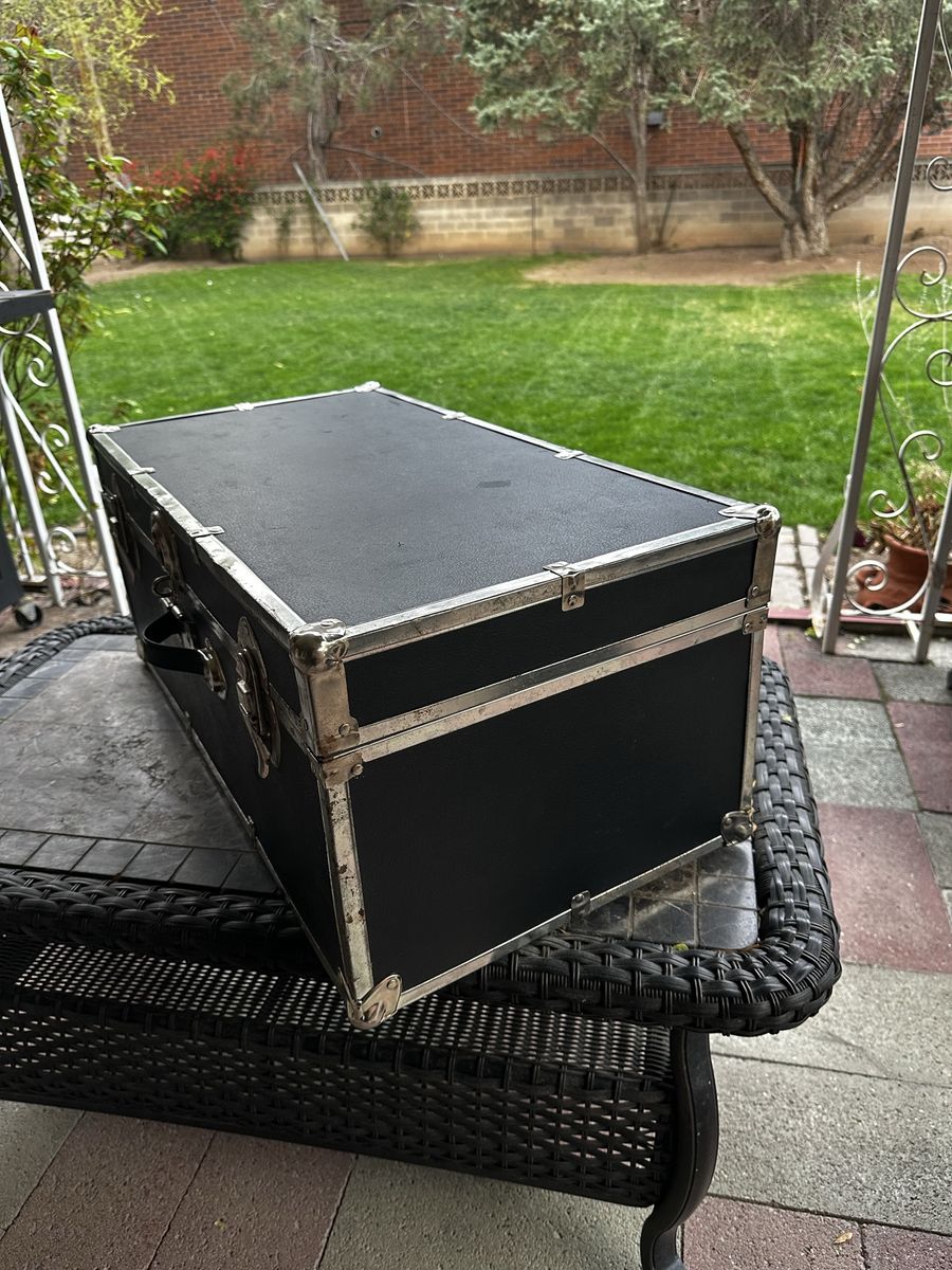 VenmoDecorative storage trunk with metal trim and black textured exterior.