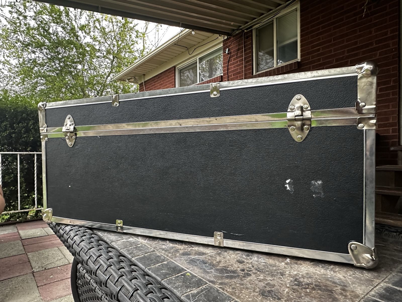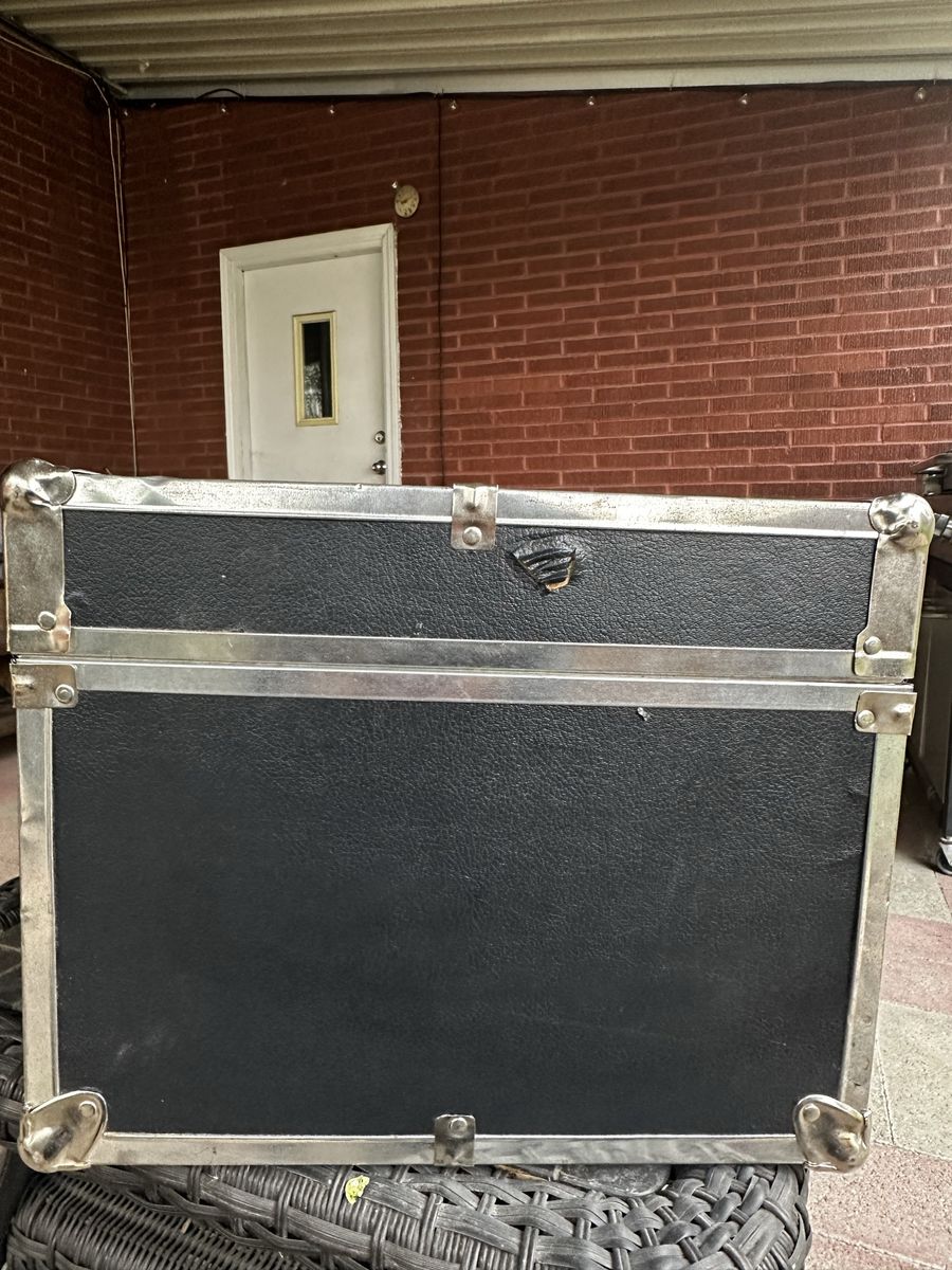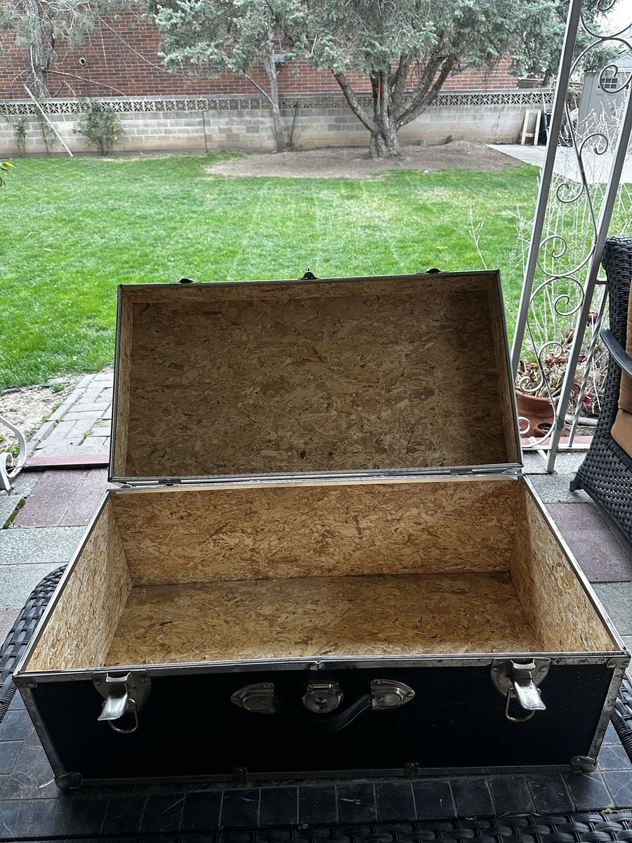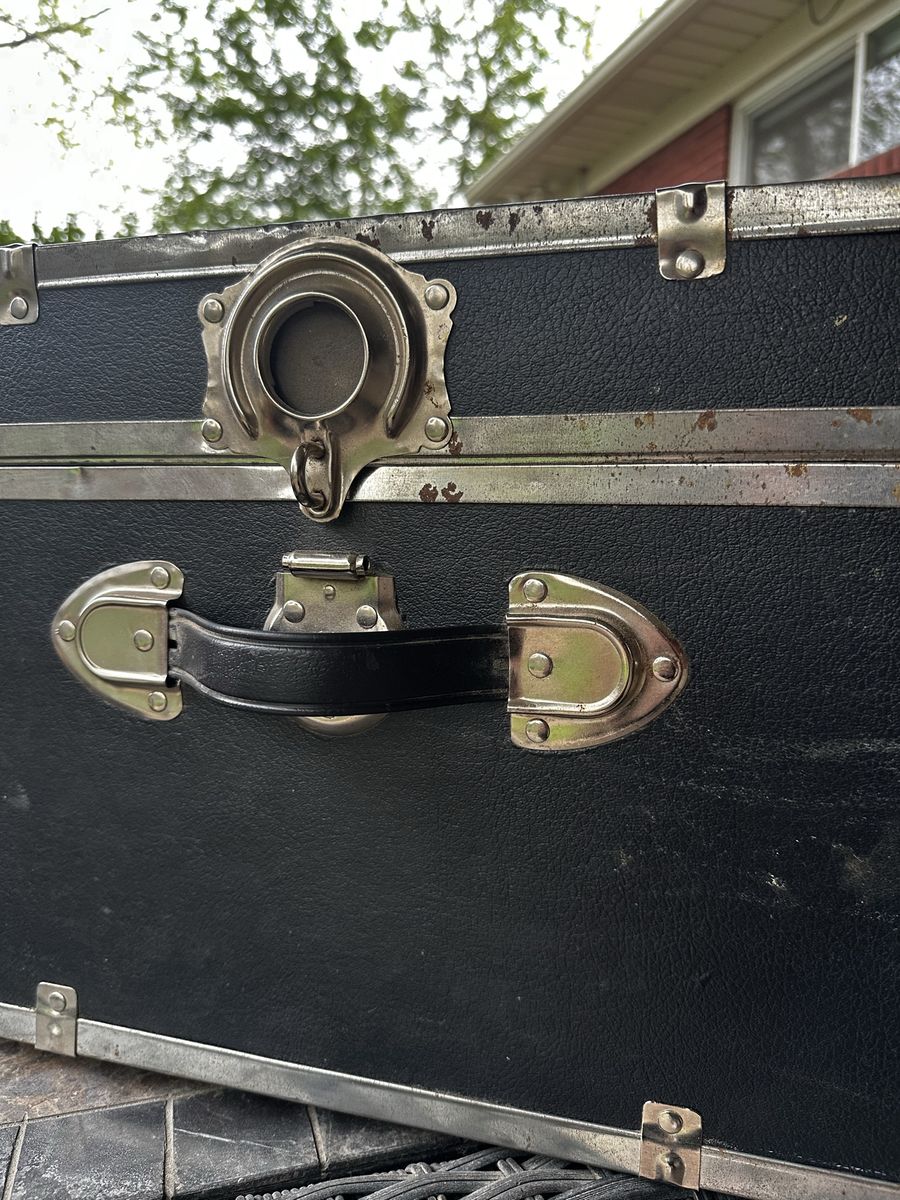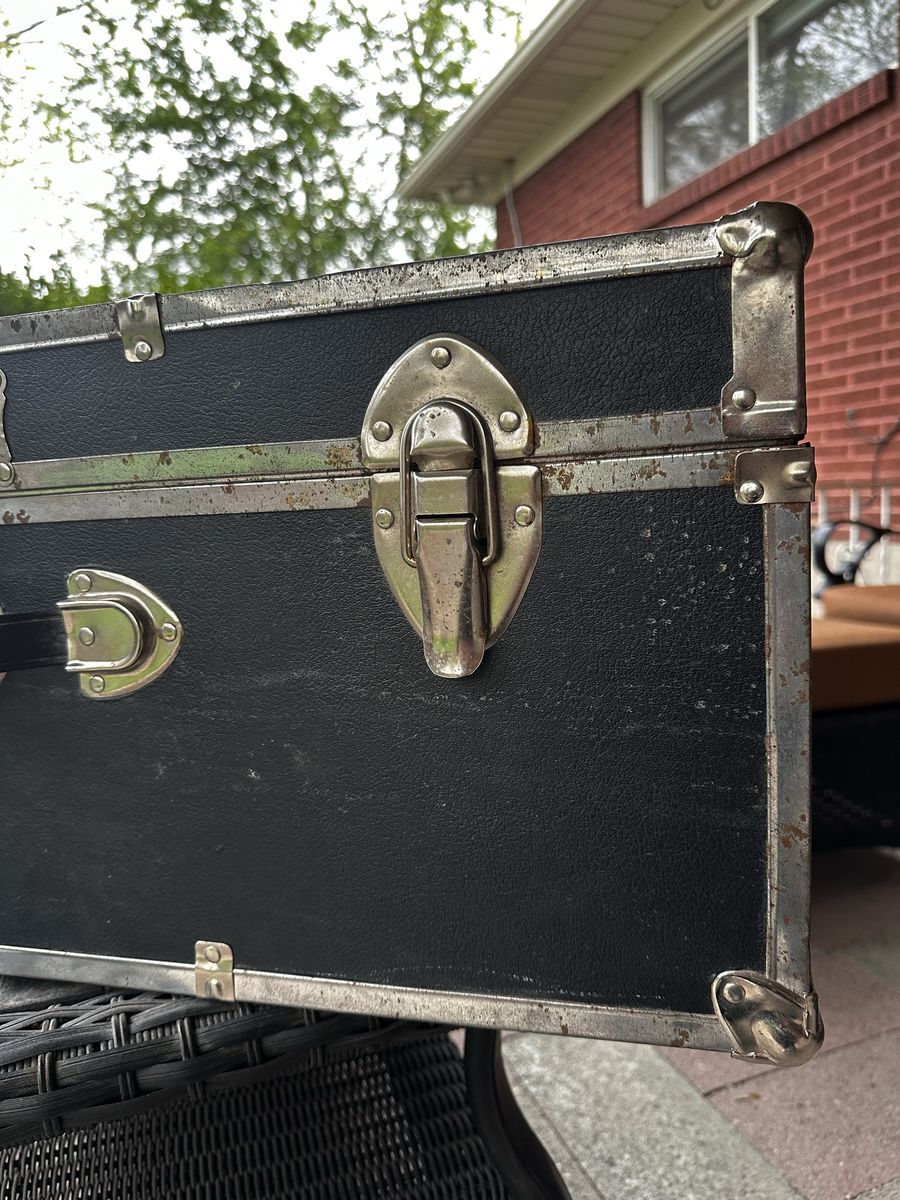 VenmoDecorative storage trunk with metal trim and black textured exterior.